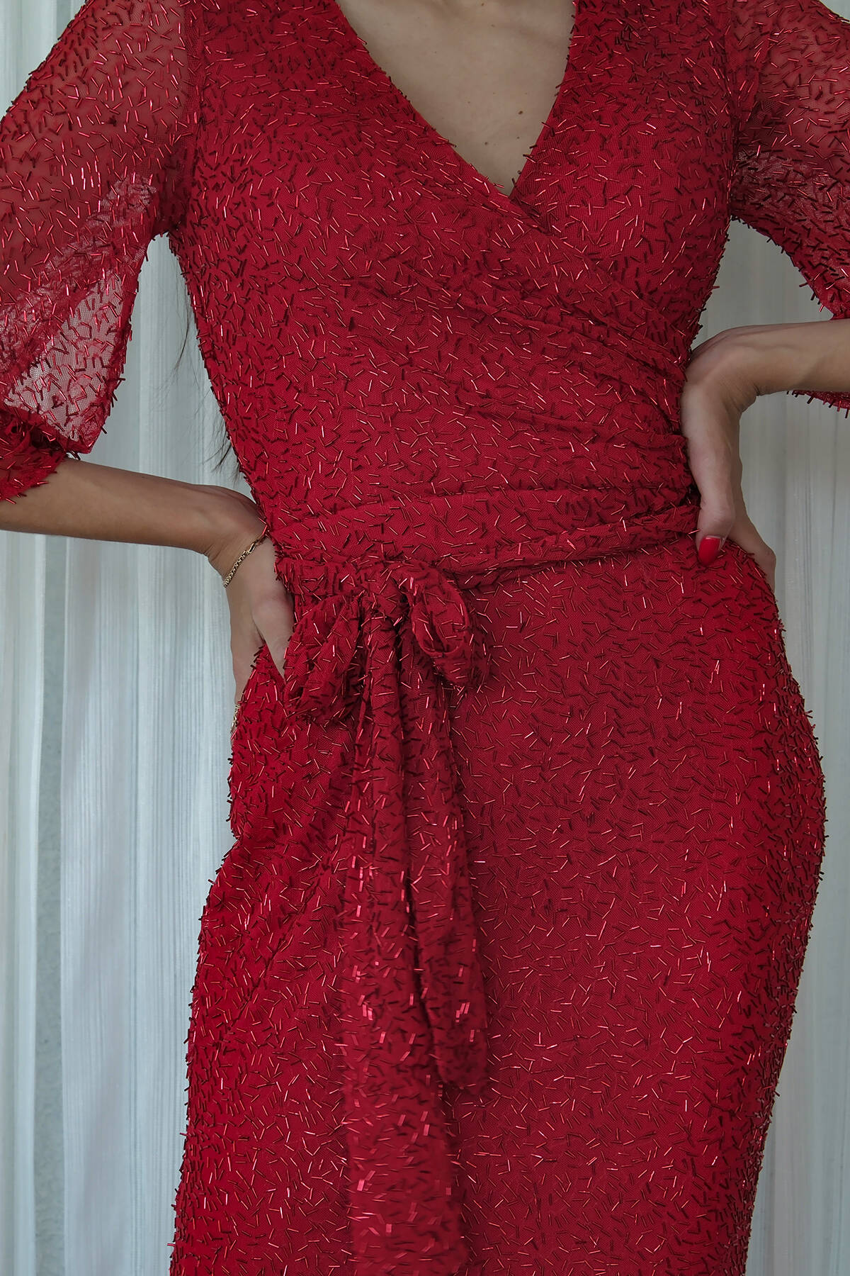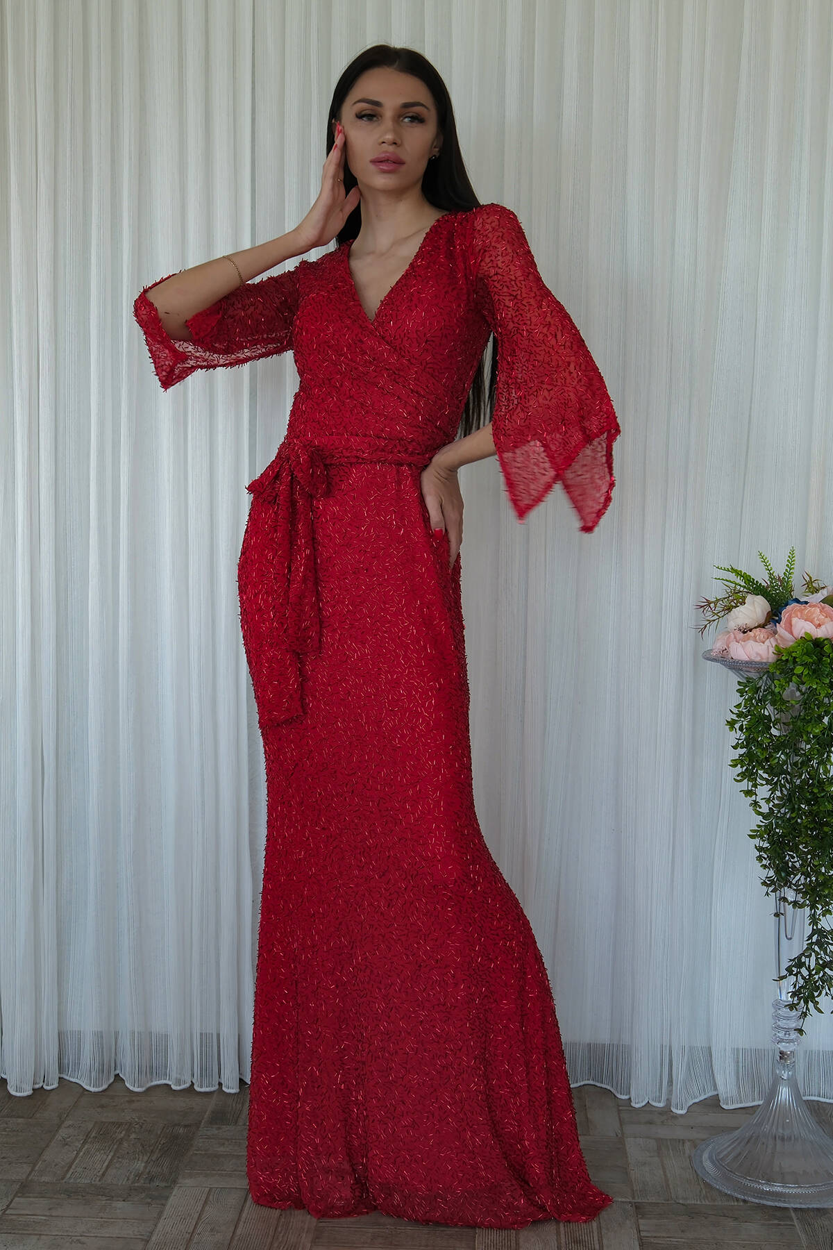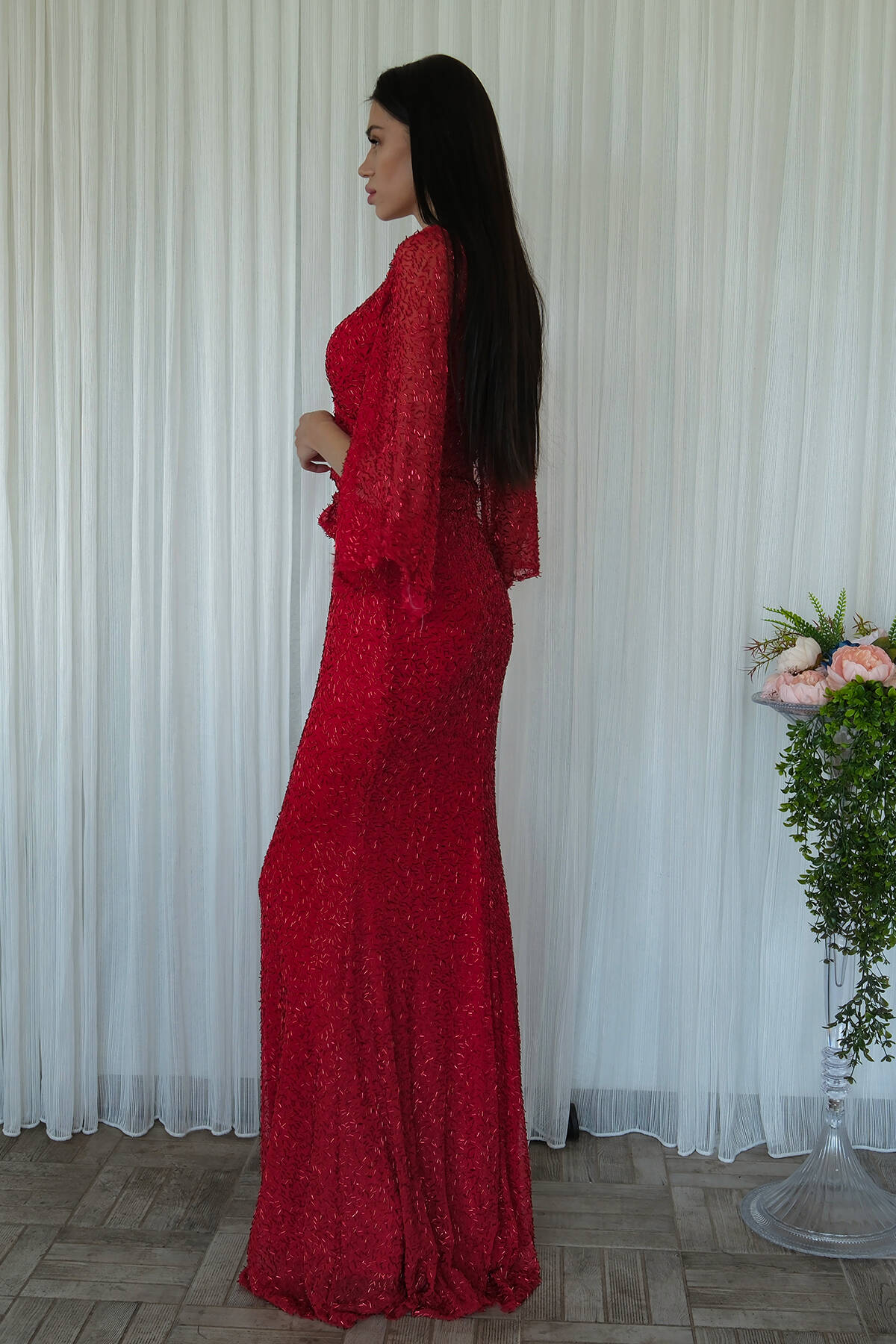 Kırmızı V Yaka Pul Payetli Uzun Kol Abiye 1106014.08