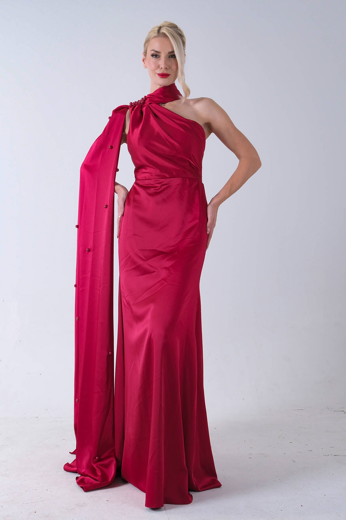 Kırmızı Yaka Kuşak Detaylı Tek Omuz Abiye 0801099.08