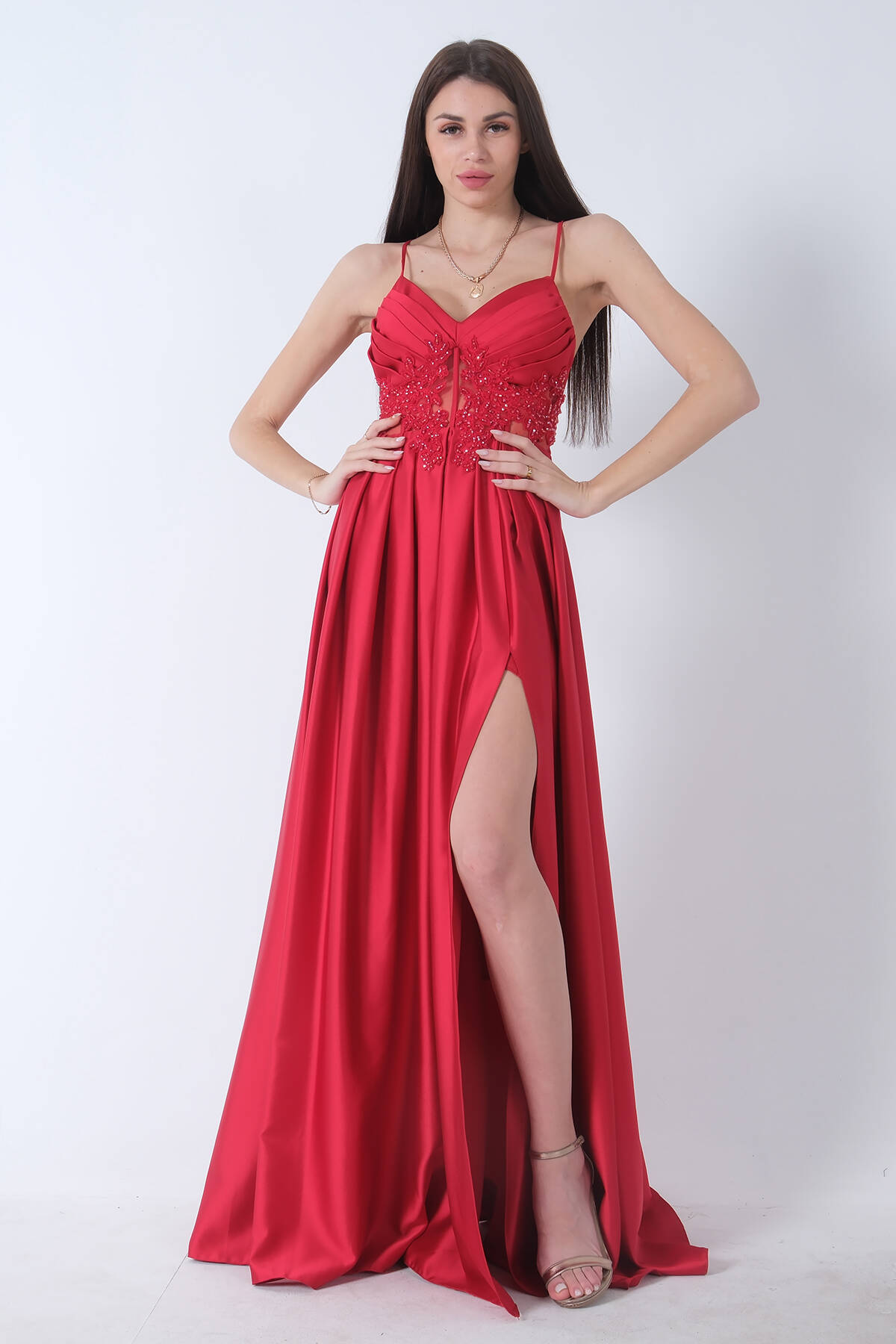 Kırmızı Yırtma Detaylı İp Askılı Saten Abiye Elbise 9704981.08