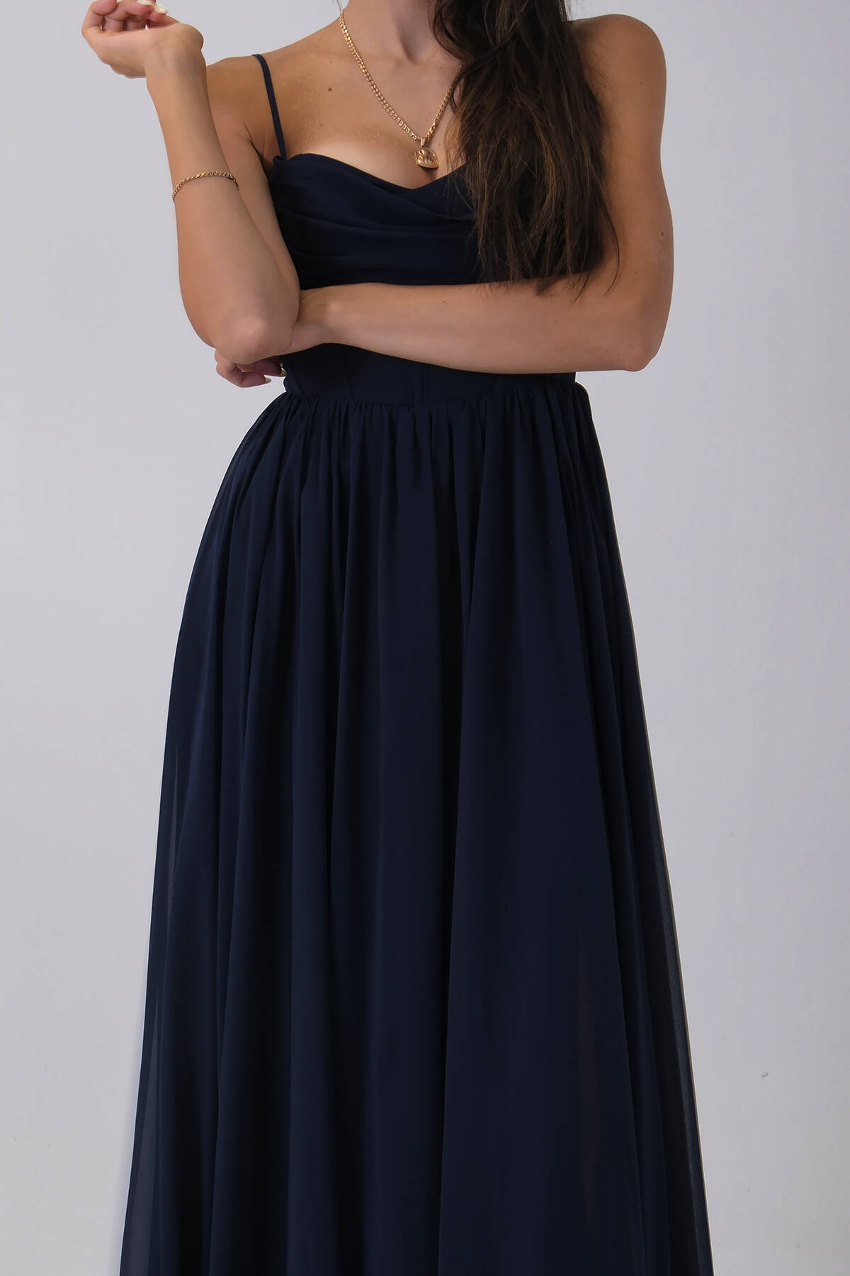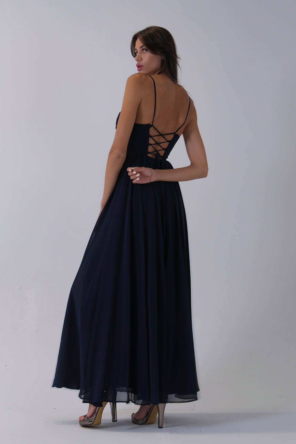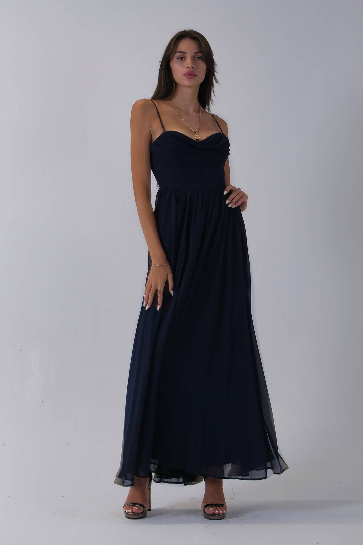 Lacivert Askılı Drapeli Uzun Şifon Abiye 08020032.02