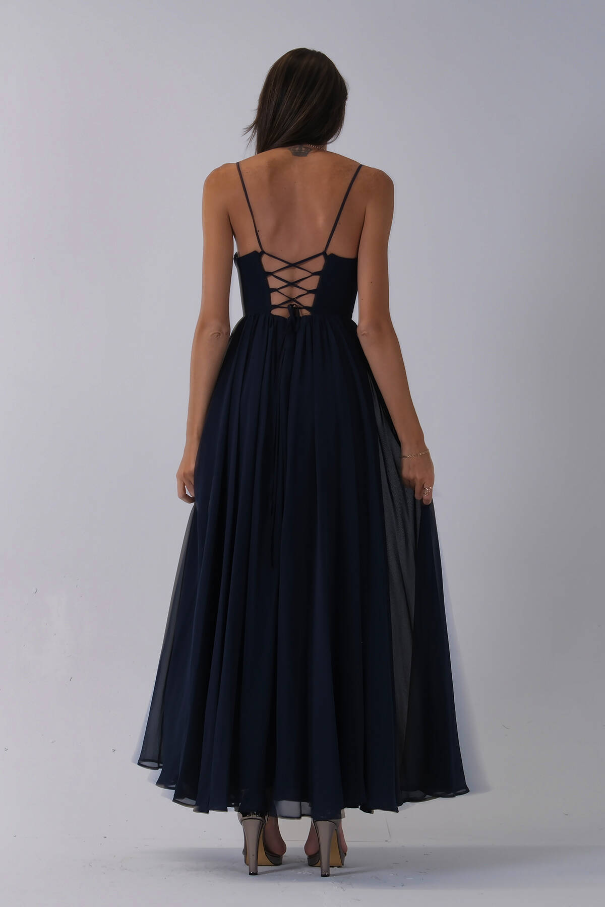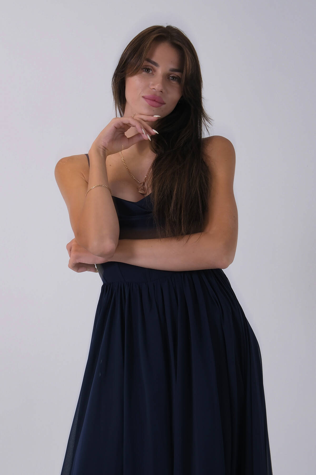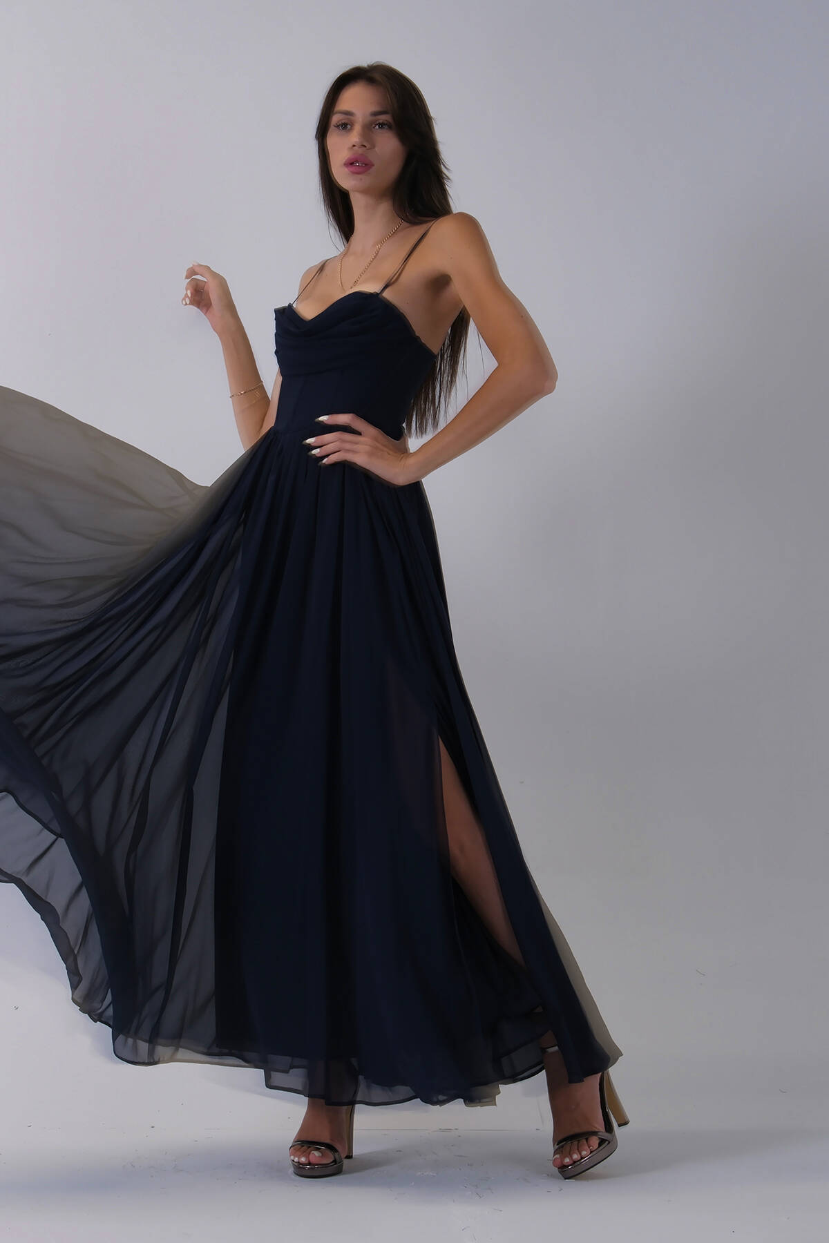 Lacivert Askılı Drapeli Uzun Şifon Abiye 08020032.02