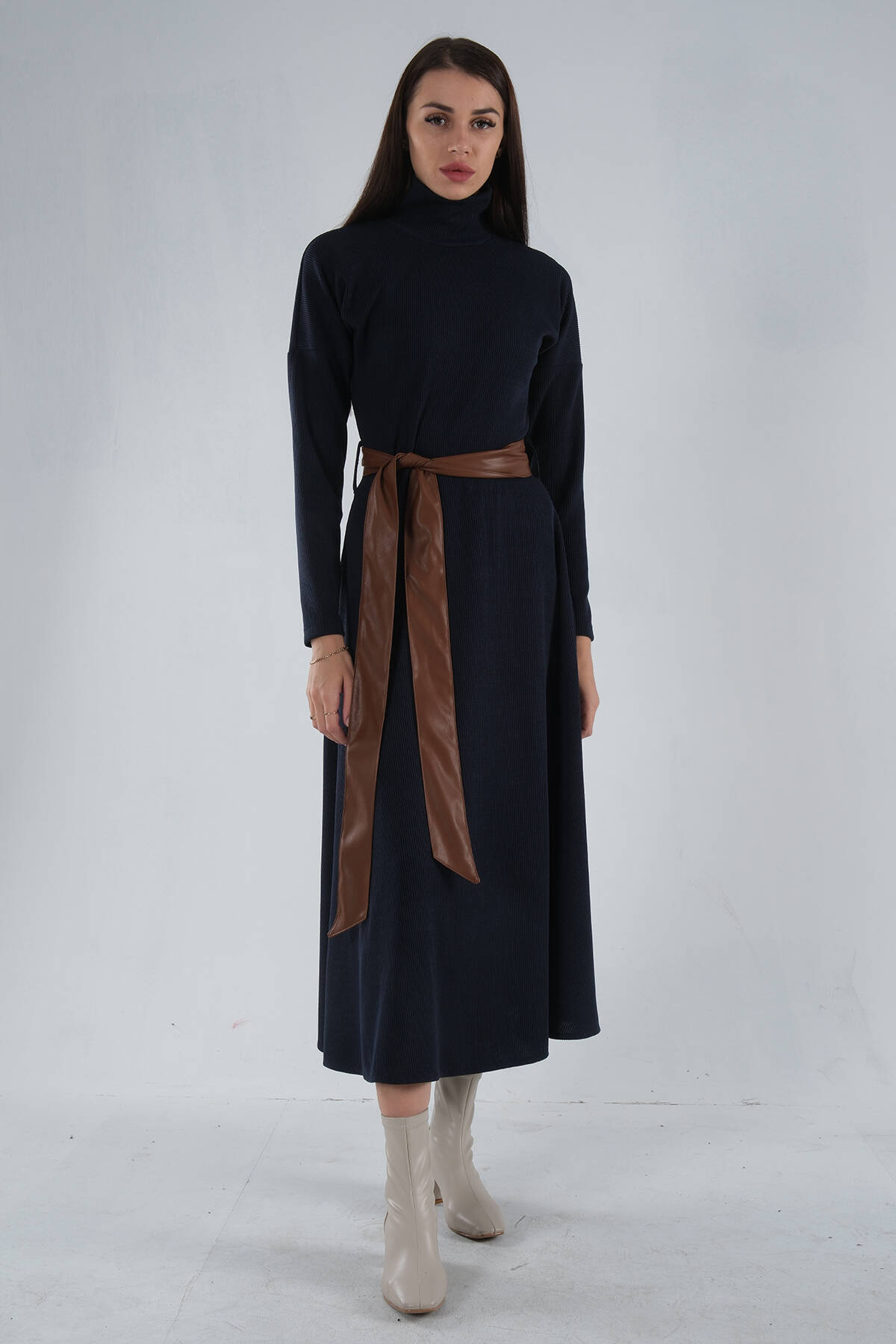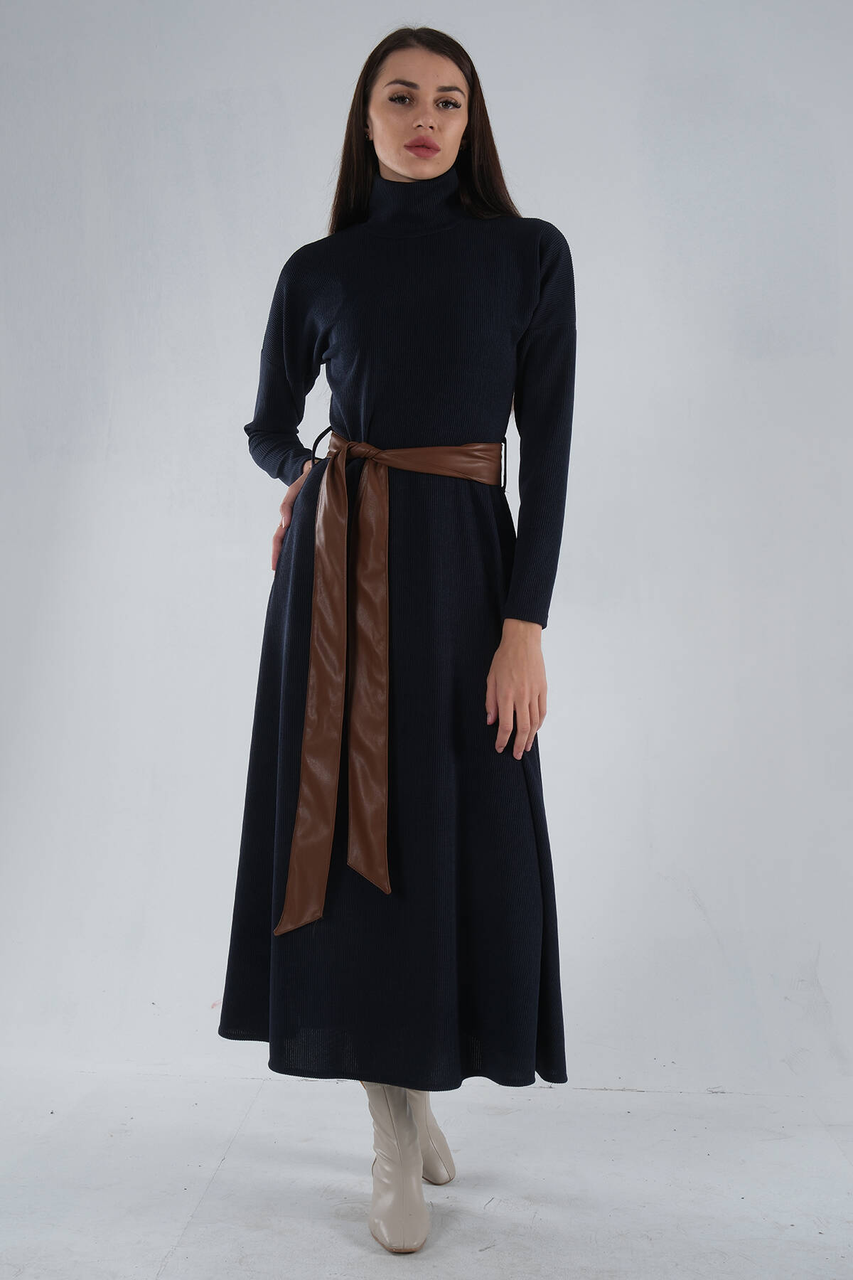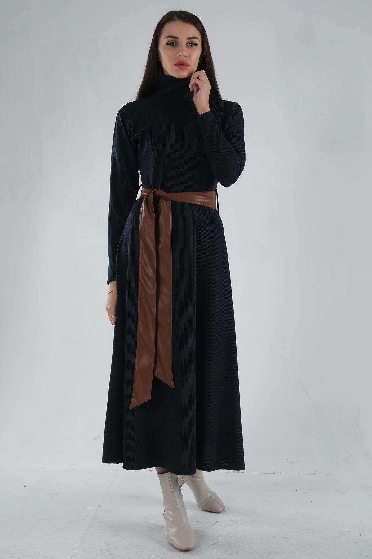 Lacivert Beli Kemerli Örme Elbise 0104030.02