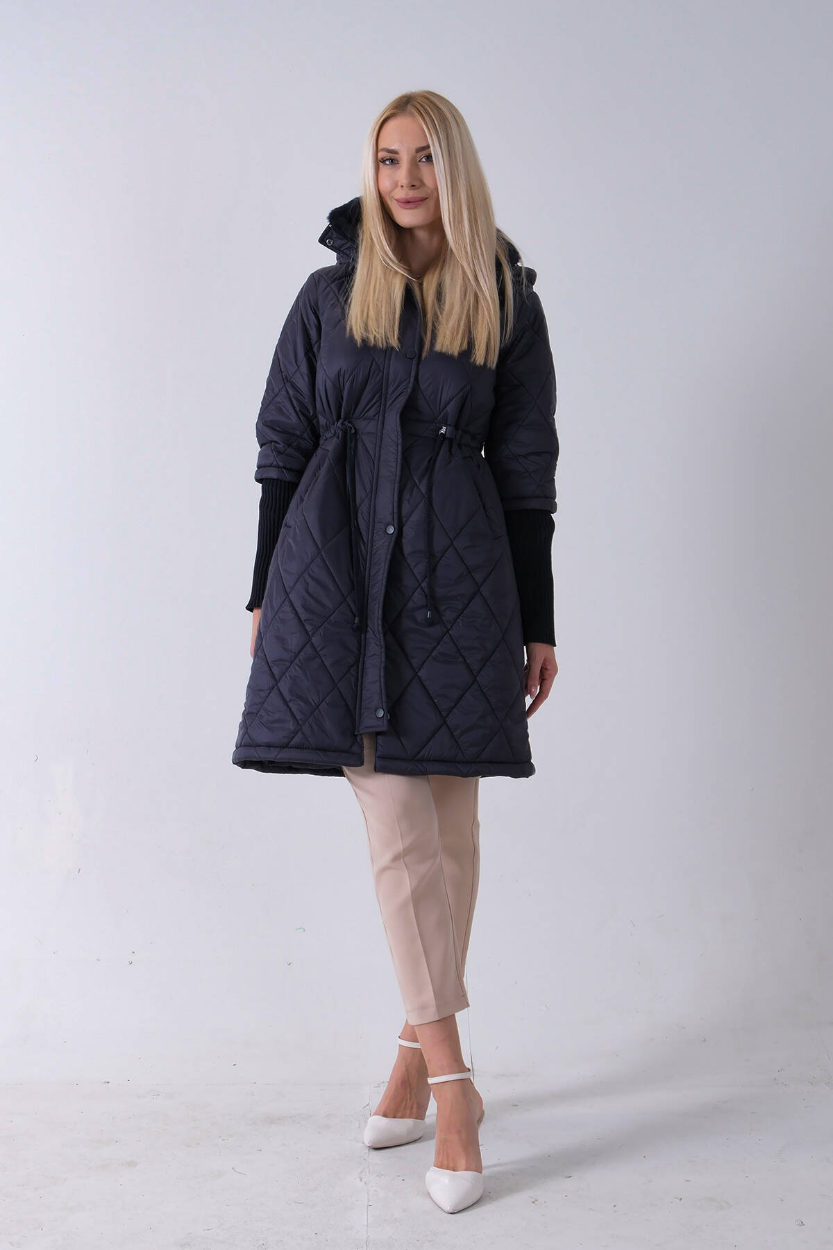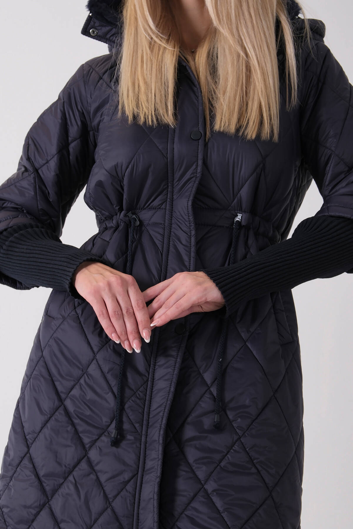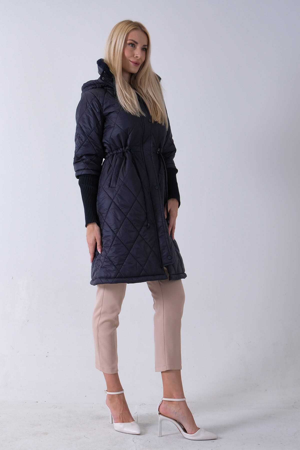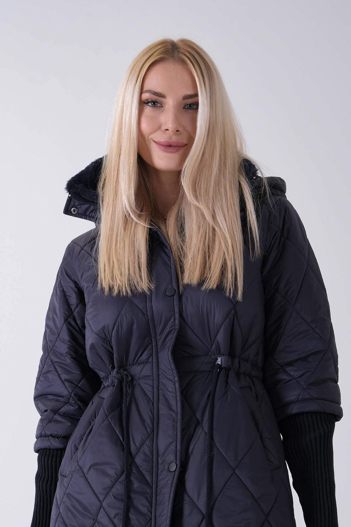 Lacivert Bileği Lastikli Kapüşonlu Baklava Desenli Şişme Mont 44520207.02