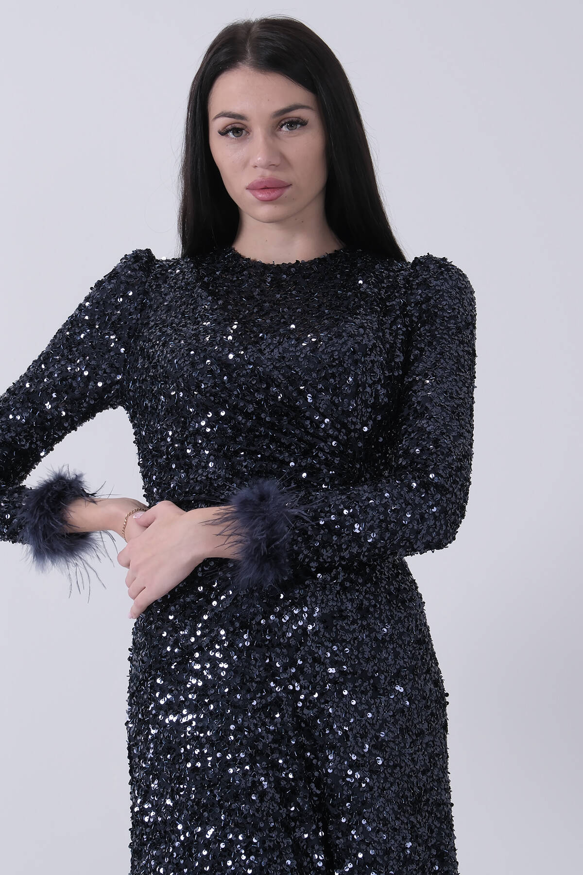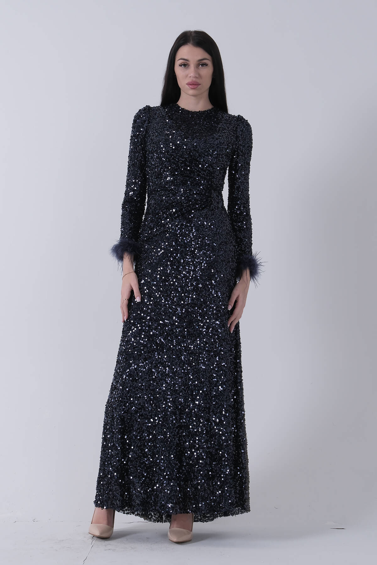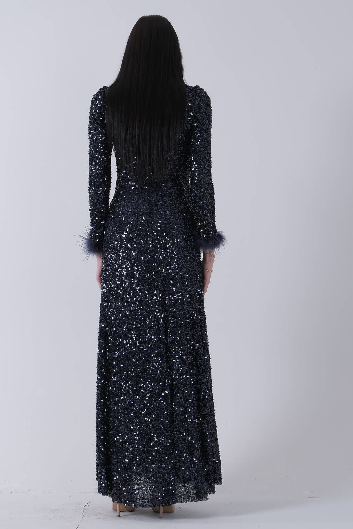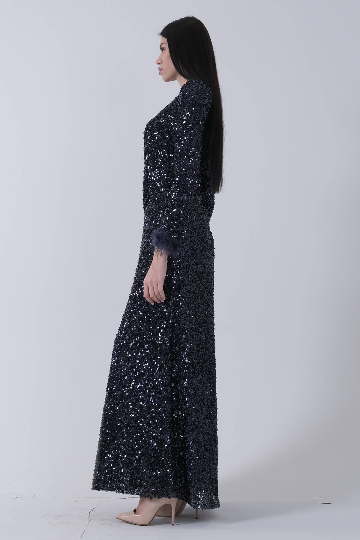 Lacivert Bilek Ucu Tüylü Pul Payetli Tesettür Abiye 6502496.02