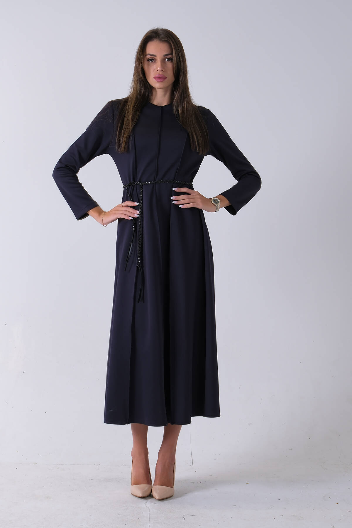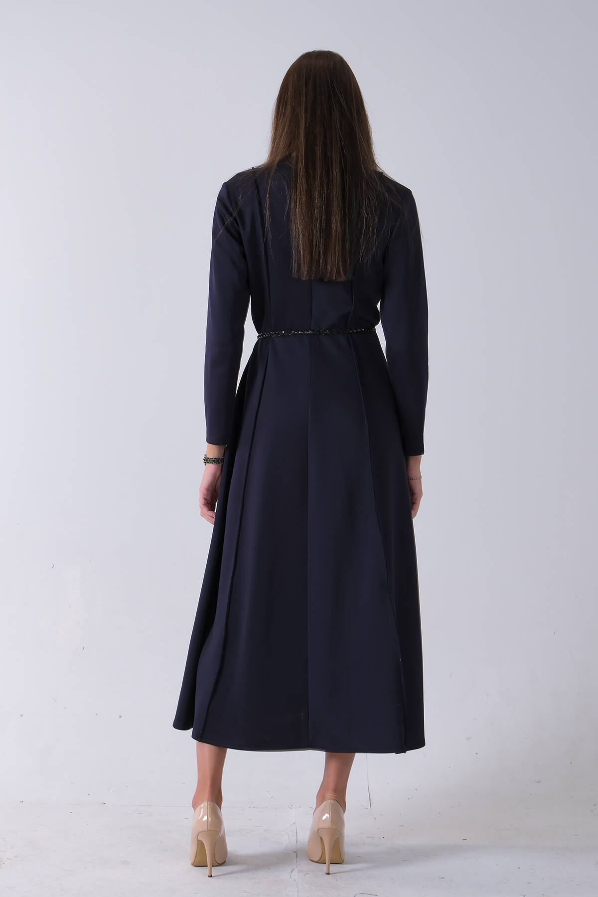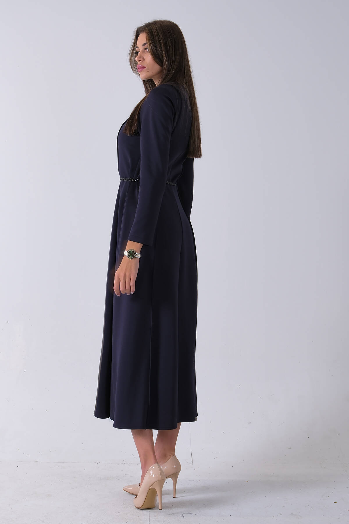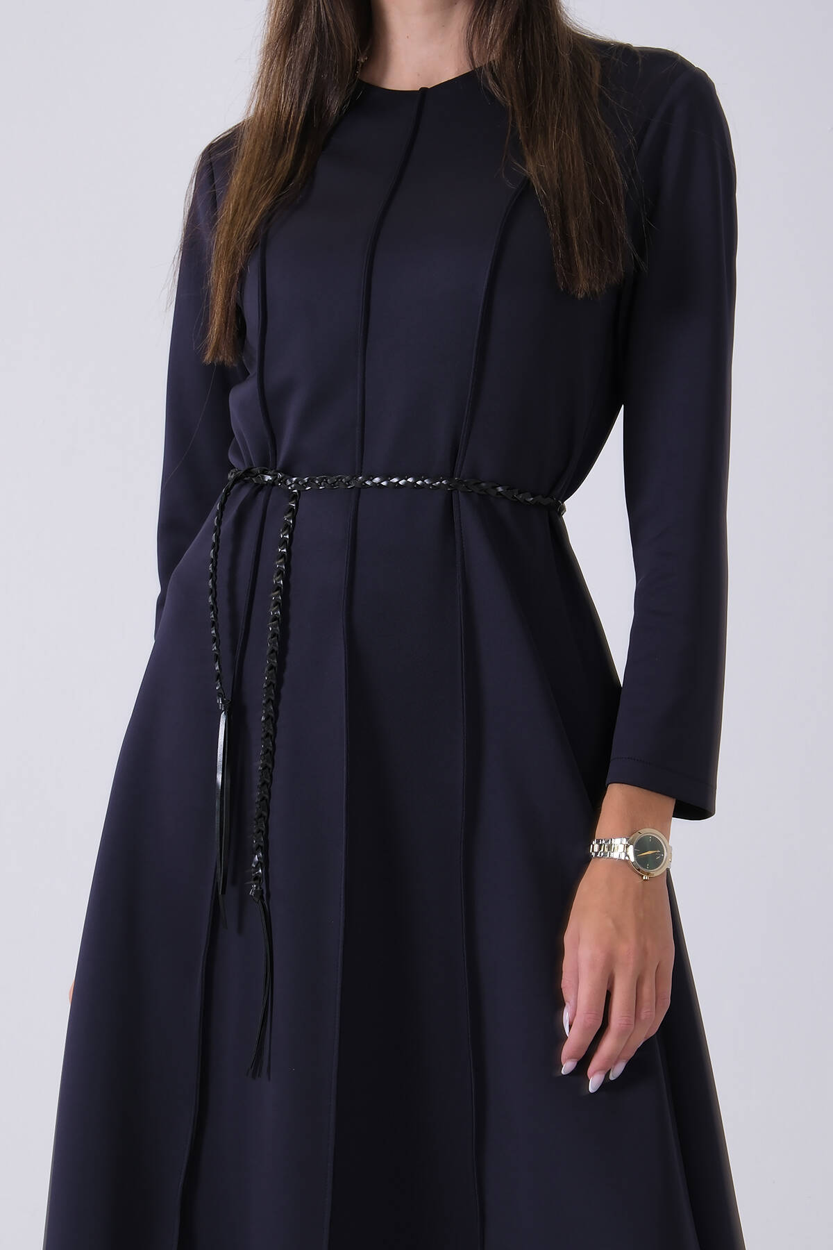 Lacivert Bisiklet Yaka Önü Pile Detaylı Beli Kemerli Elbise 4593453.02