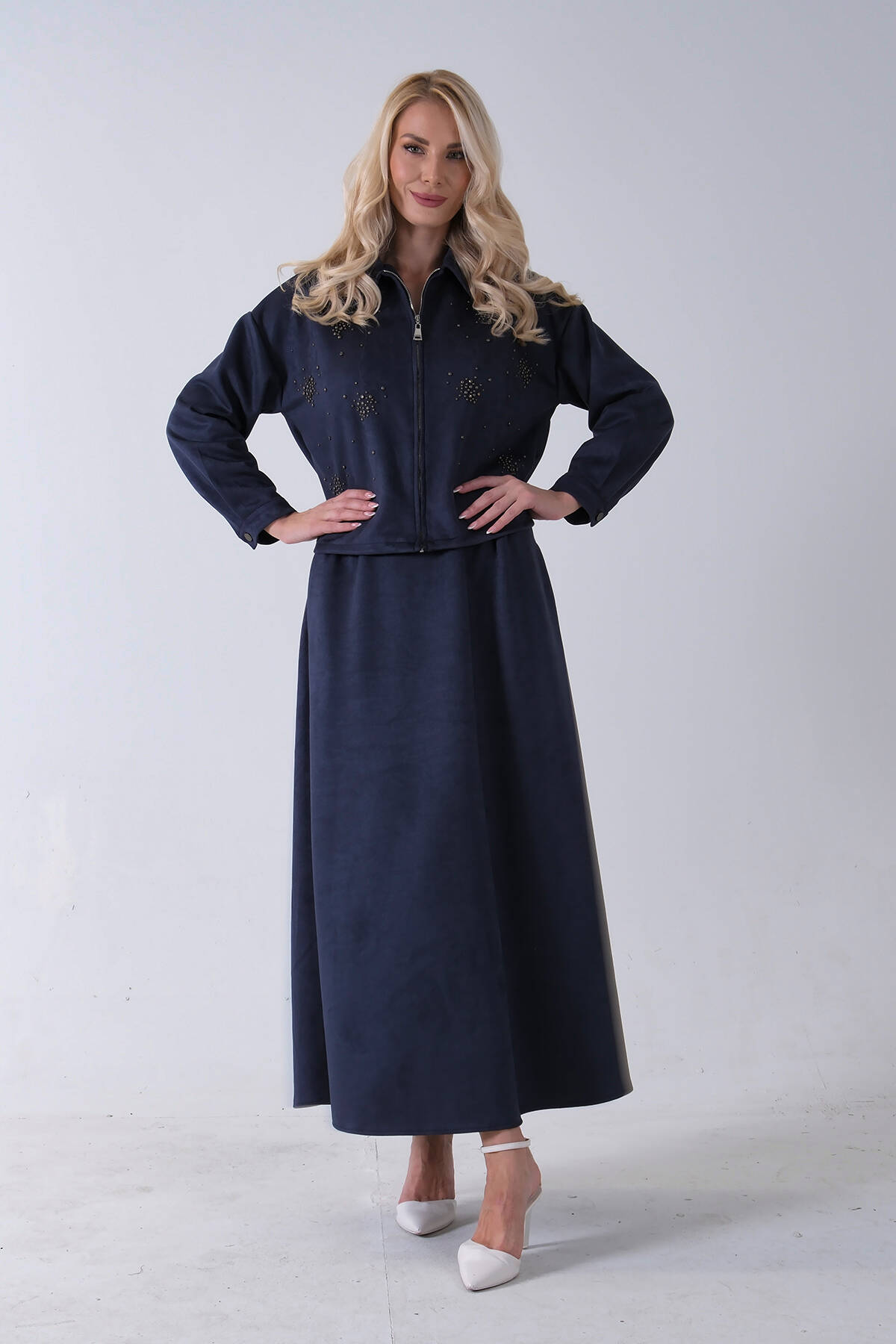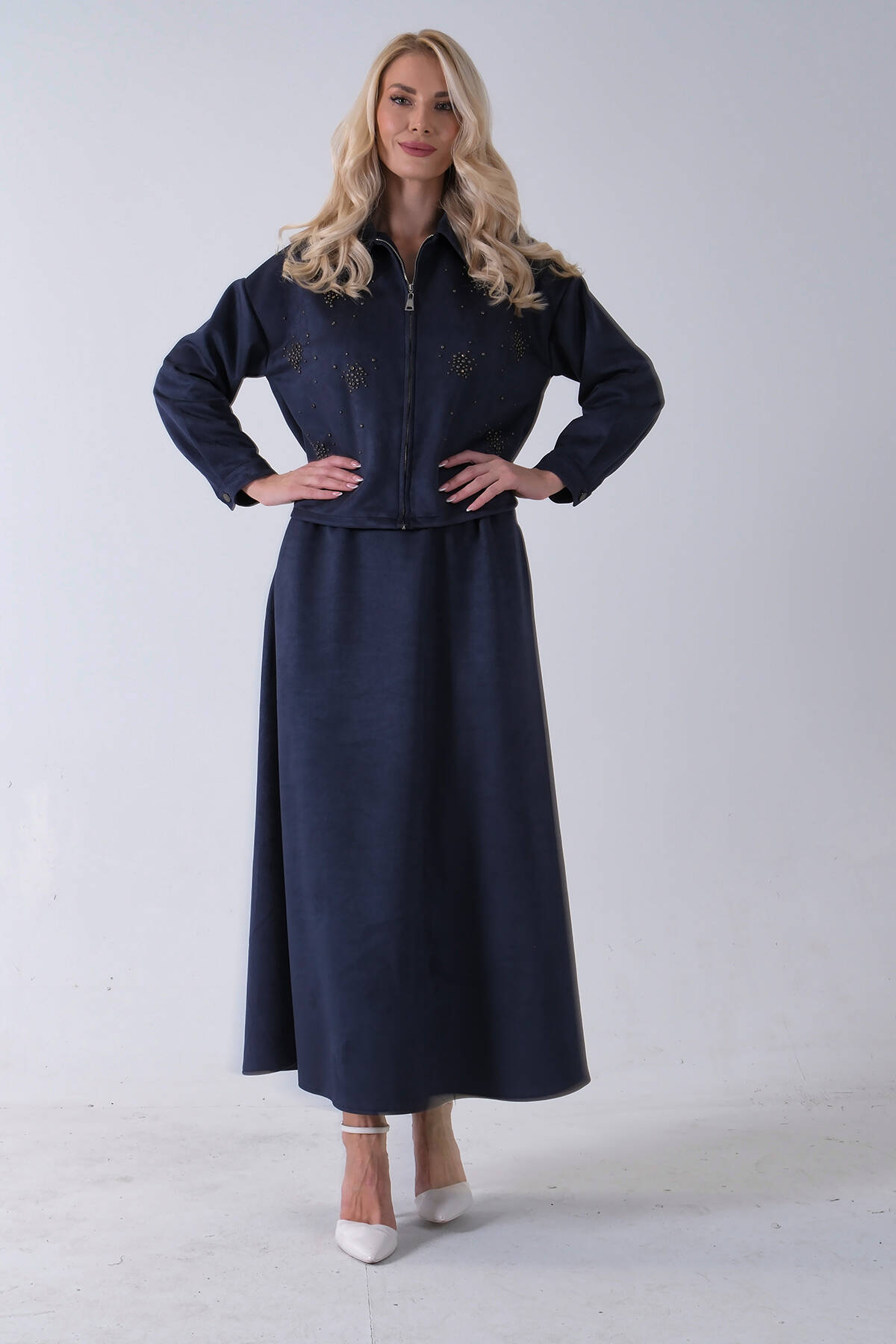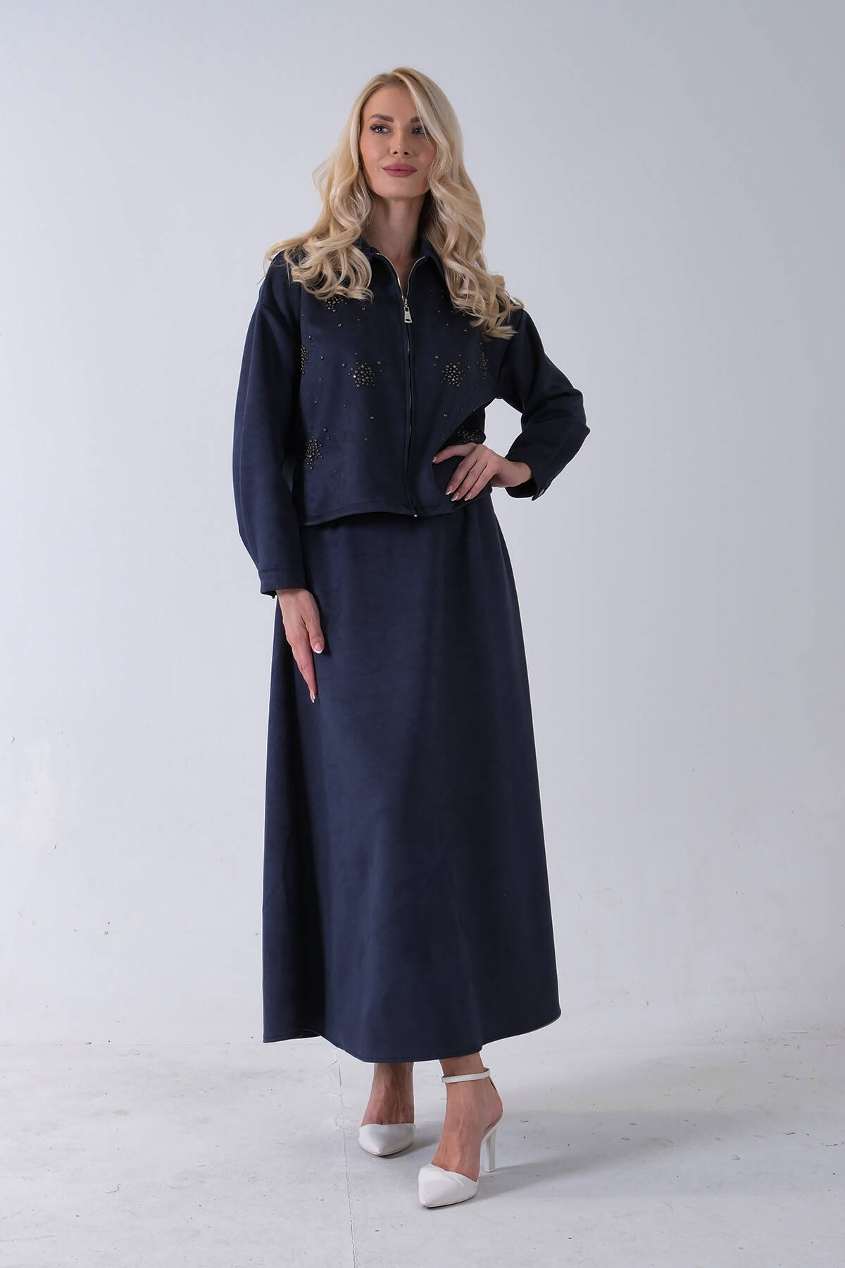 Lacivert Ceket Fermuar Kapamalı Üzeri Taş Detaylı Etekli Kadife Takım 4577264.02