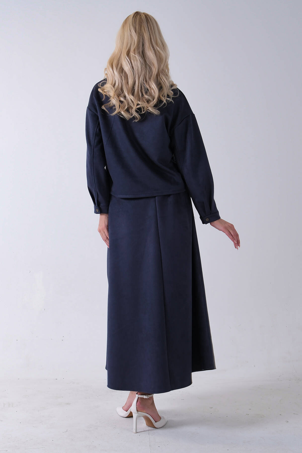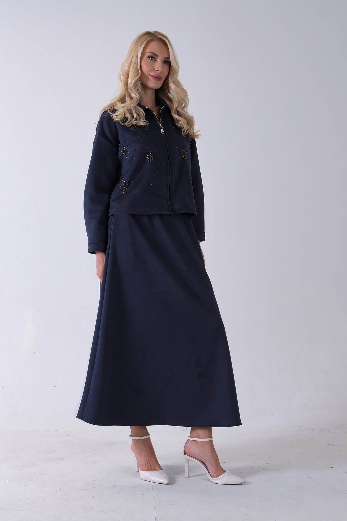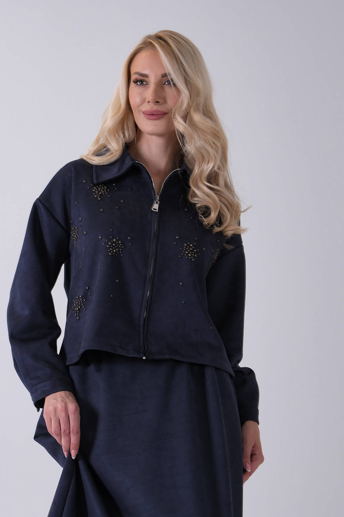 Lacivert Ceket Fermuar Kapamalı Üzeri Taş Detaylı Etekli Kadife Takım 4577264.02