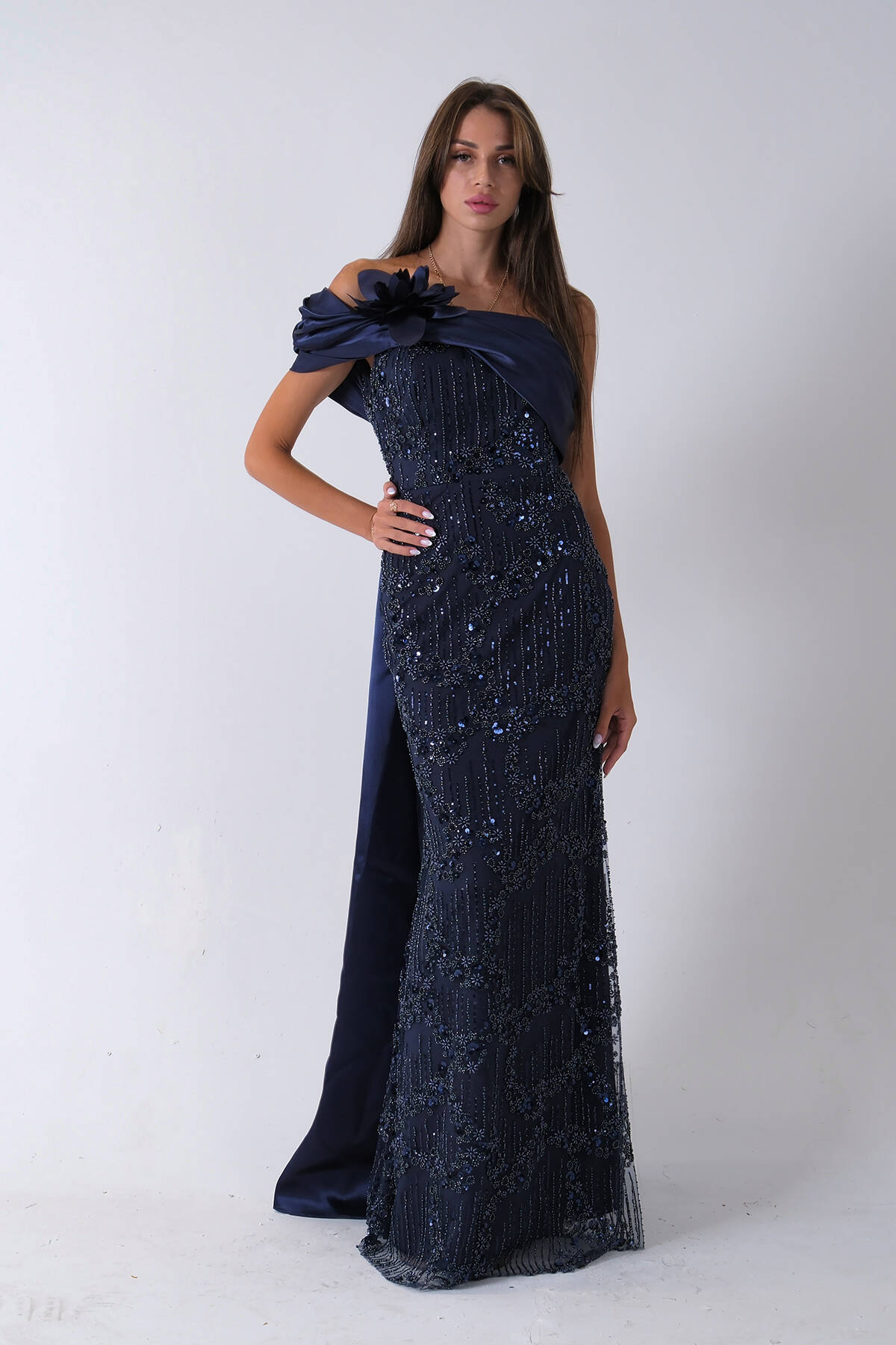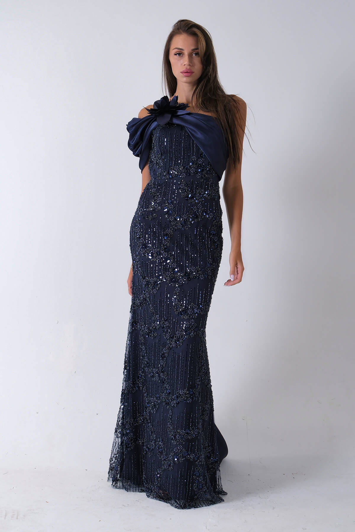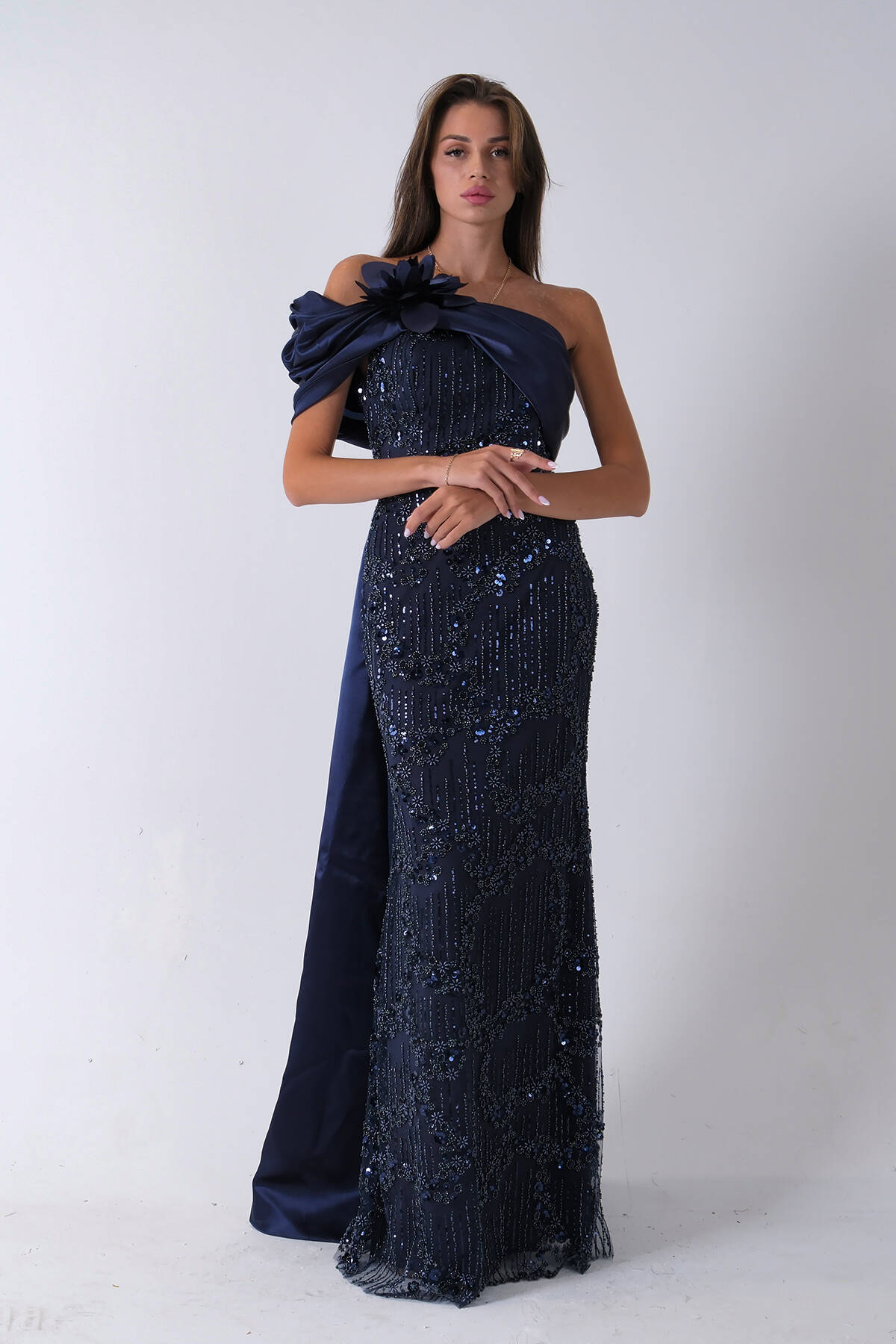 Lacivert Çiçek Detaylı Pul Boncuk İşlemeli Kuyruklu Abiye 9705650.02