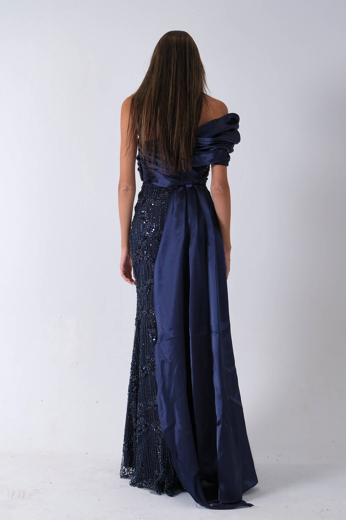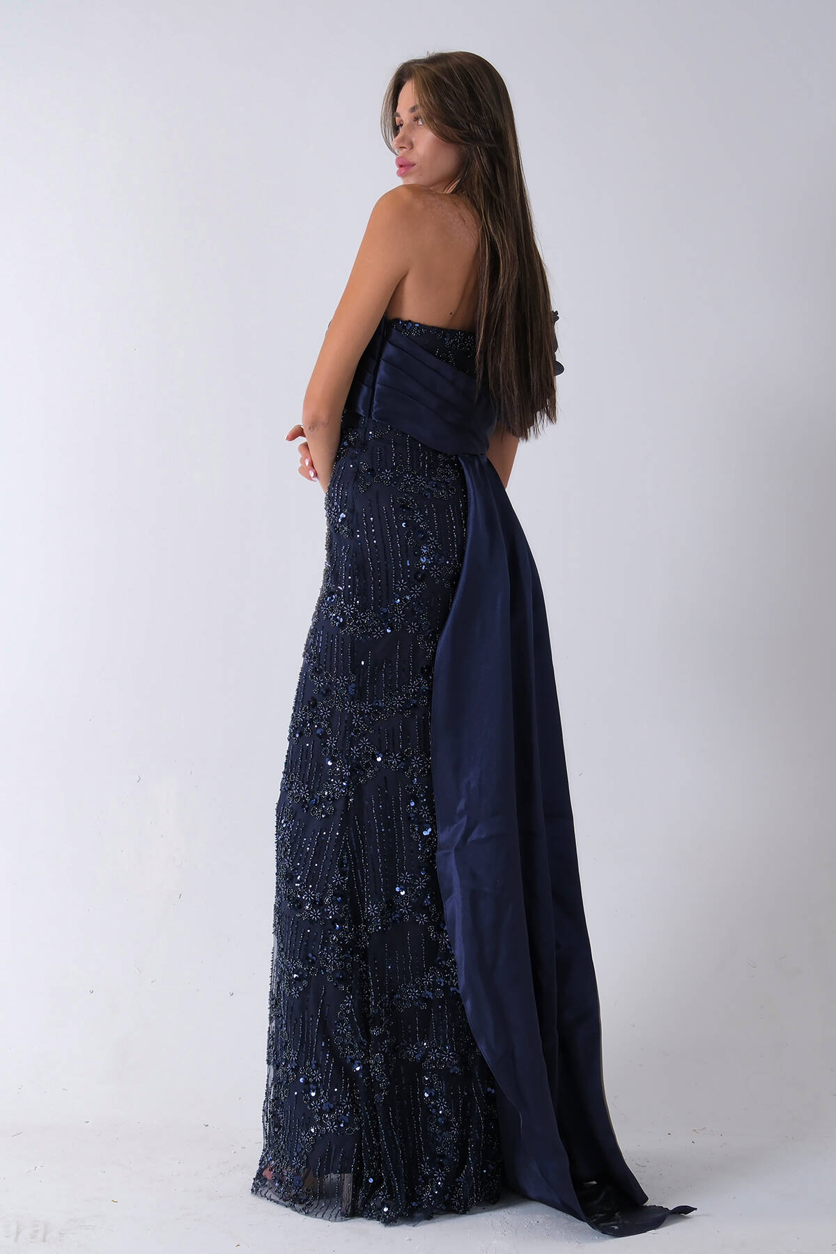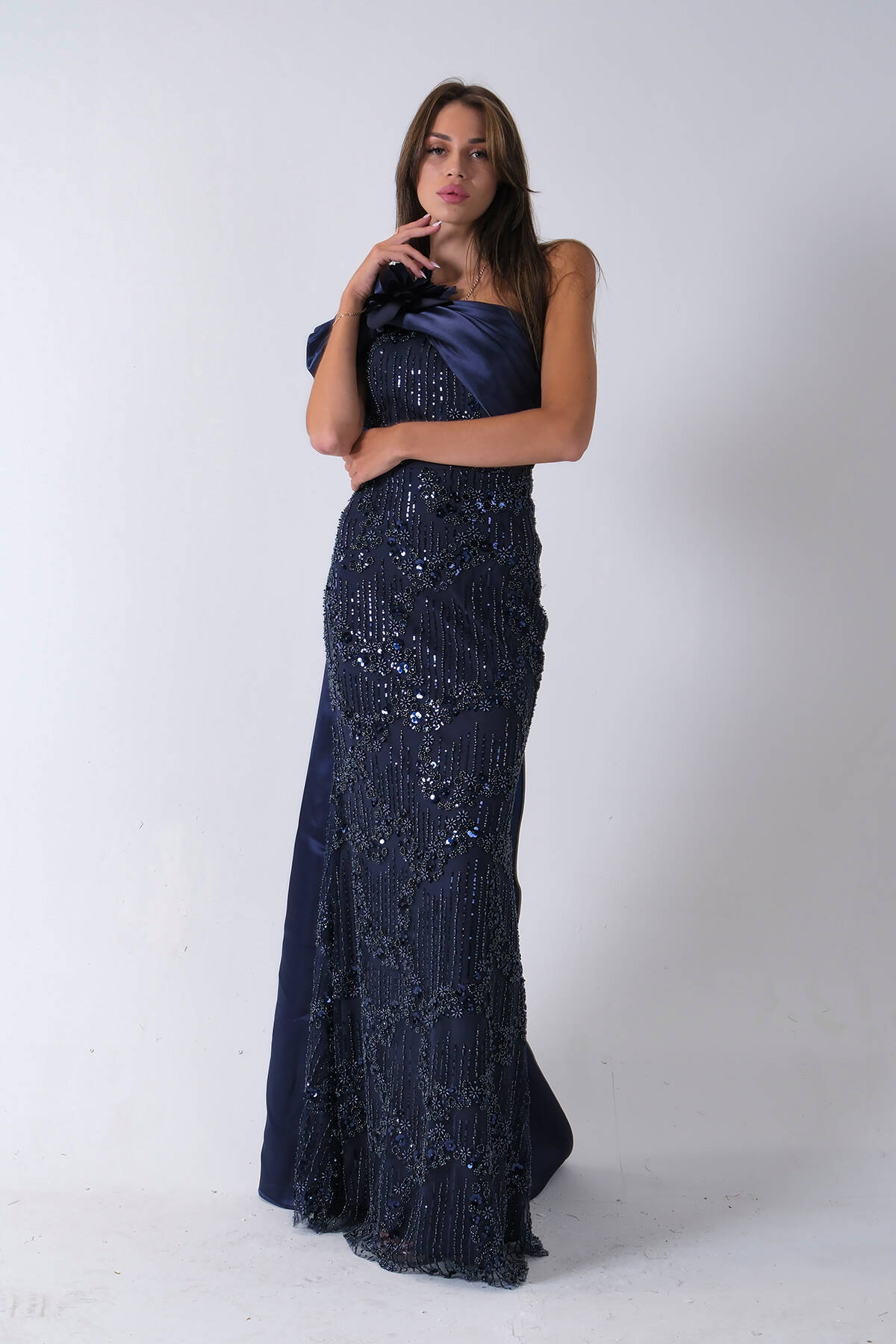 Lacivert Çiçek Detaylı Pul Boncuk İşlemeli Kuyruklu Abiye 9705650.02