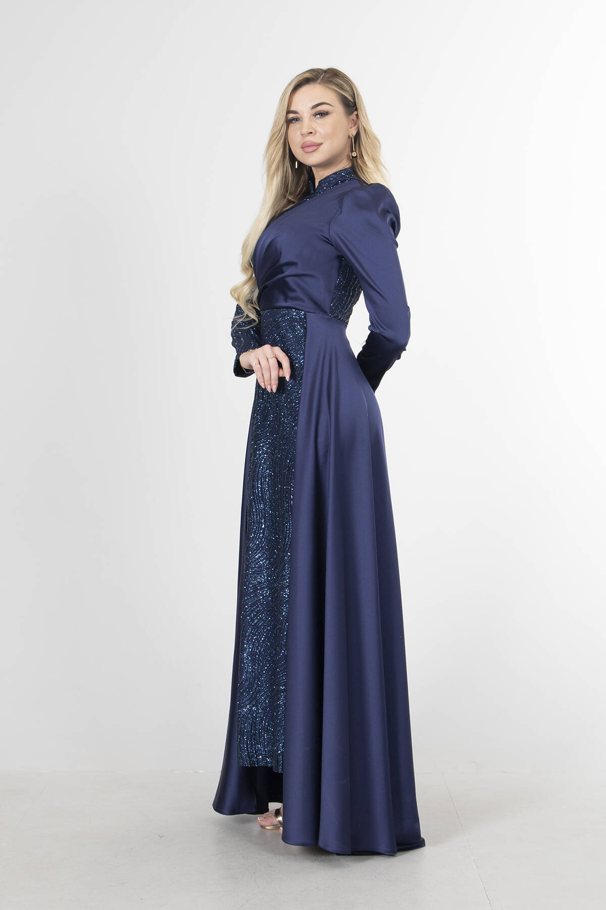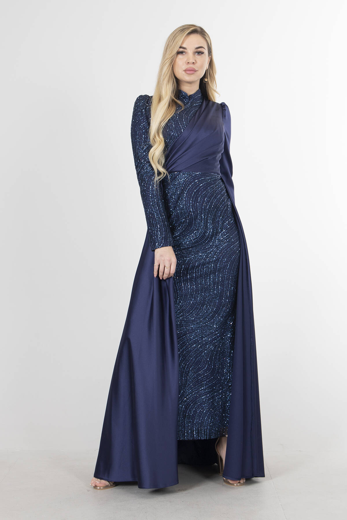 Modelin Ölçüleri : Boy: 1.80 cm / Göğüs: 88 cm / Bel: 69 cm /Basen : 94 cm Mankenin Üzerindeki Ürün 36/S Bedendir %100 Polyester Uzun Kol Dik Yaka Saten Drape Ve Kuyruk Detaylı Simli Abiye Elbise Ürün Boyu : 108 cm Stüdyo Çekimlerinde Renkler Işık Farklılıgından Dolayı Değişiklik Gösterebilir (Dikkat! Ürünlerimiz güvenlik bandı ile gönderilmektedir . Güvenlik bandı olmayan ürünlerin iadesi kabul edilmeyecektir)