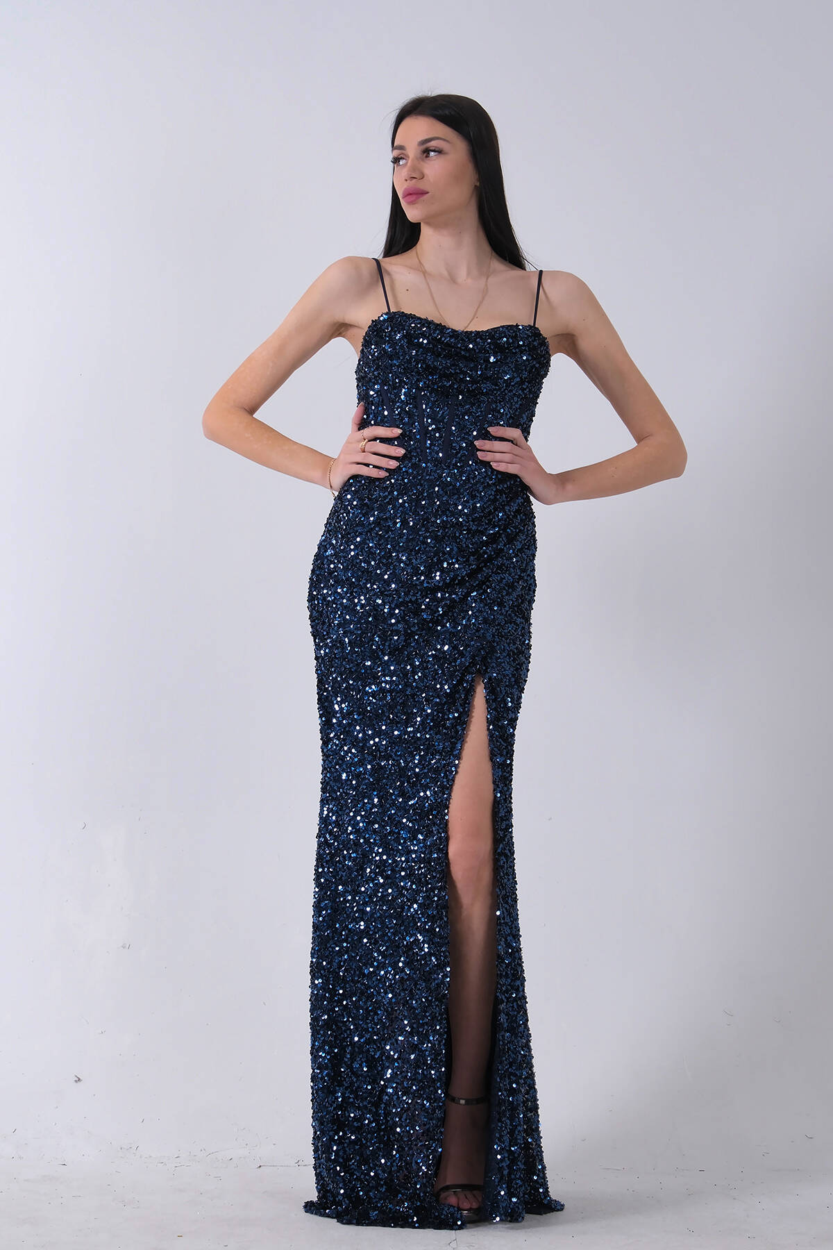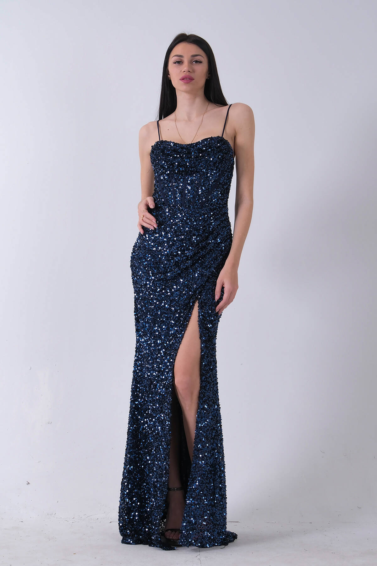 Lacivert Önü Taş Detaylı Yırtmaçlı Pul Payet Straplez Abiye 0801163.02