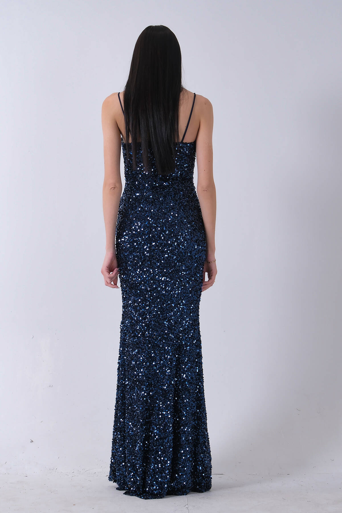 Lacivert Drapeli Parlak Pul Payetli Askılı Abiye 9705539.02