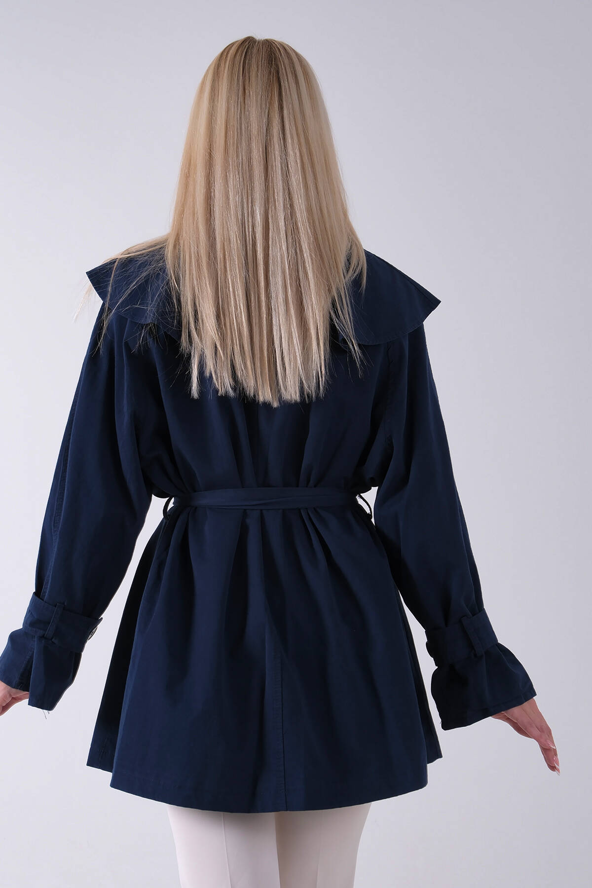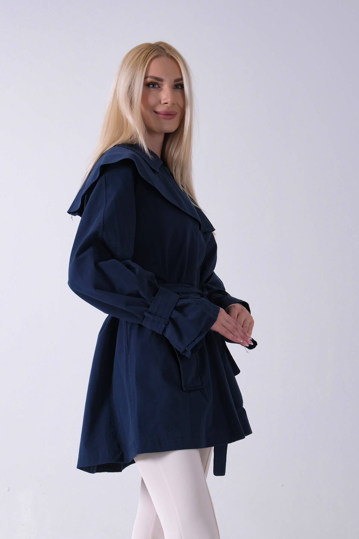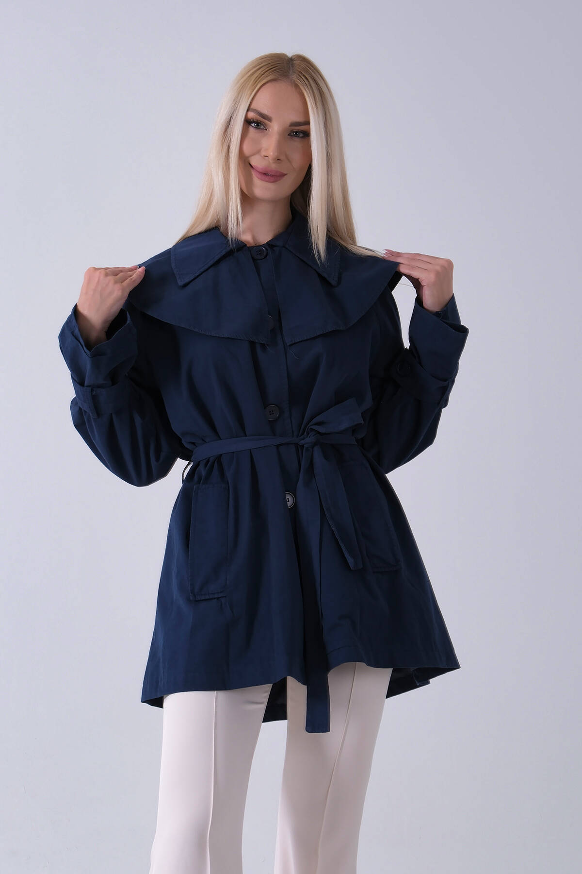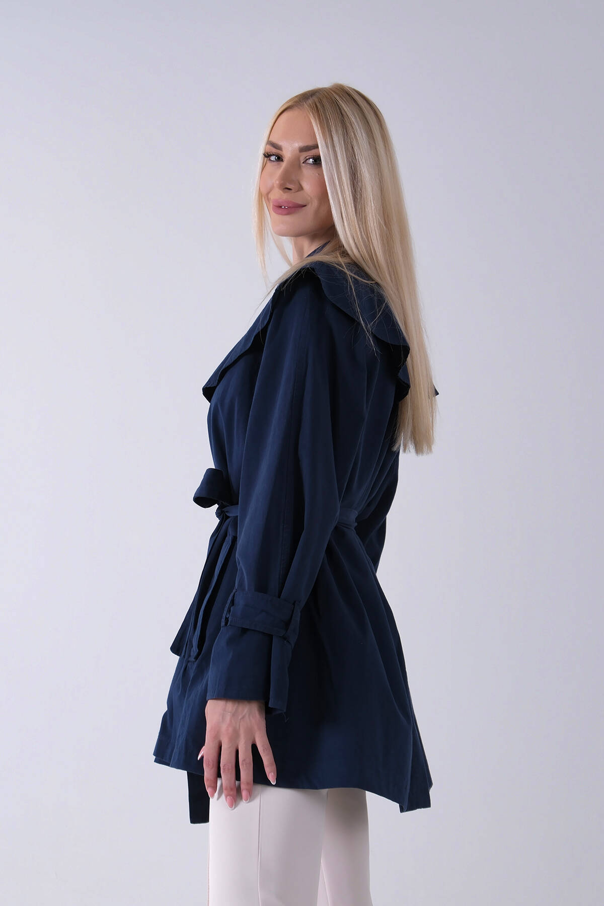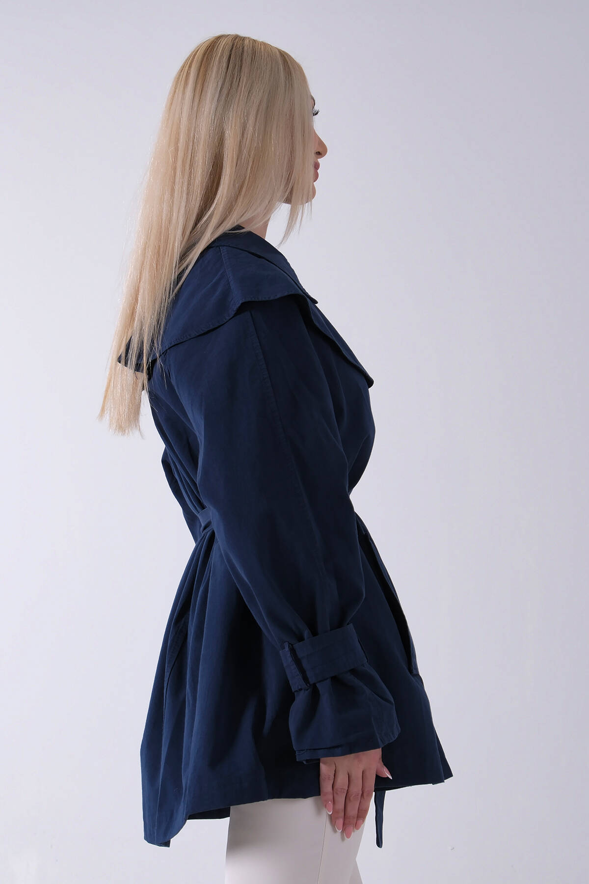 Lacivert Düğme Kapamalı Kuşaklı Yandan Cepli Trenç 422235.02
