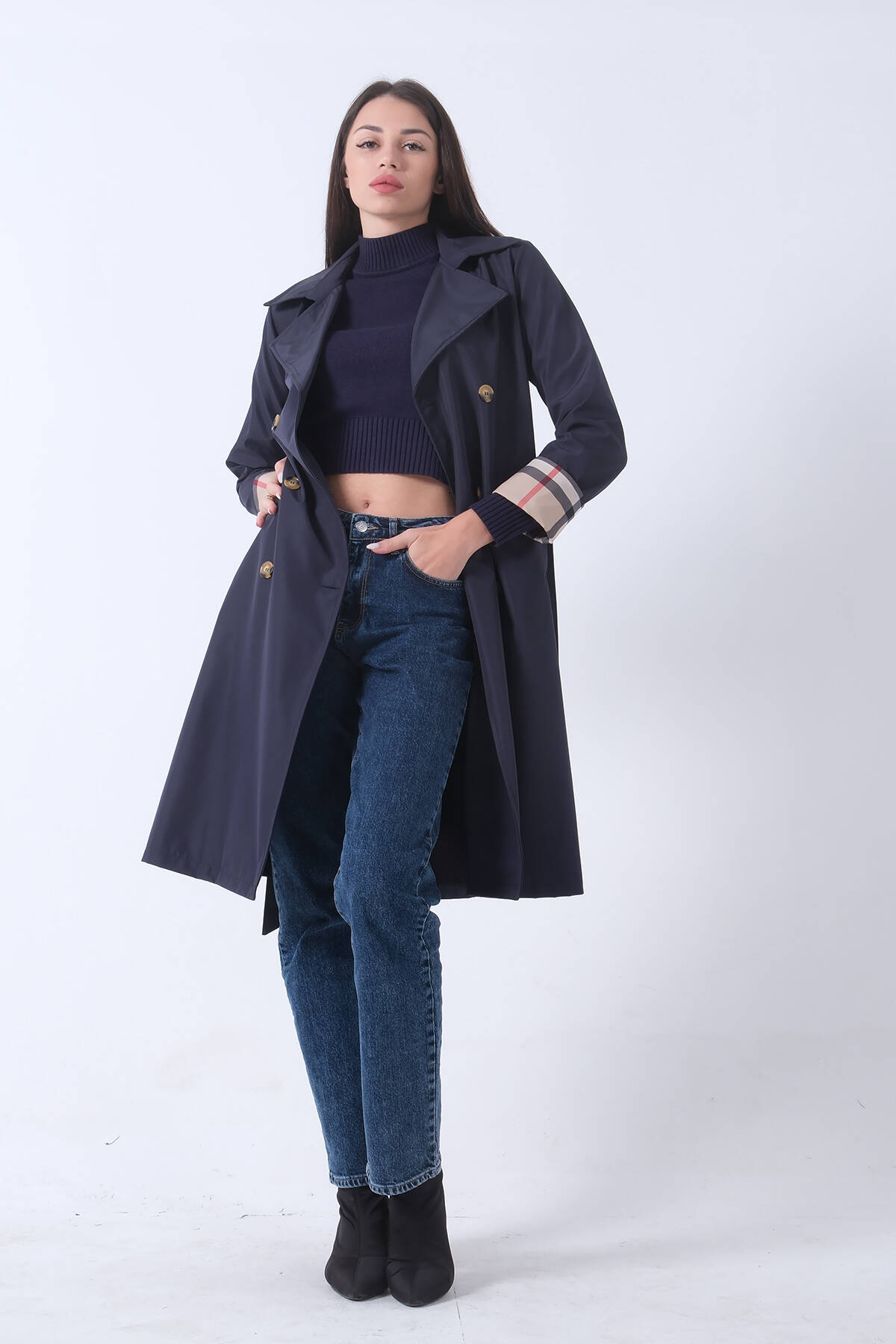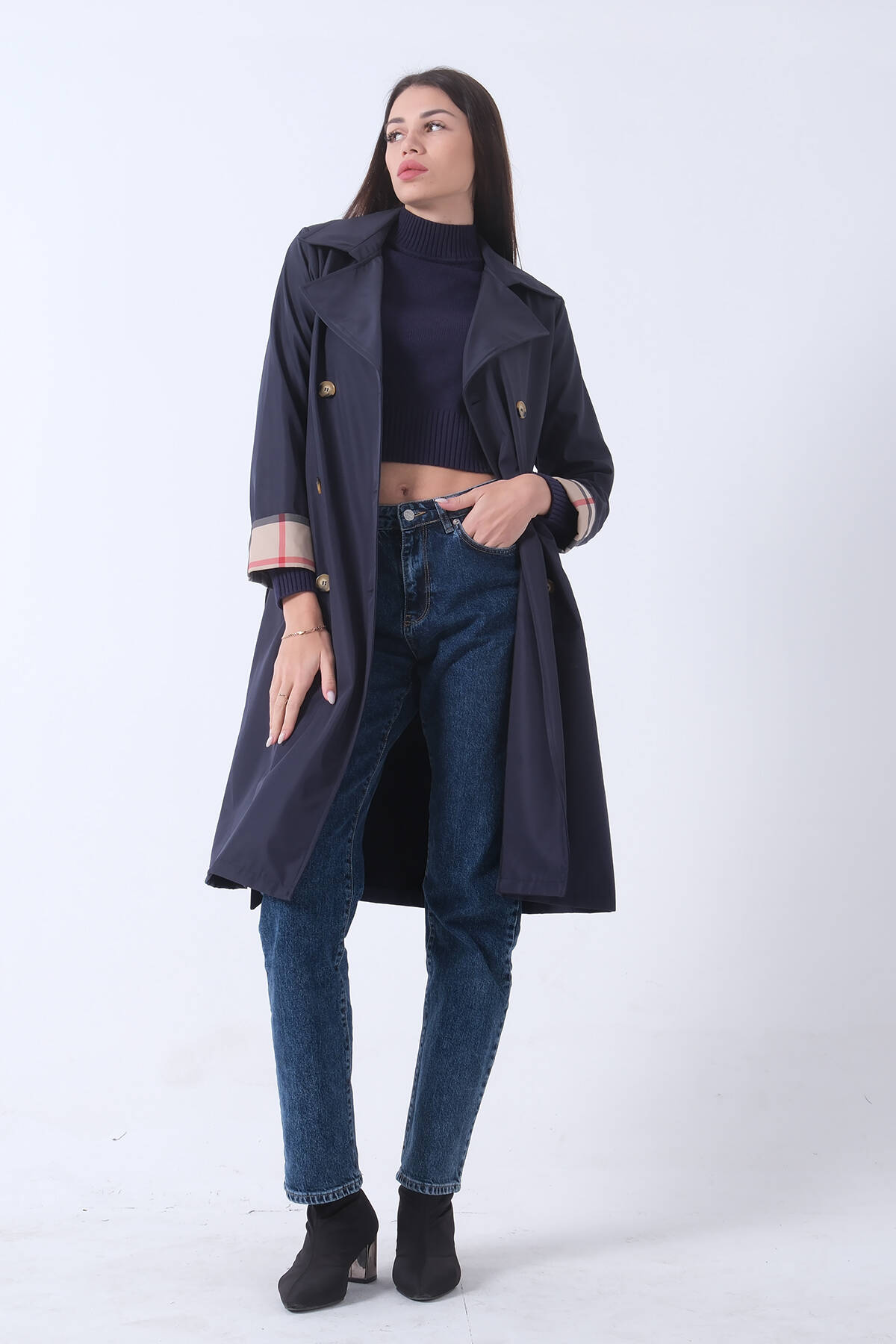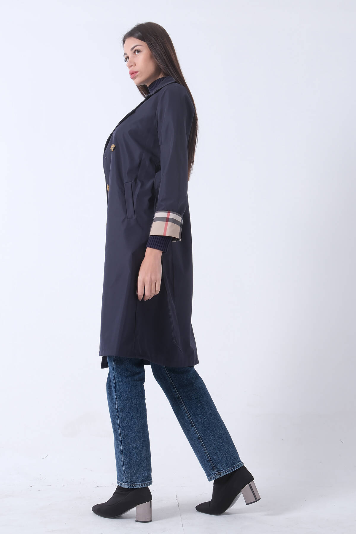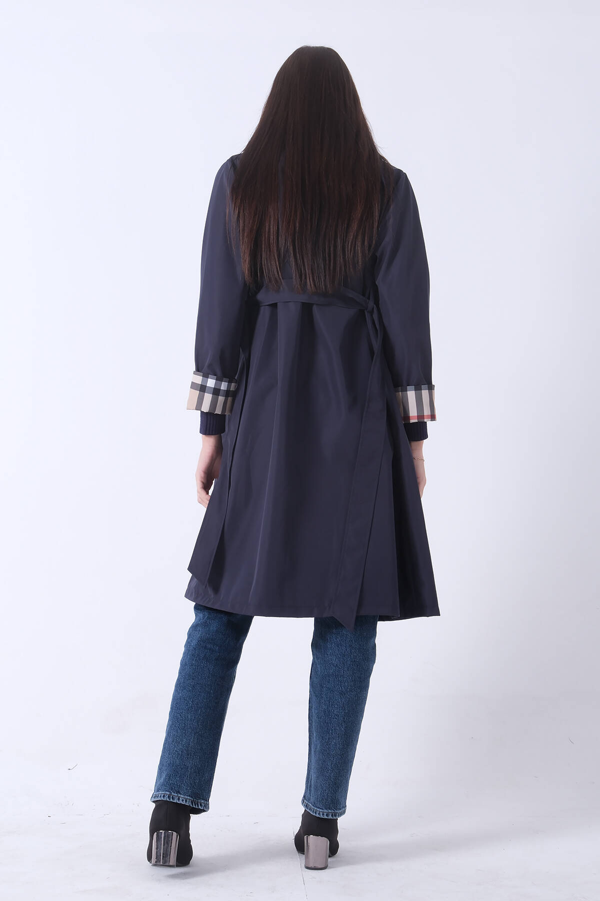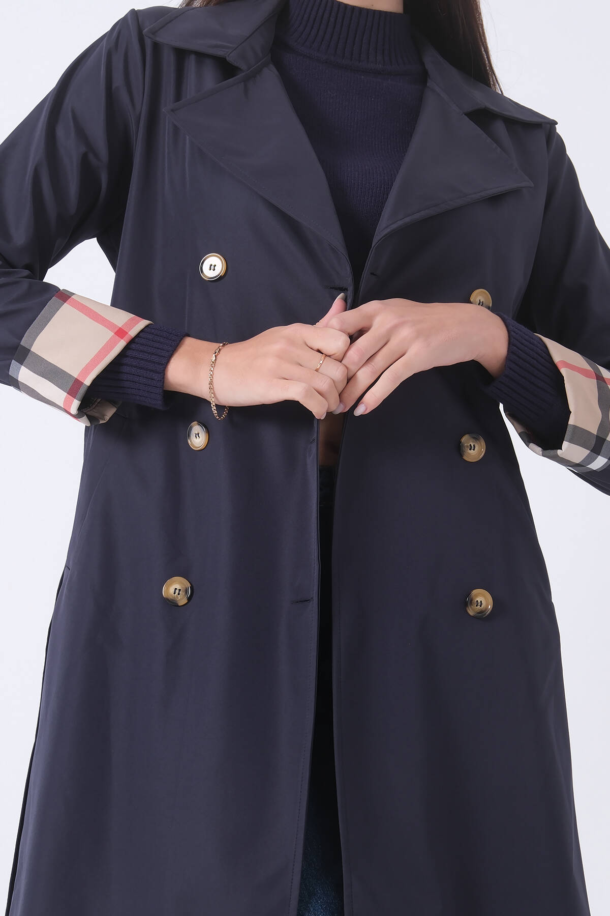 Lacivert Ekose Detaylı Düğme ve Kuşaklı Trençkot 0202027.02