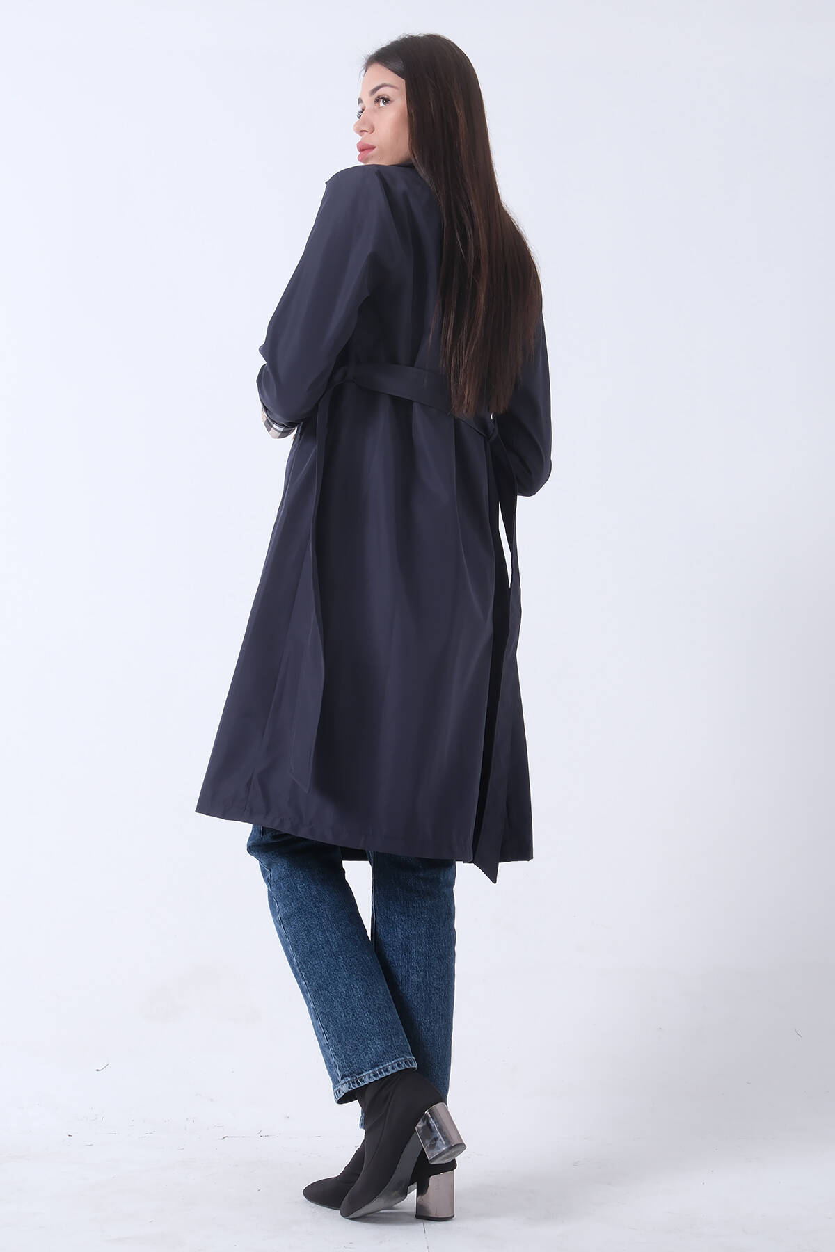 Lacivert Düğme Kapamalı Kuşaklı Yandan Cepli Trenç 422235.02