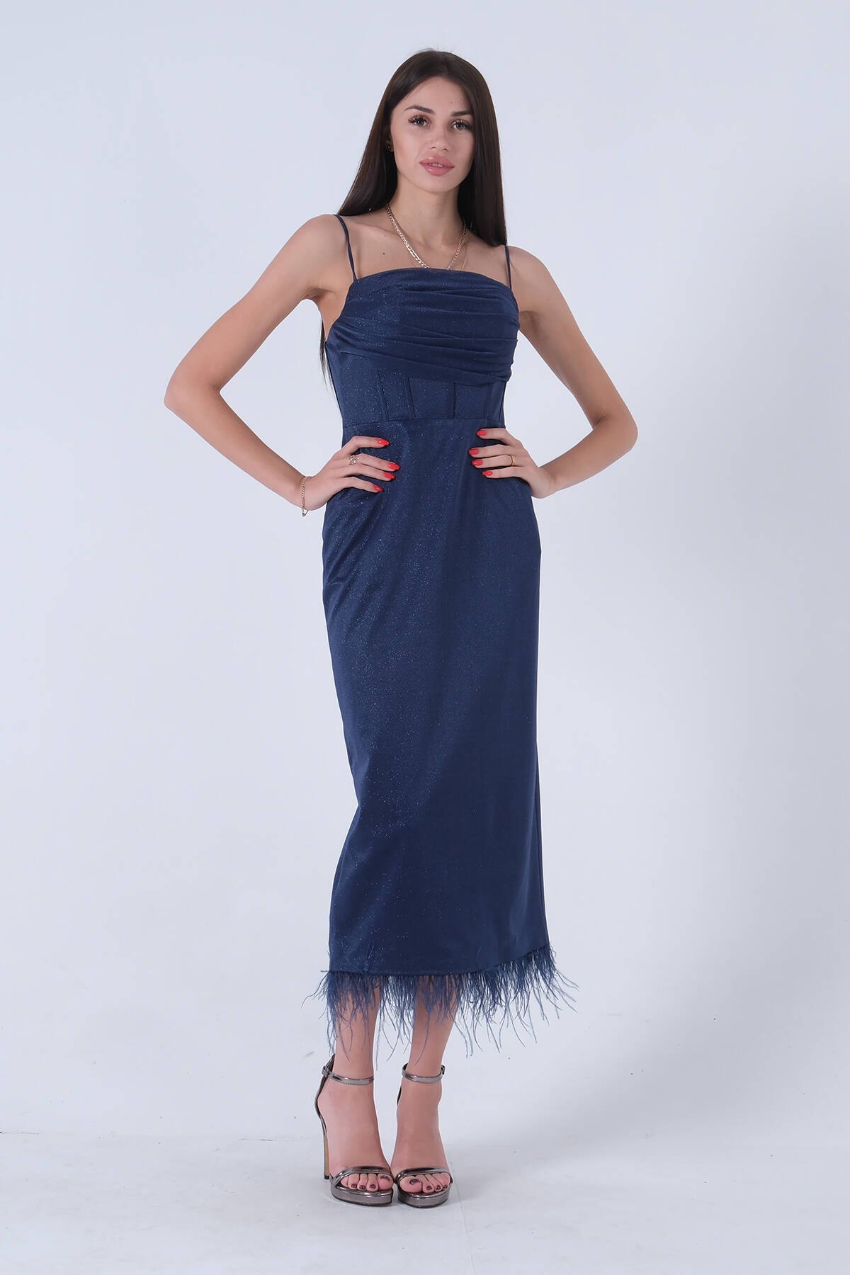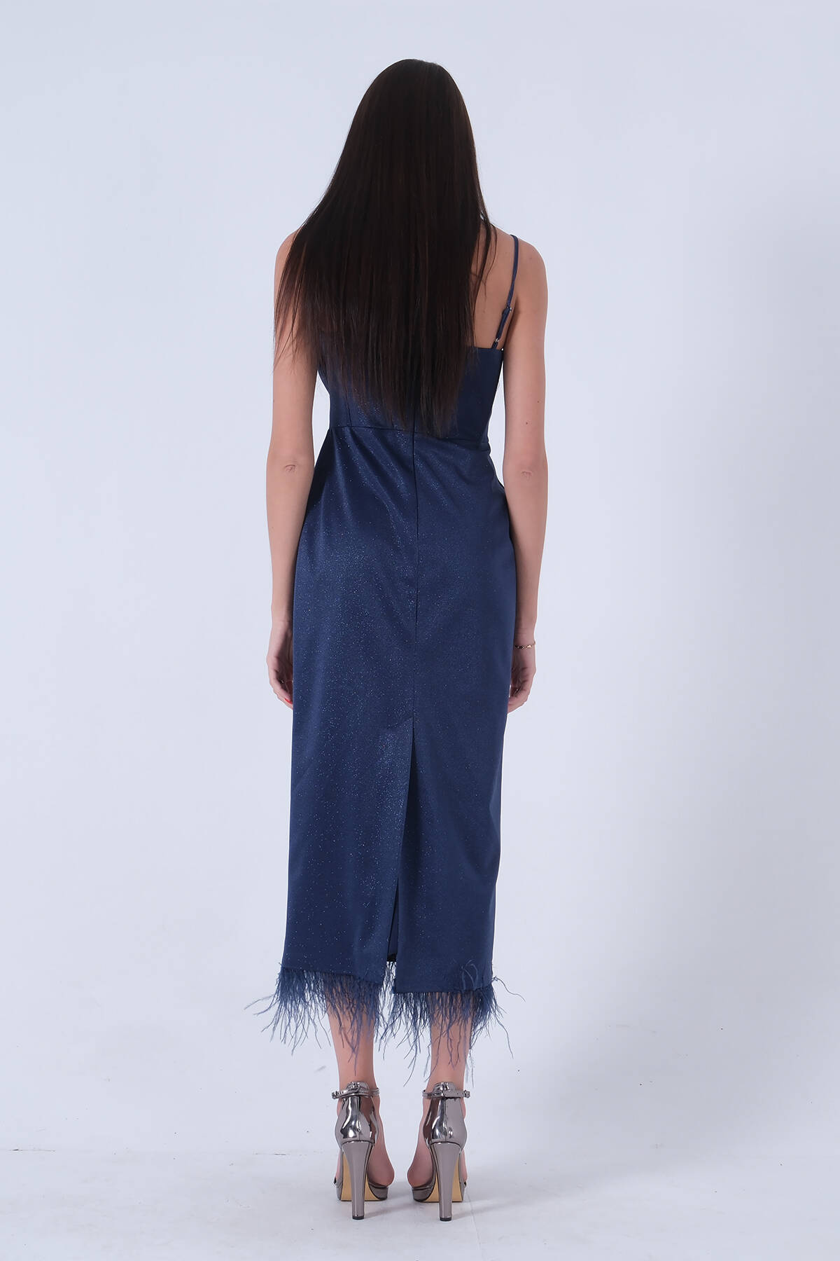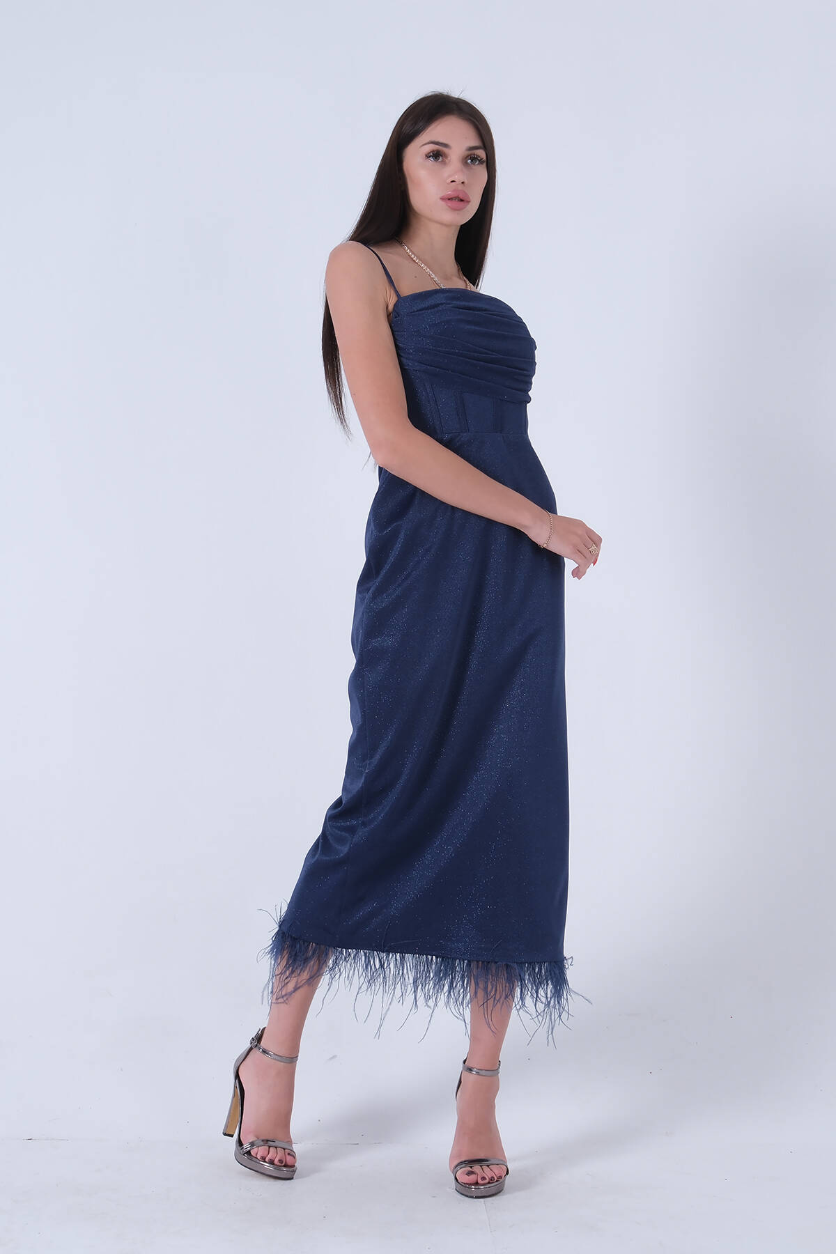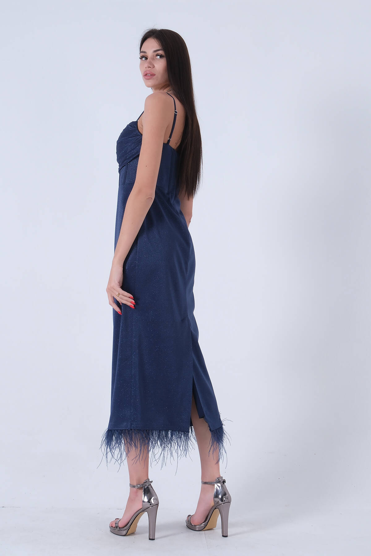 Lacivert Etek Ucu Tüylü Simli Tül Şanel Abiye Elbise 1302245.02