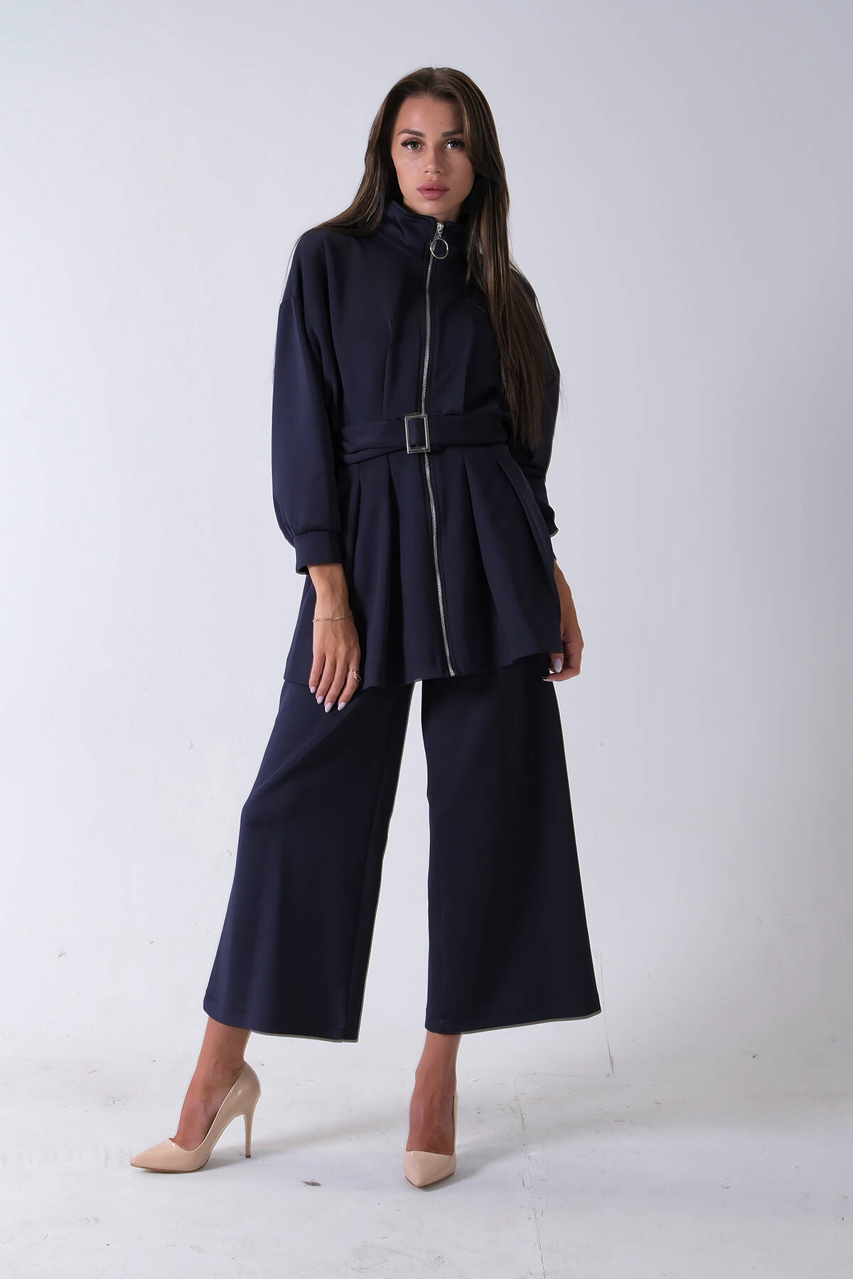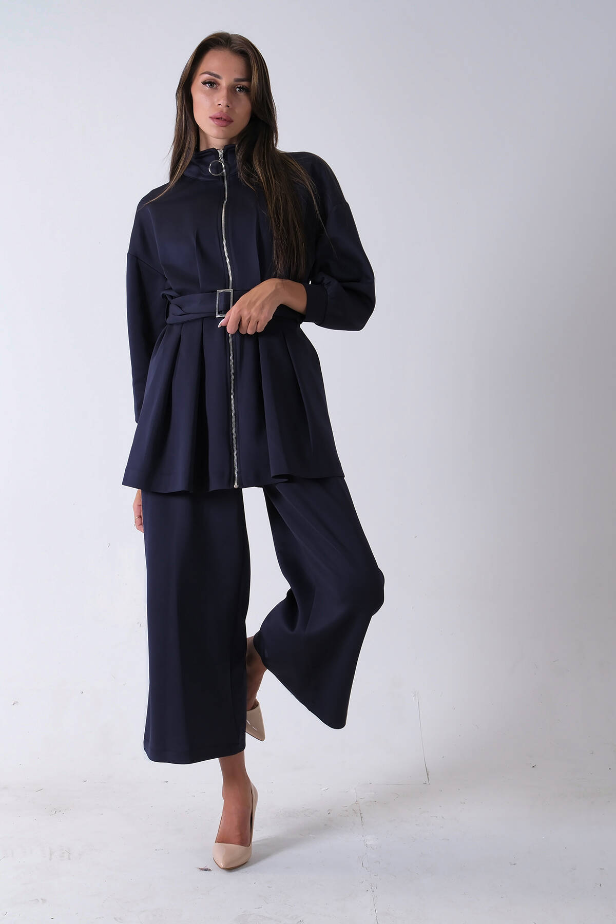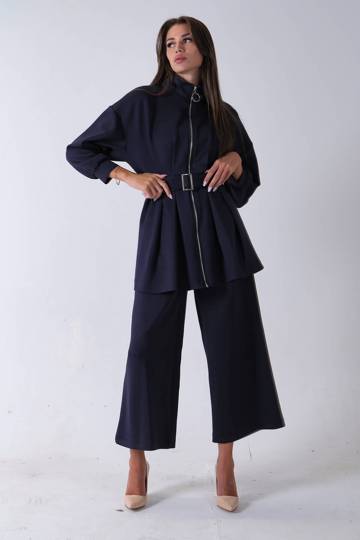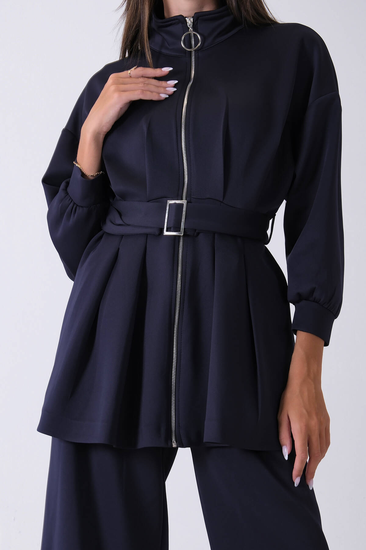 Lacivert Fermuar Kapamalı Beli Kemerli Pantolonlu Scuba Takım 4592264.02