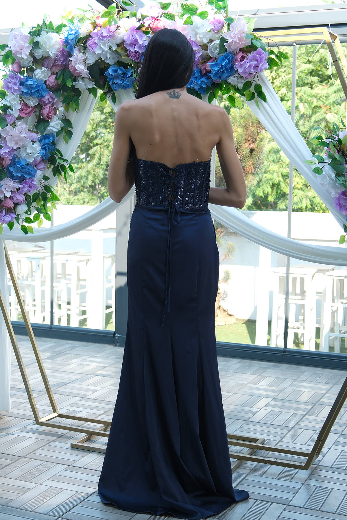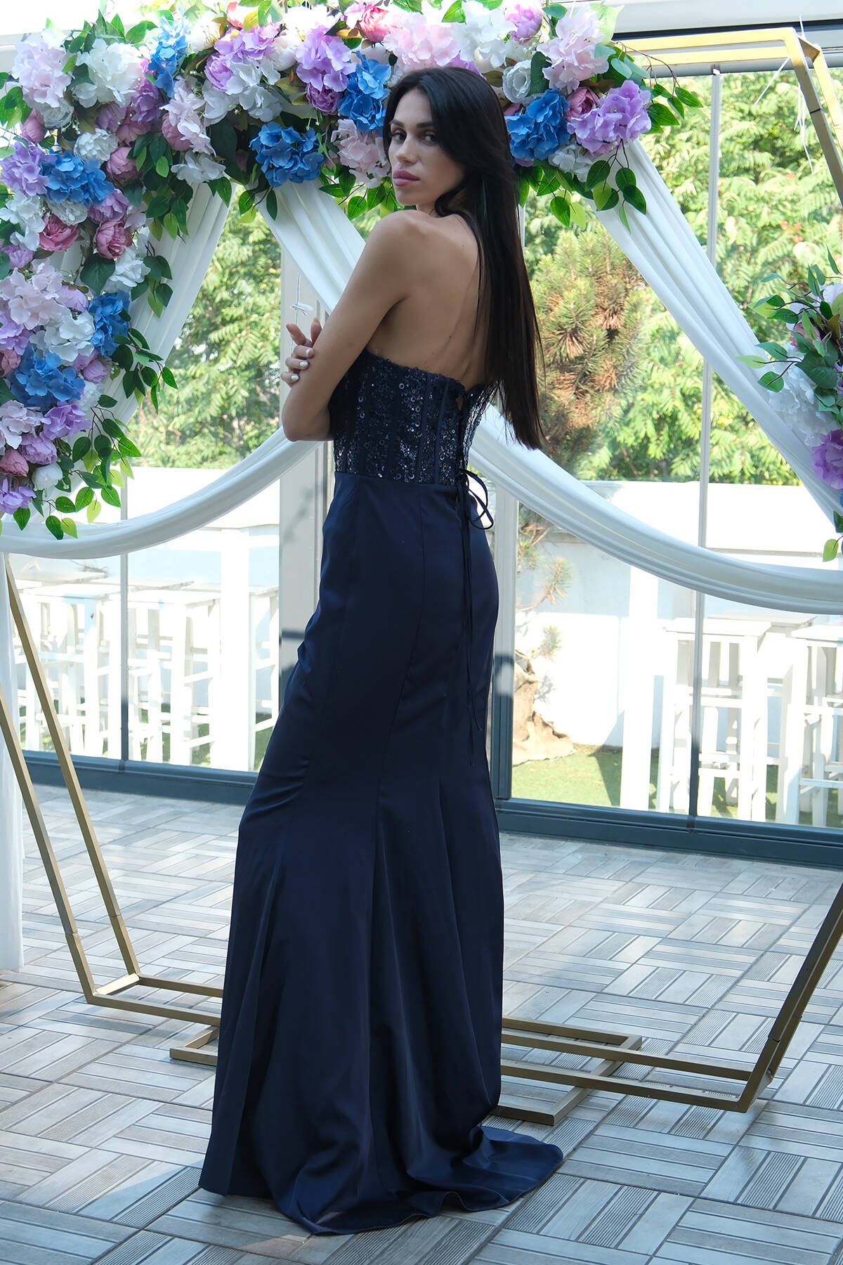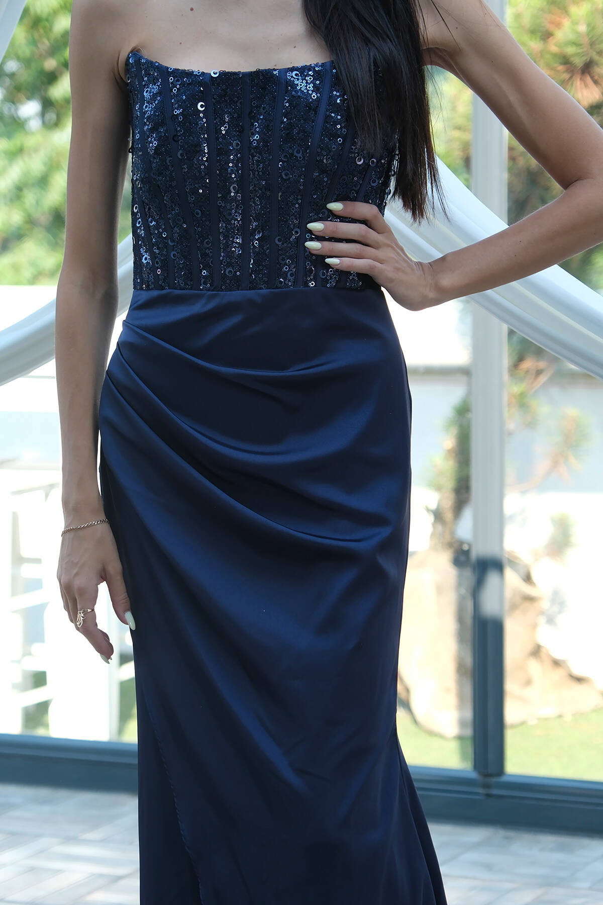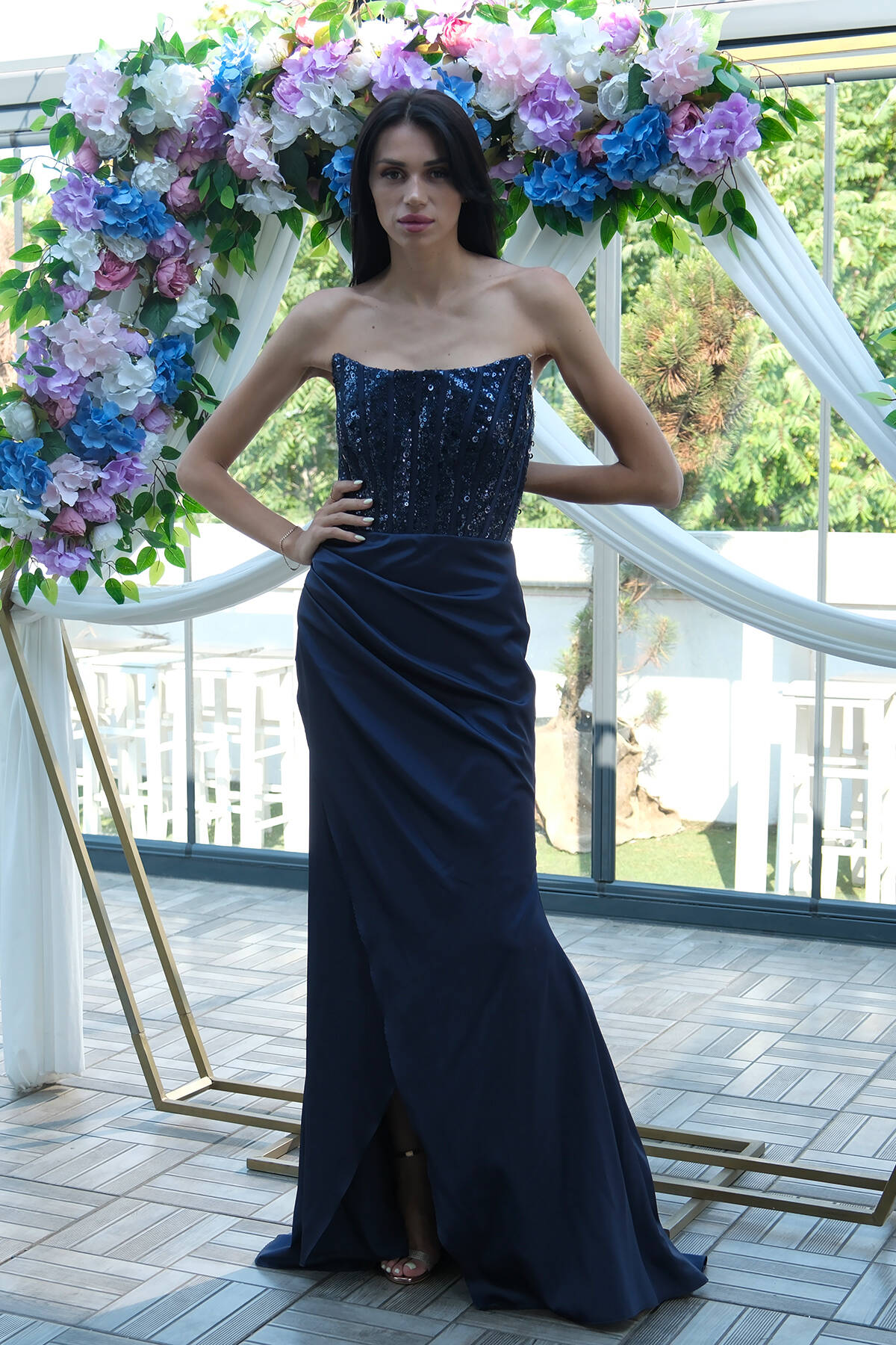 Lacivert Önü Taş Detaylı Yırtmaçlı Pul Payet Straplez Abiye 0801163.02