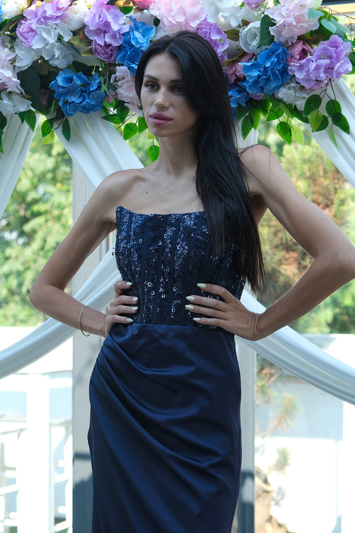 Lacivert Göğüs Pul ve Taşlı Saten Abiye 9705294.02