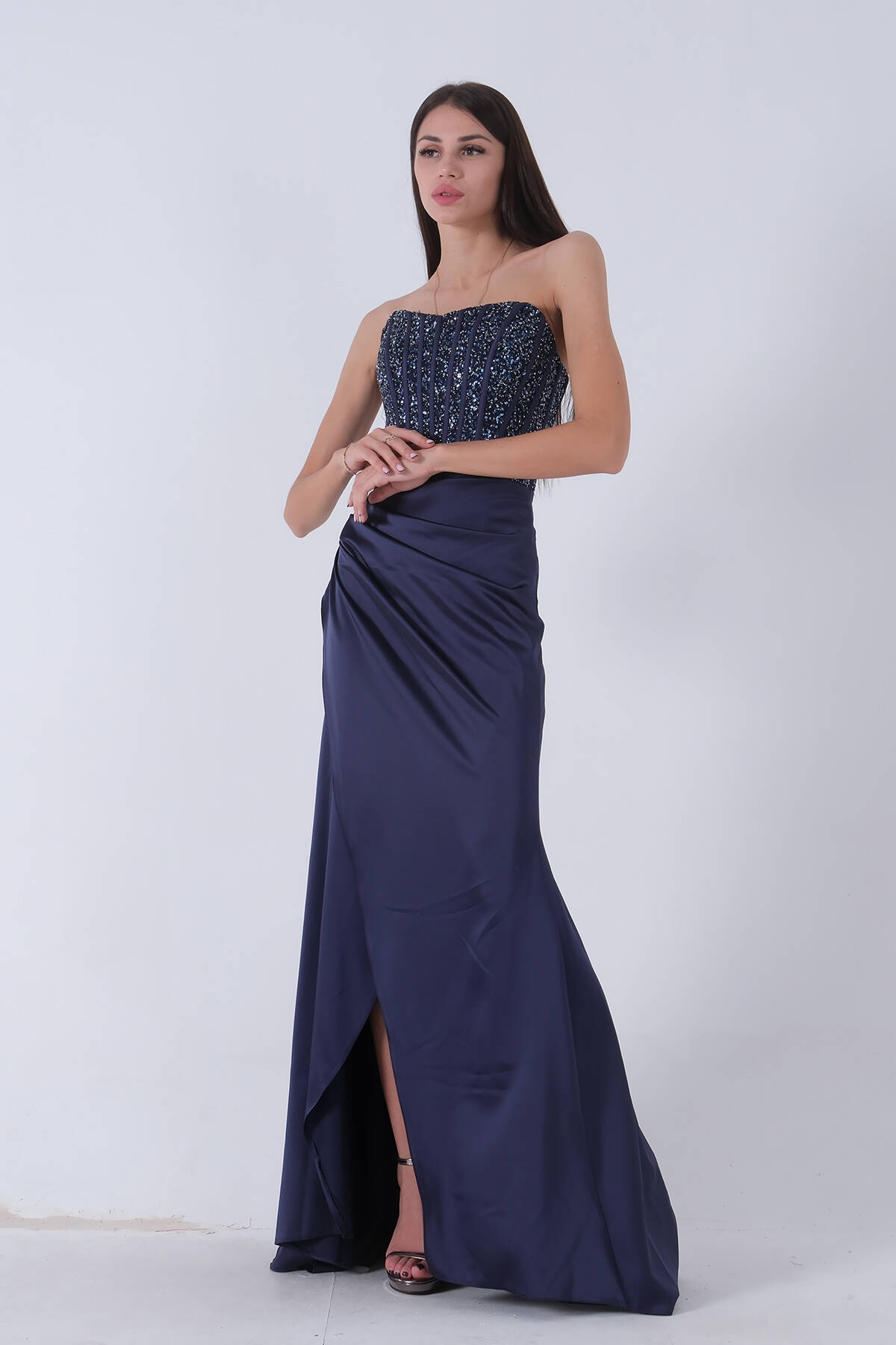 Lacivert Taş İşlemeli Uzun Balık Abiye 0801056.02