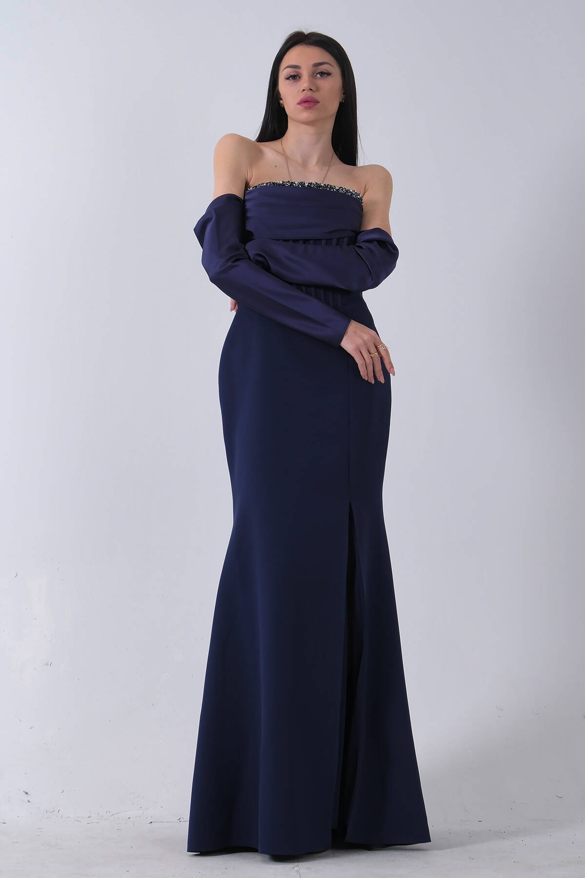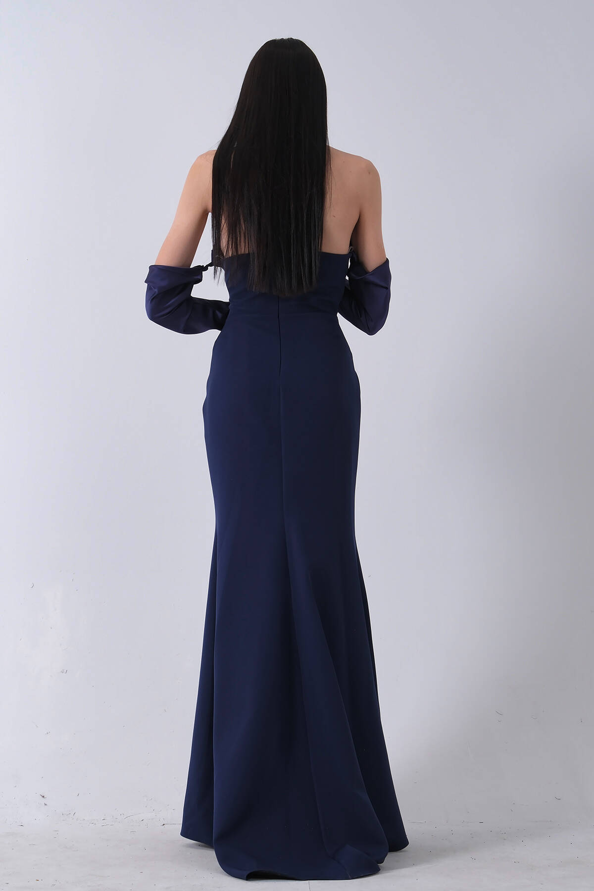 Lacivert Göğüs Taş İşleme Detaylı Drapeli Abiye 9705446.02
