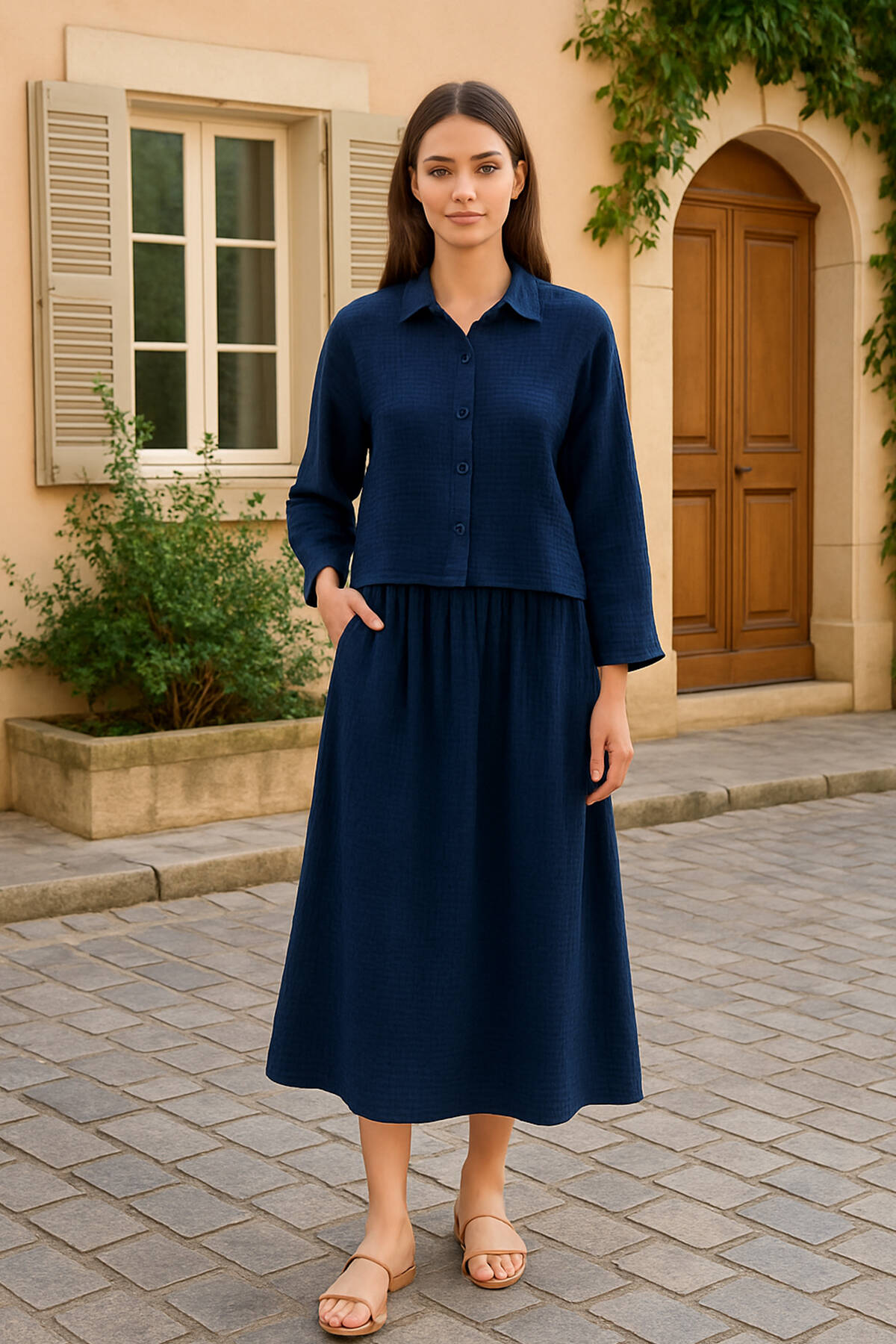 Lacivert Gömlek Yaka Geniş Kol Etekli Takım 422229.02
