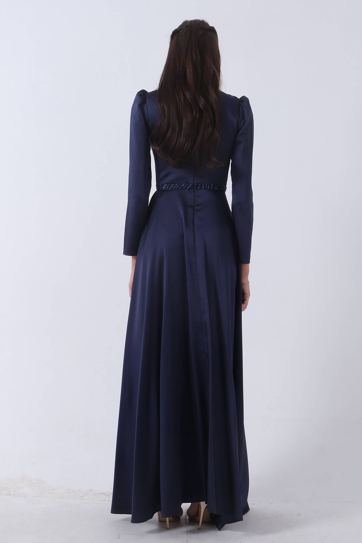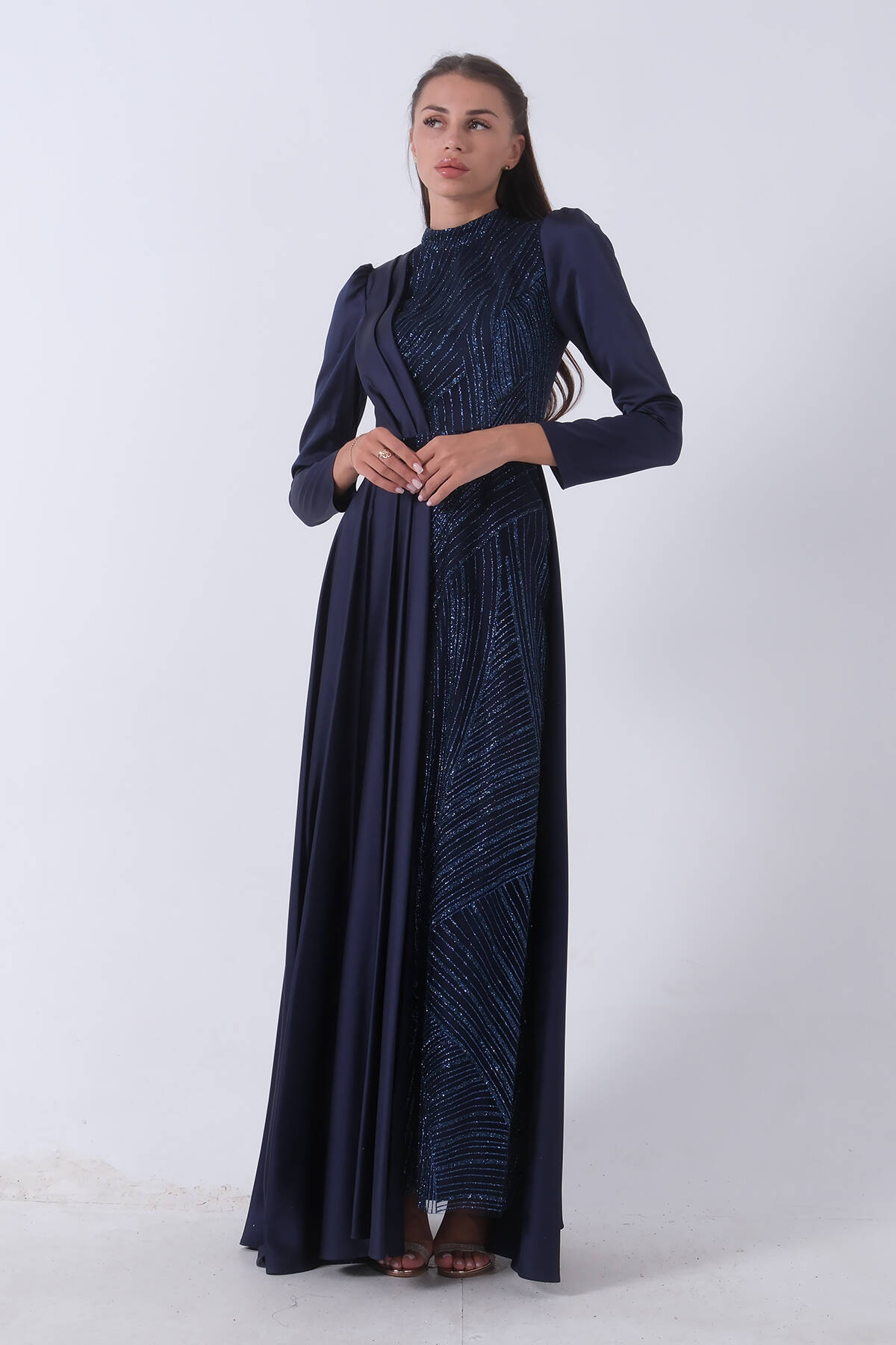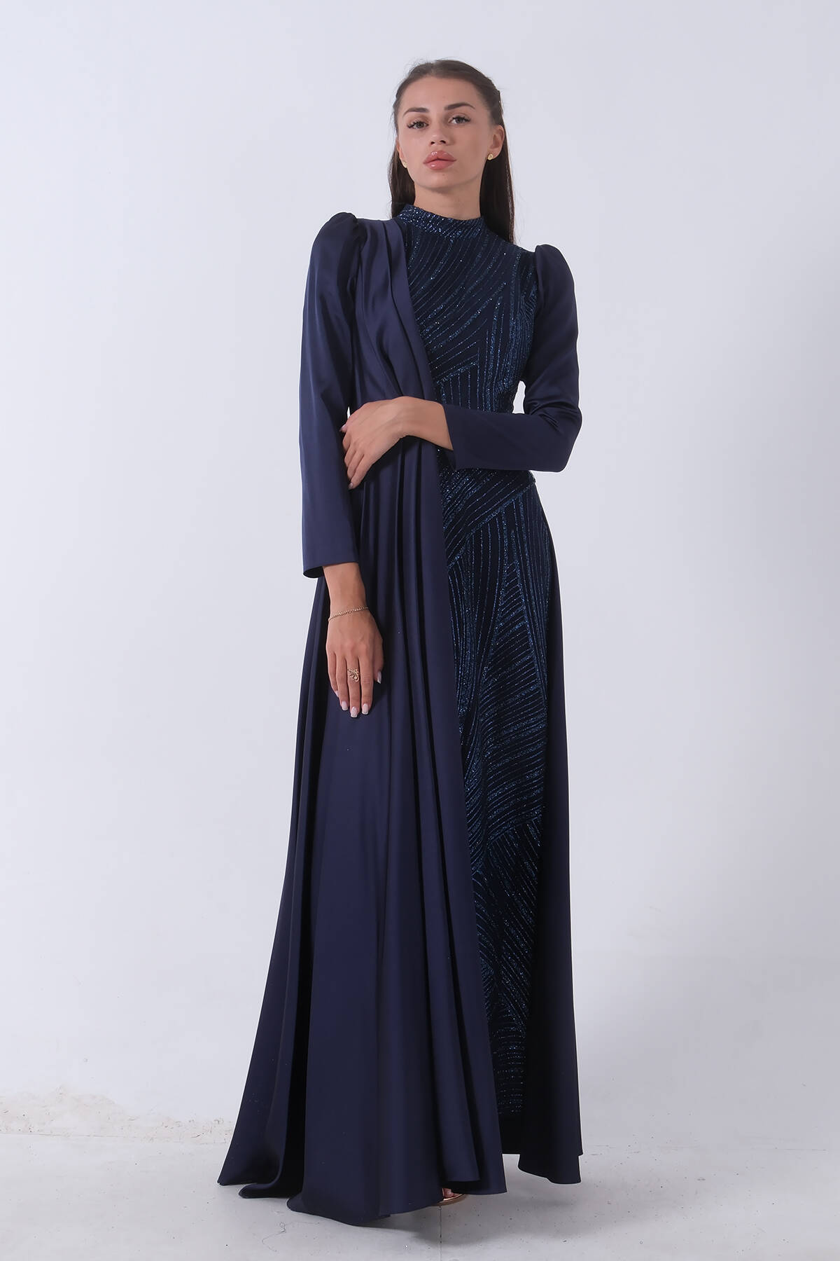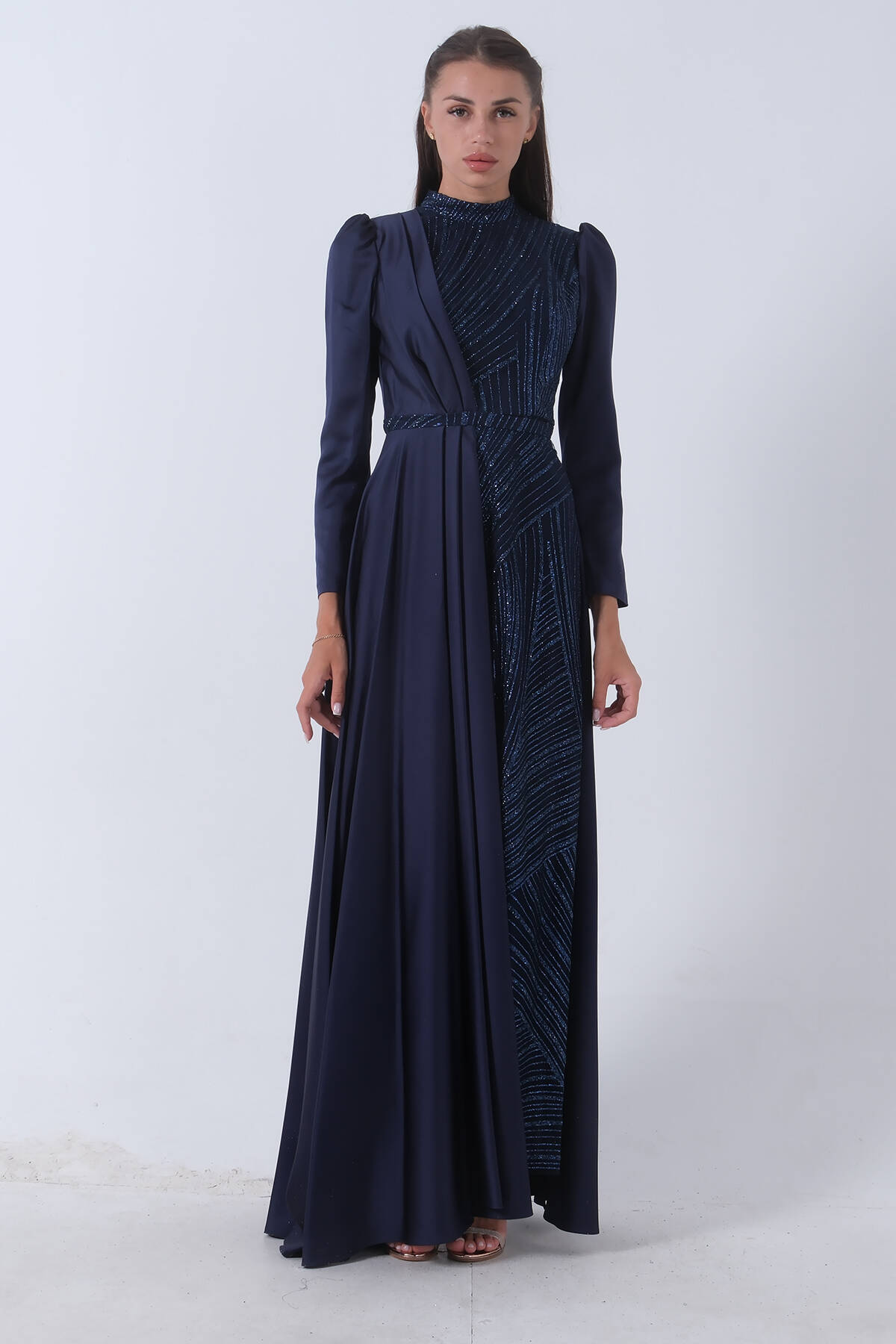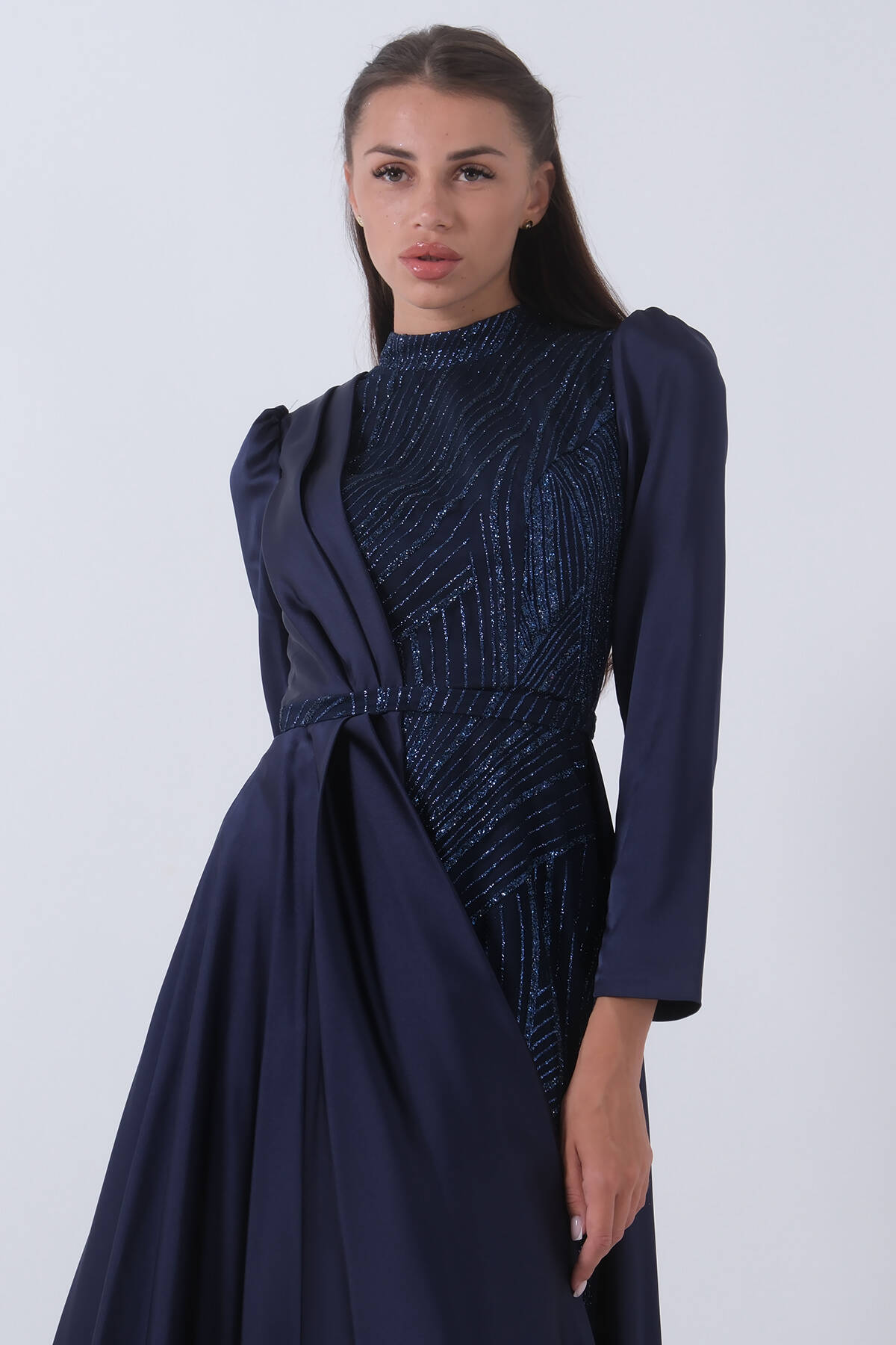 Uzun Kollu Dik Yaka Balon Kol İç Kısmı Simli Sağ Göğüs Üsten Alt Kısmı Parça Kumaşlı Abiye Elbise