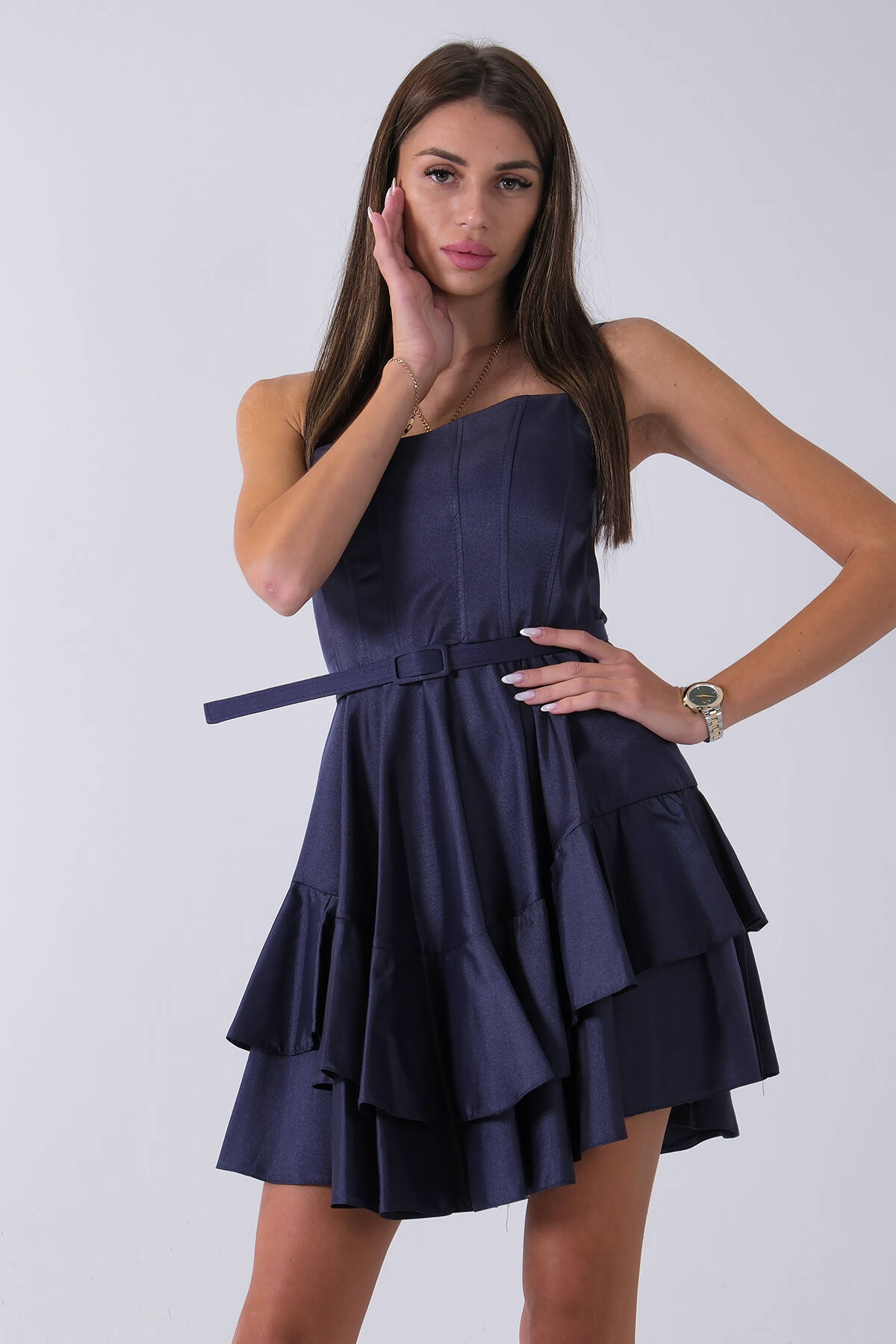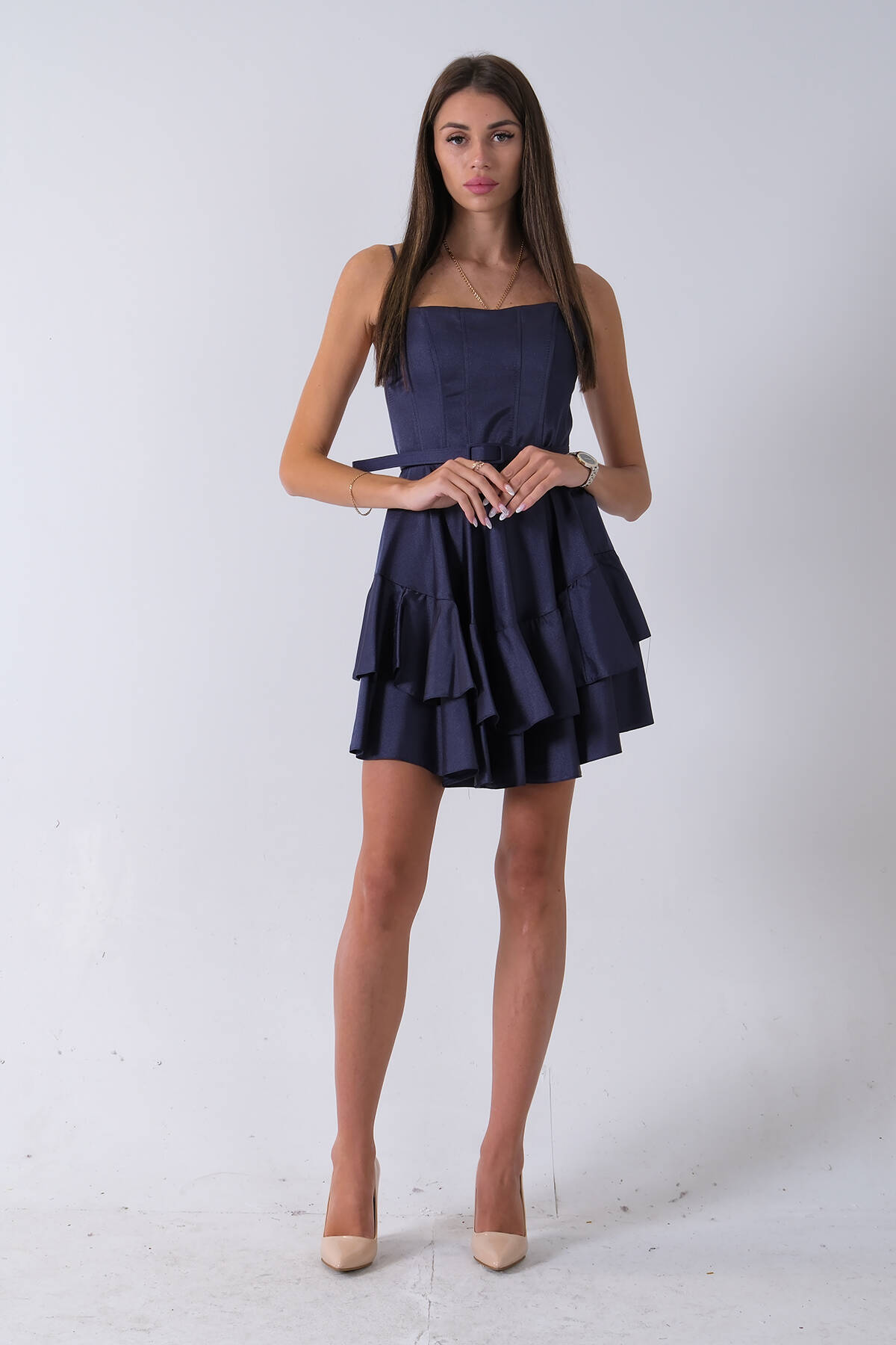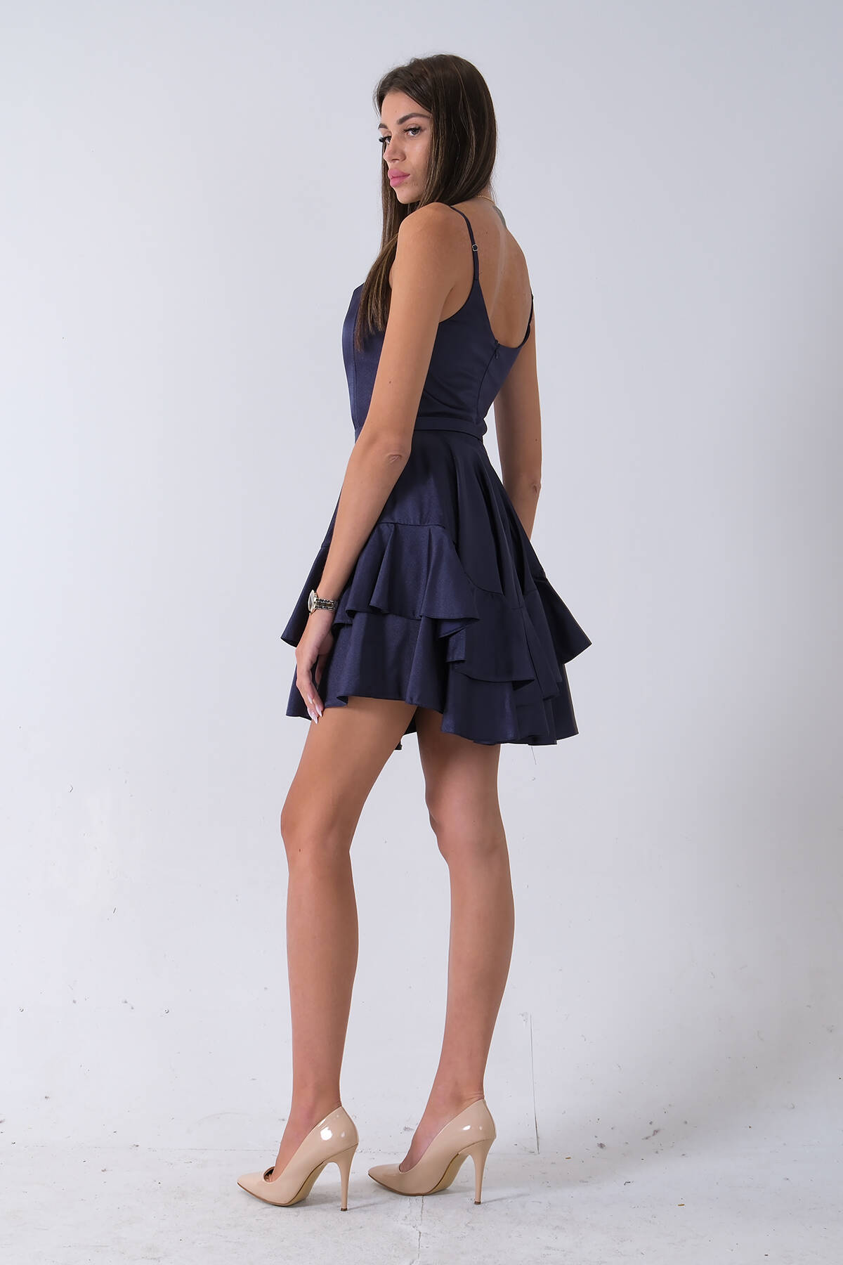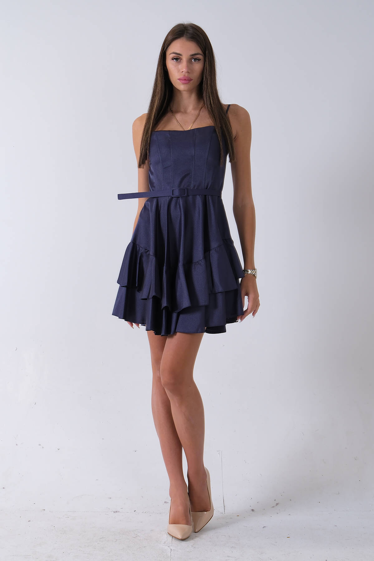 Lacivert İp Askılı Bel Kemer Bağlamalı Mini Boy Abiye 0802004.02