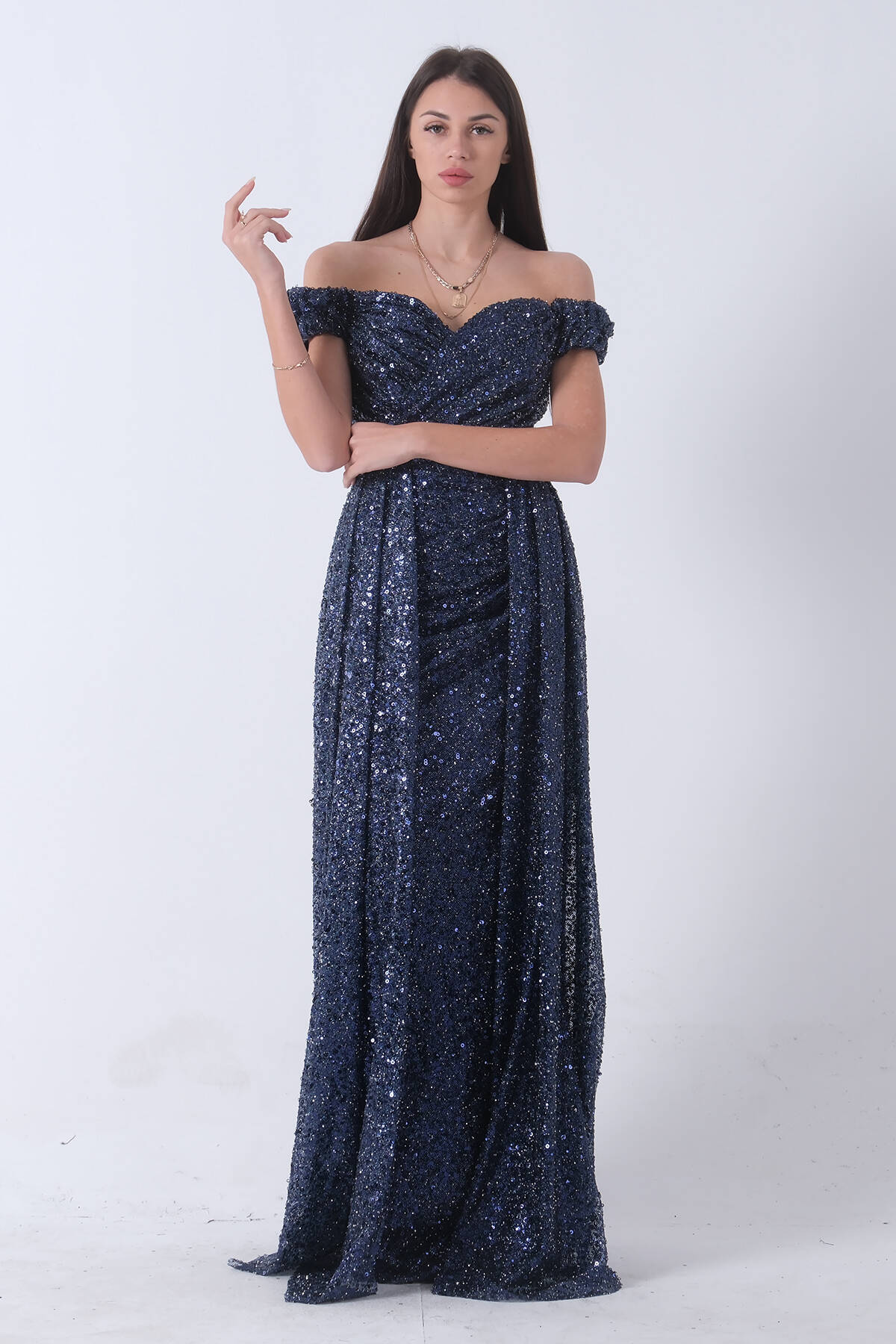 Lacivert Işıltılı Payetli Şık Abiye Elbise 9705357.02