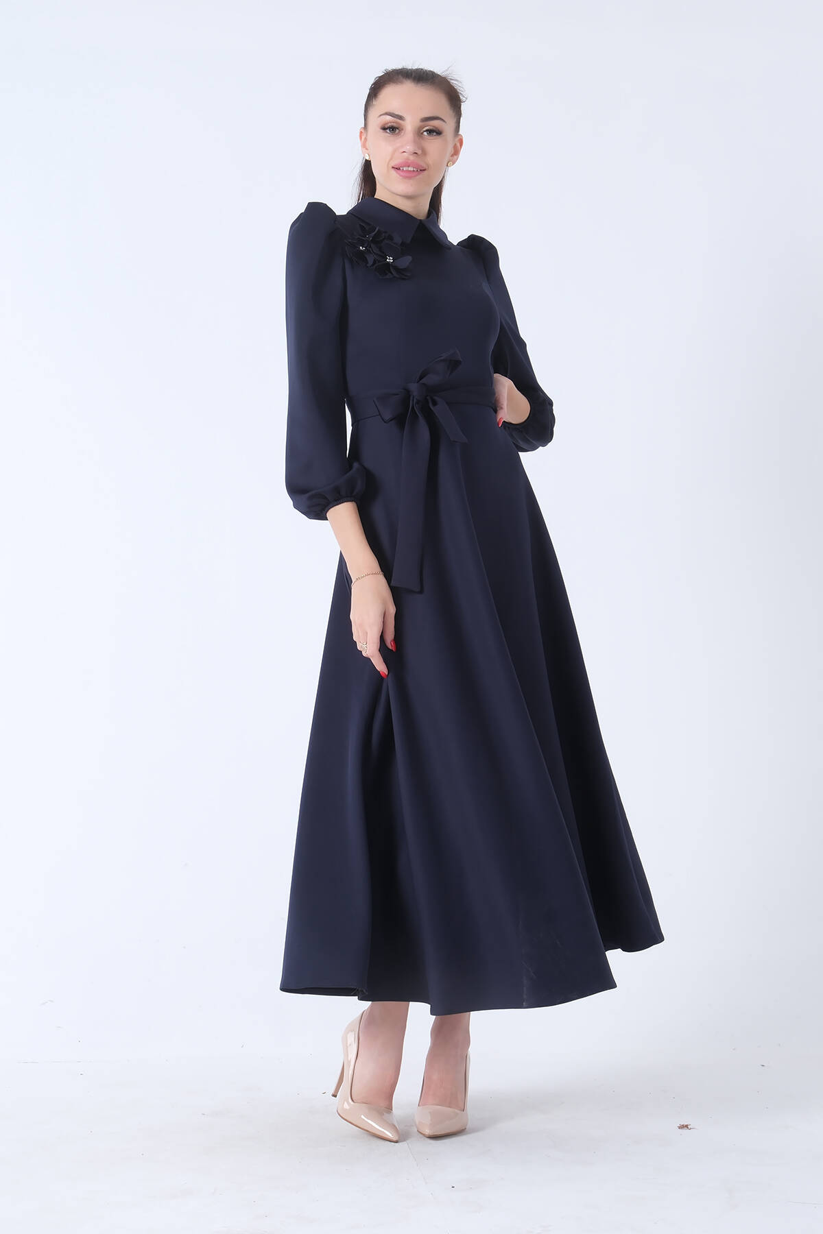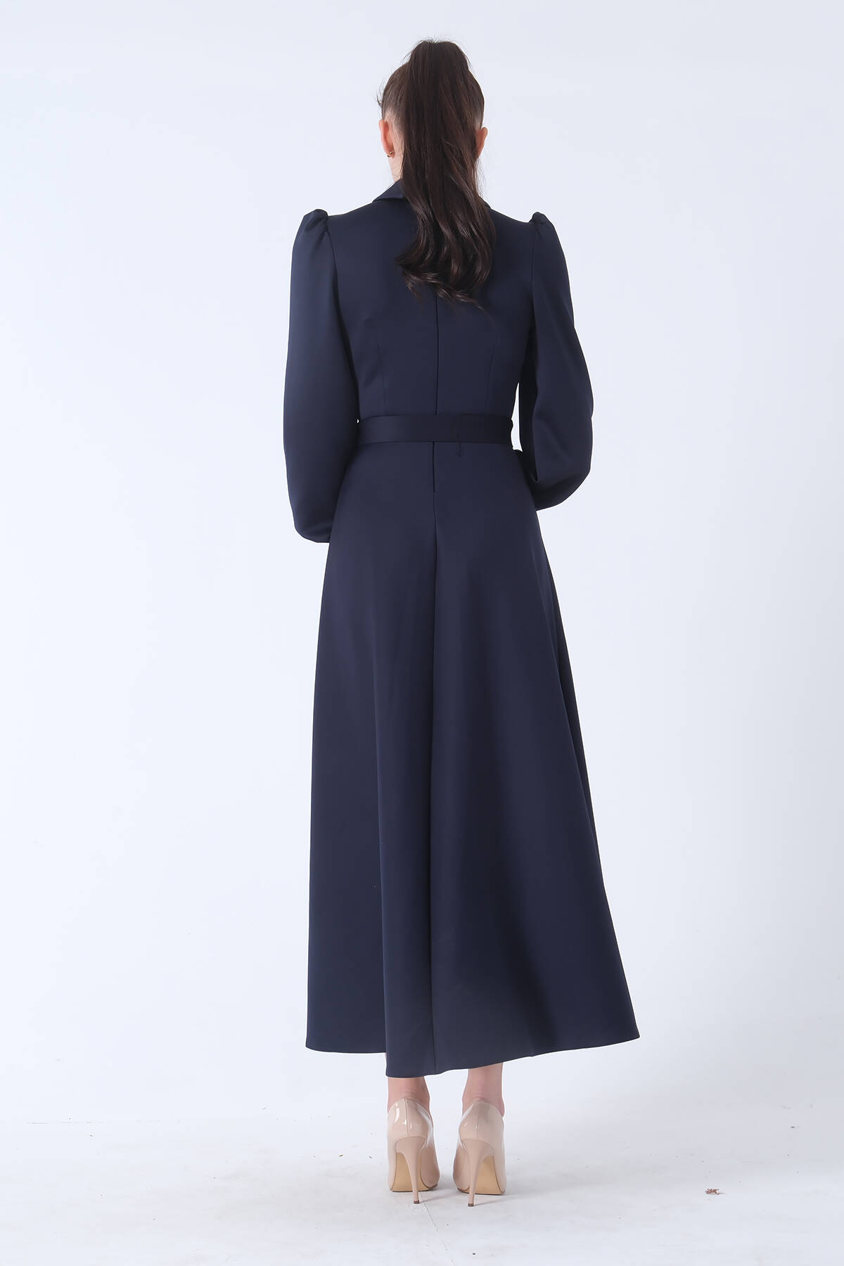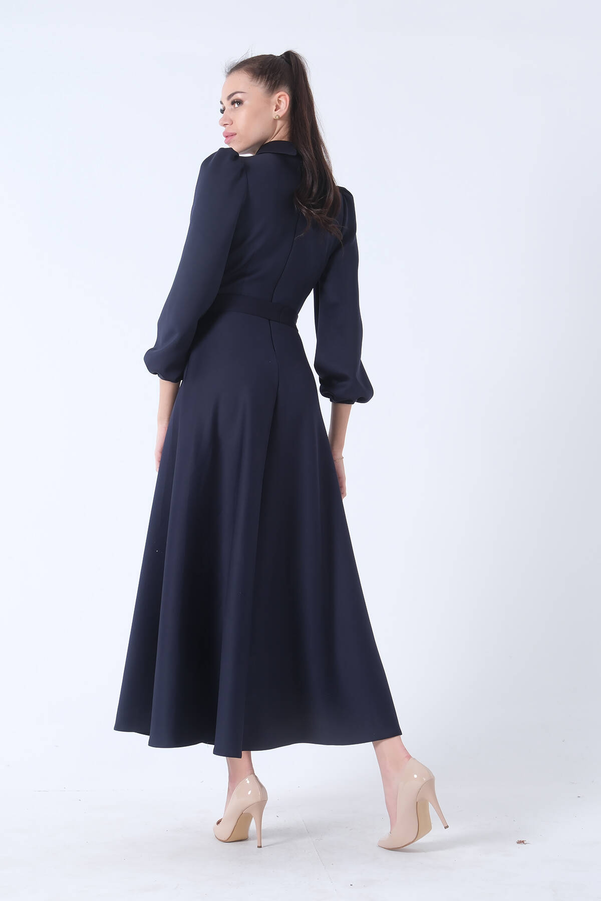 Lacivert Kemer Bağlamalı Kloş Elbise 4593260.02