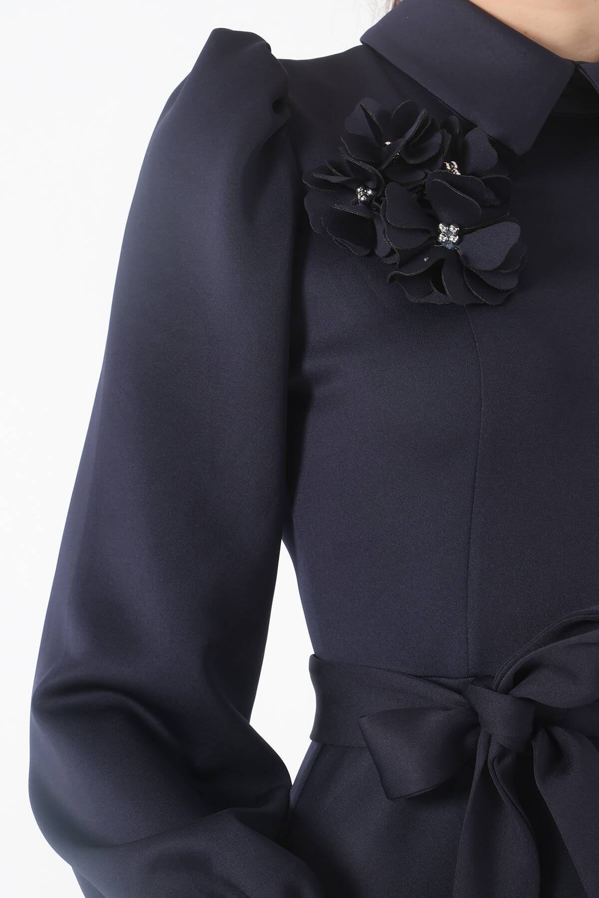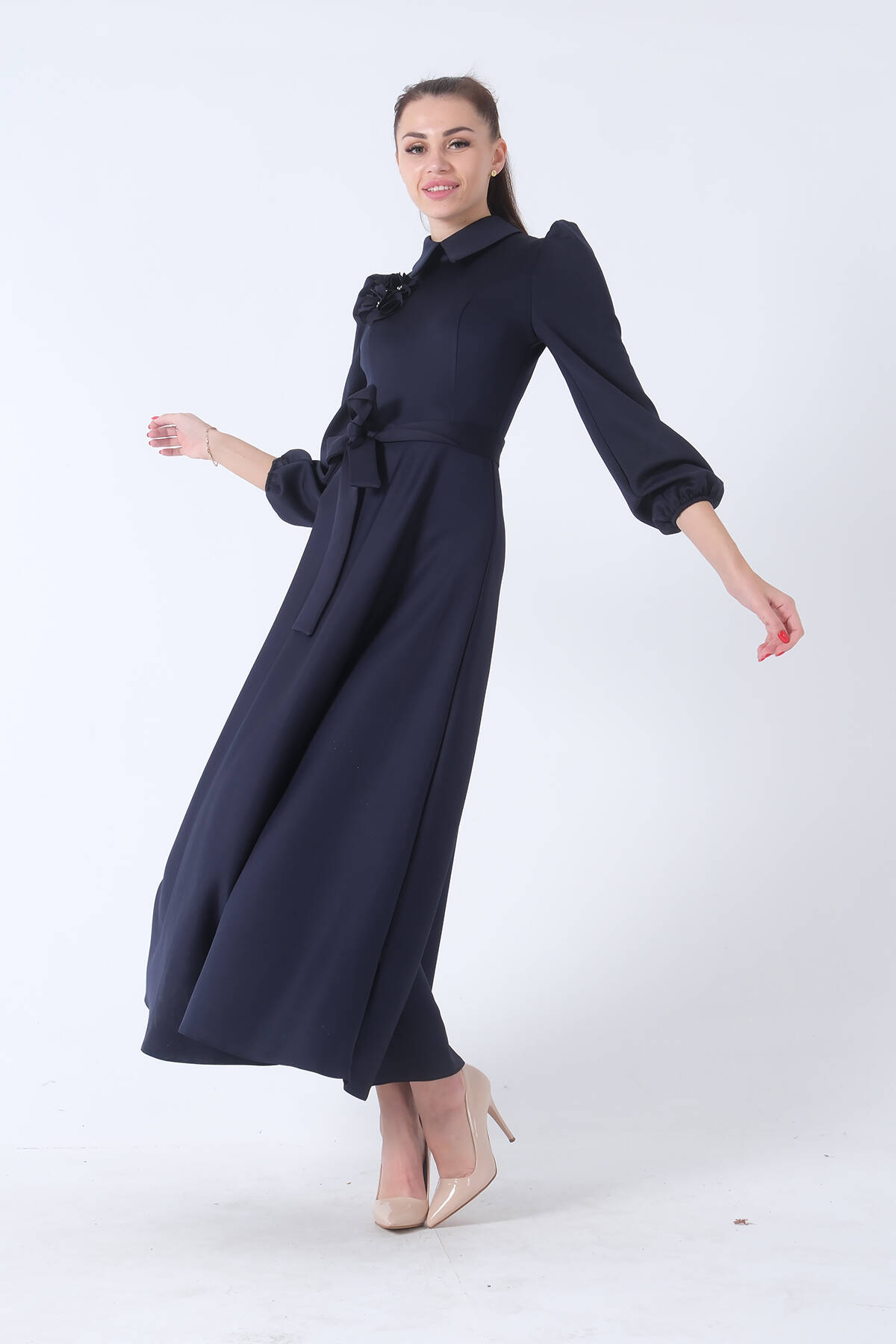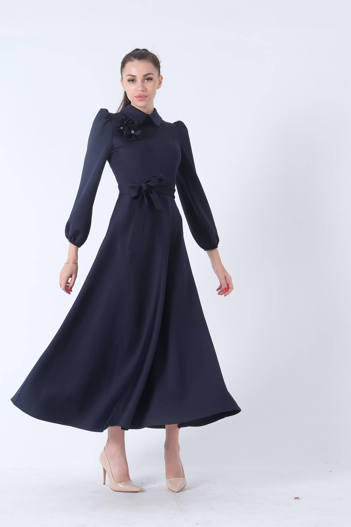 Lacivert Kemer Bağlamalı Kloş Elbise 4593260.02