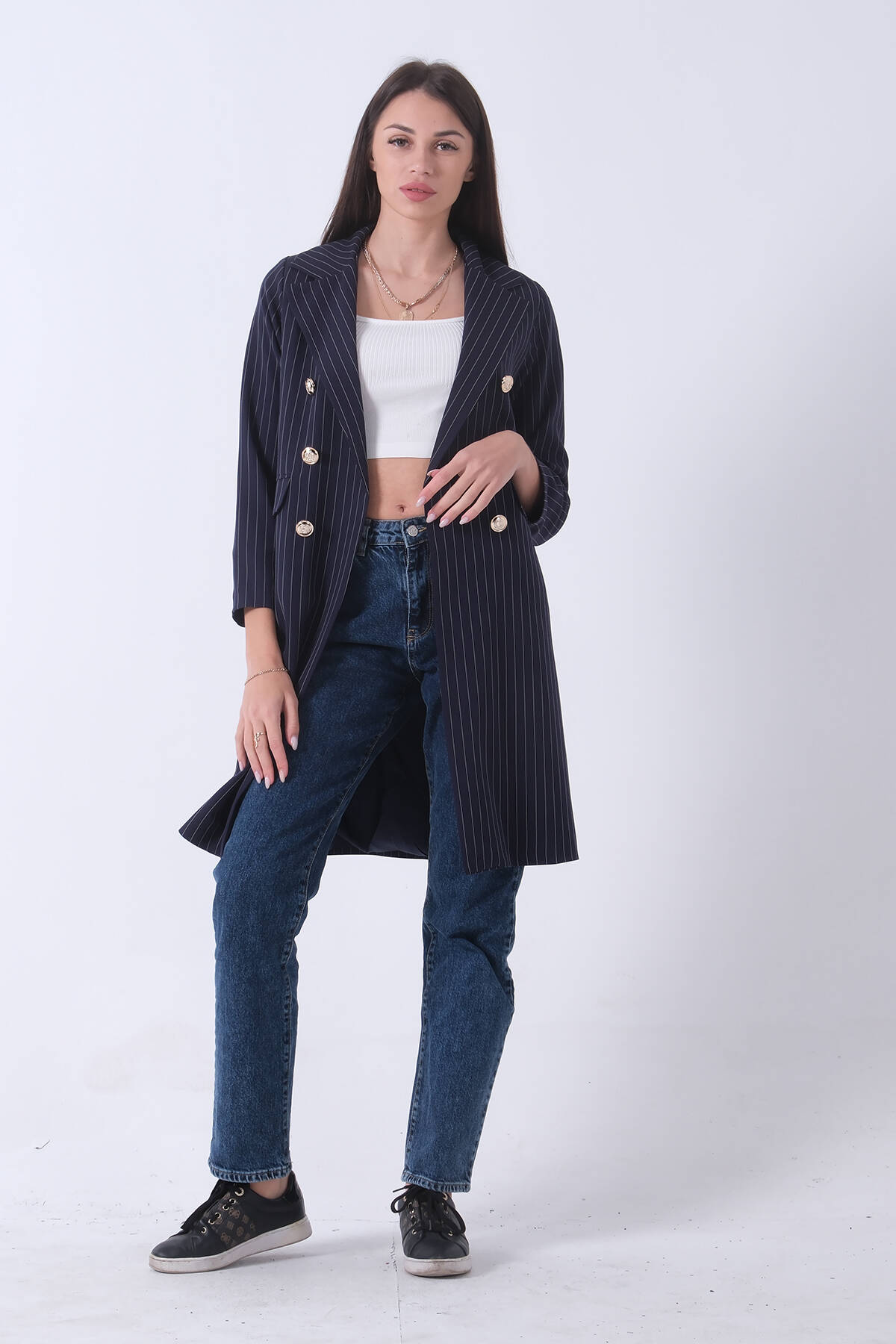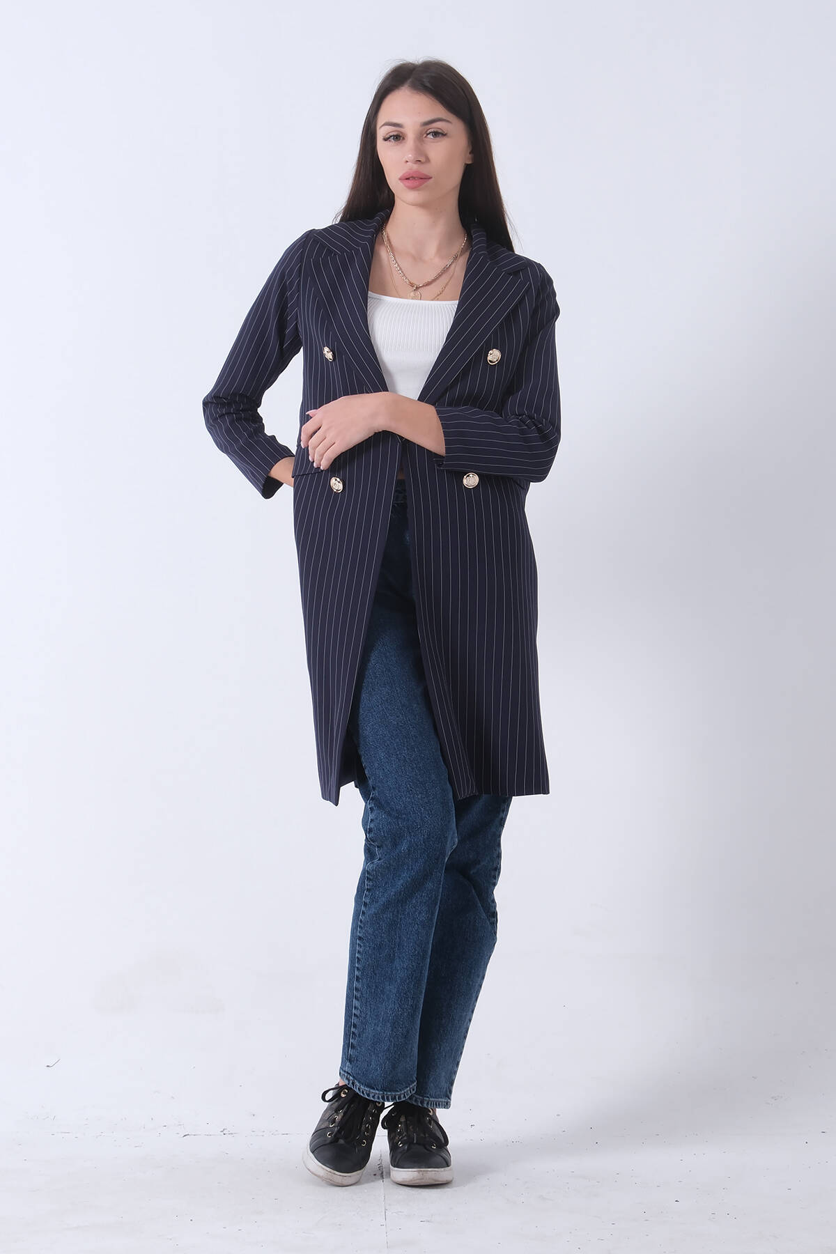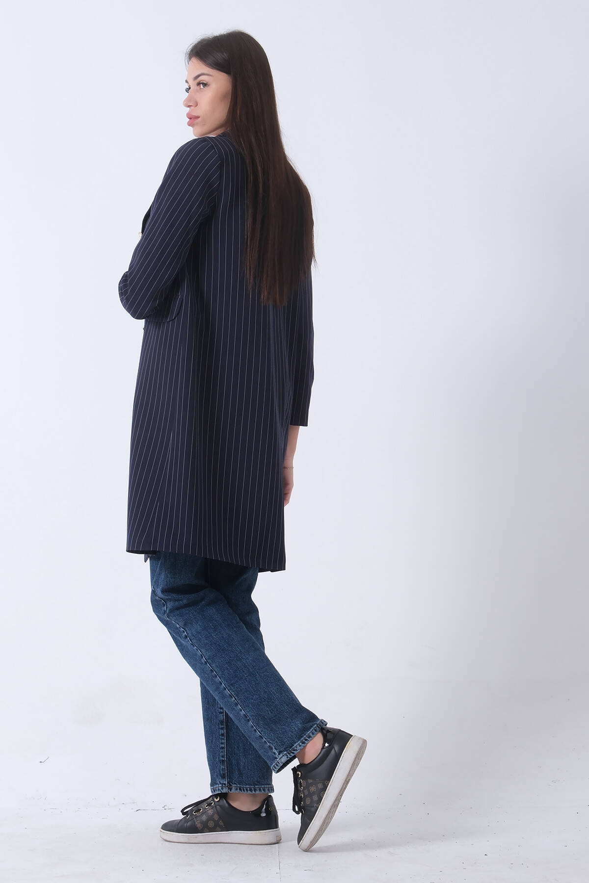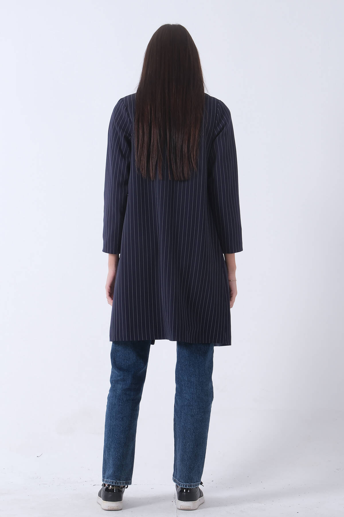 Lacivert Klasik Yaka Çizgili Uzun Ceket 08091161.02