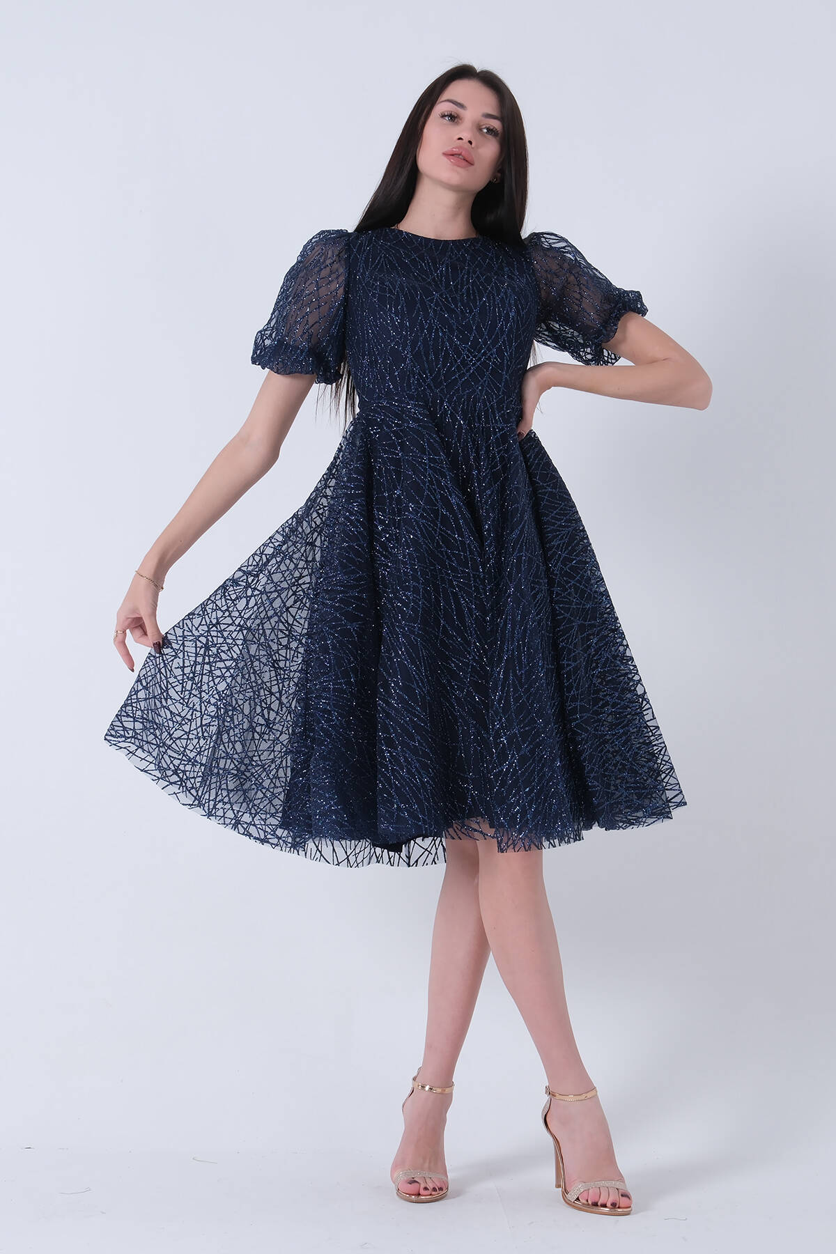 Lacivert Midi Boy Kısa Yuvarlak Yaka Simli Tül Abiye Elbise 6502459.02