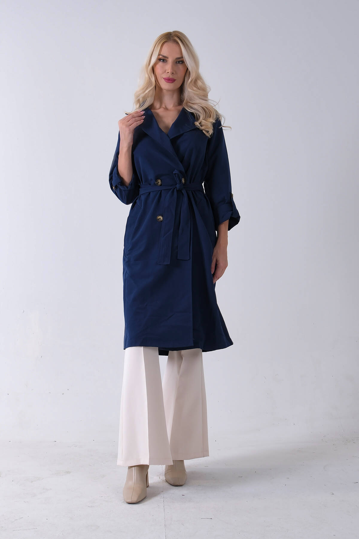 Lacivert Önden Düğme Kapamalı Yandan Cepli Kuşaklı Uzun Trenç 4200823.02