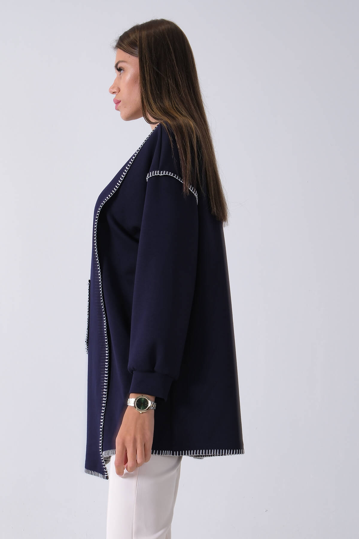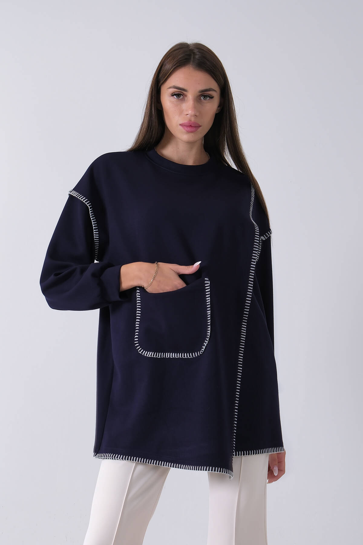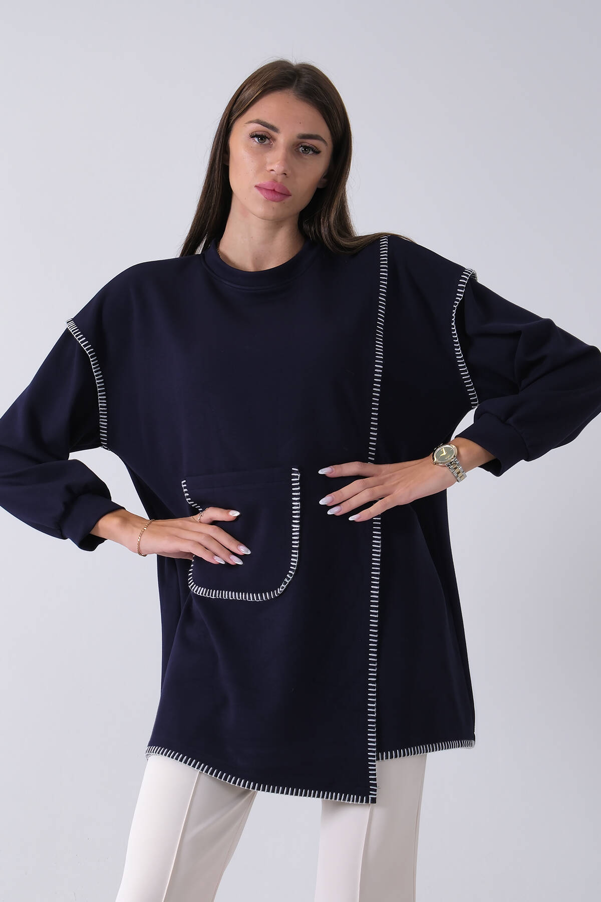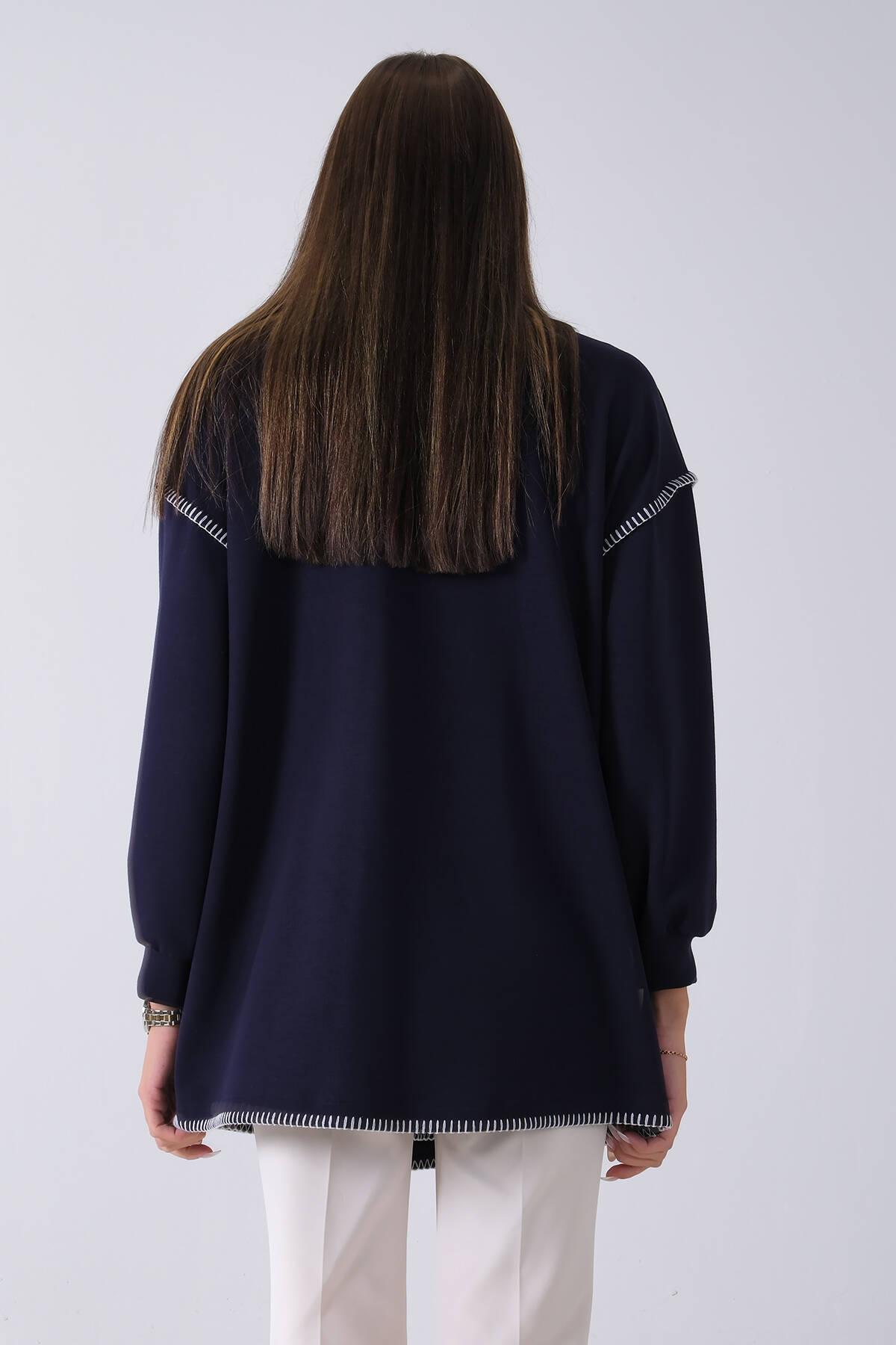 Lacivert Önü Kanguru Cep Detaylı Çizgi Dikişli Bisiklet Yaka Tunik 940170263.02