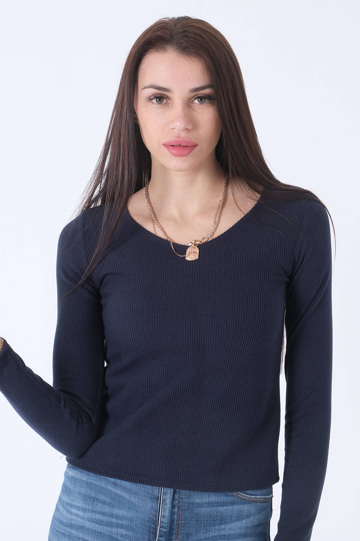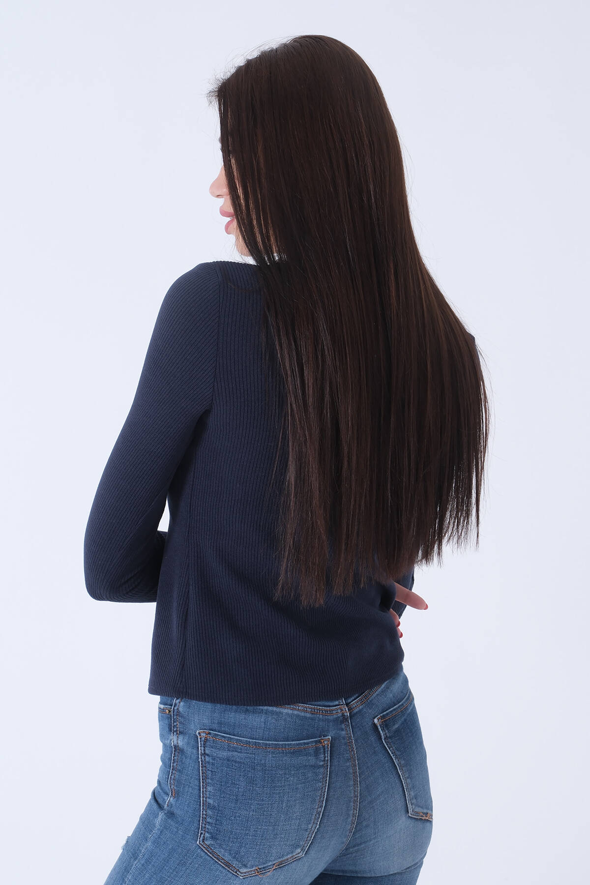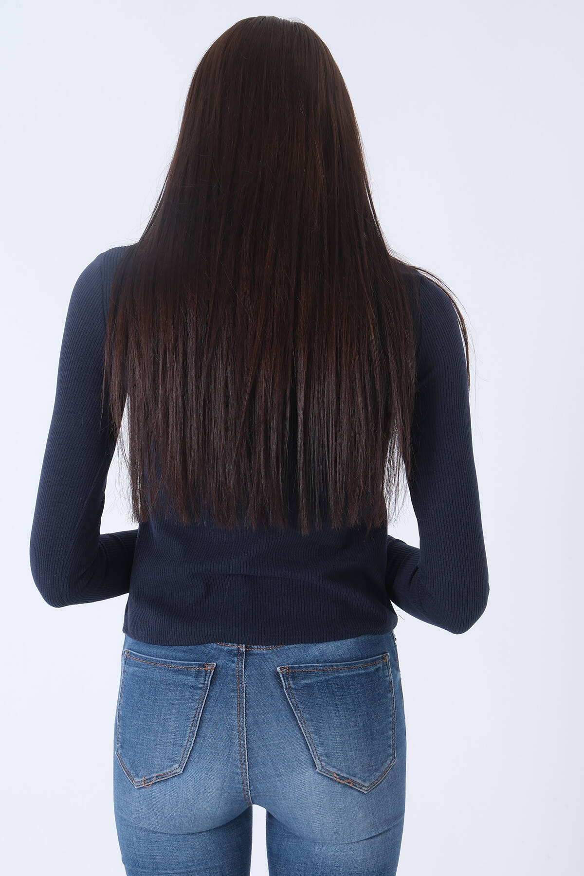 Lacivert Yaka ve Kolları Taş Detaylı Bisiklet Yaka Kazak 44530206.02
