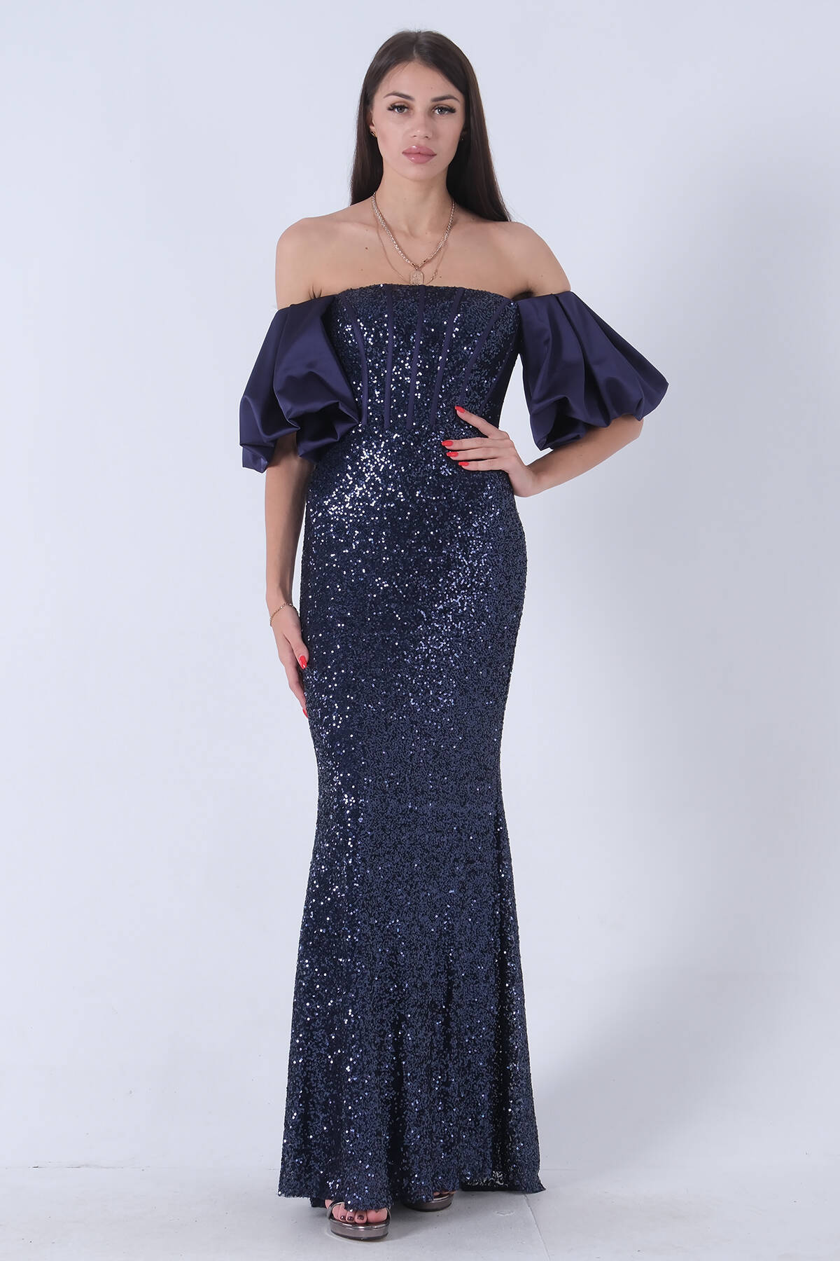 Lacivert Pul Payetli Balon Kol Abiye 9705296.02