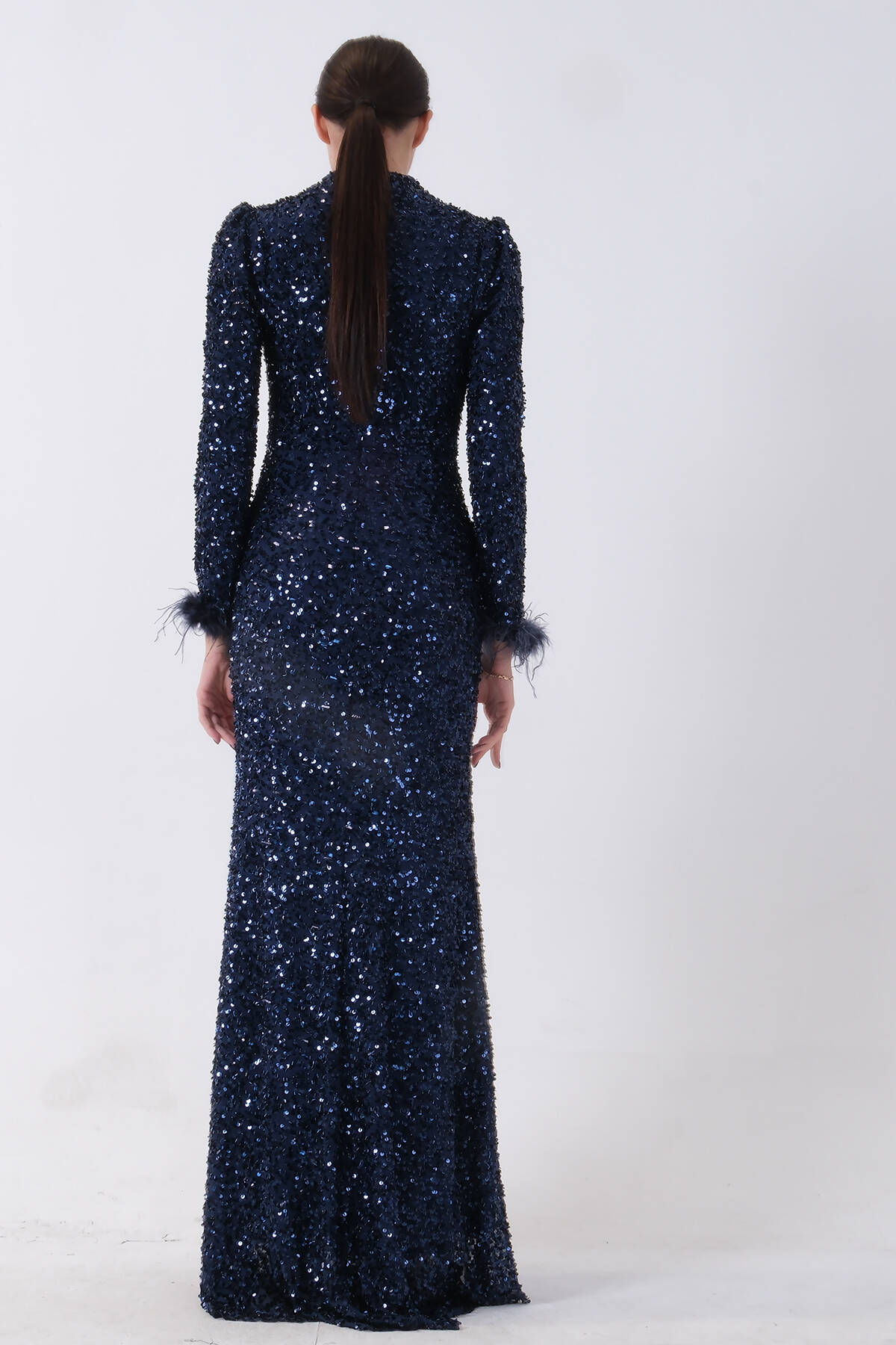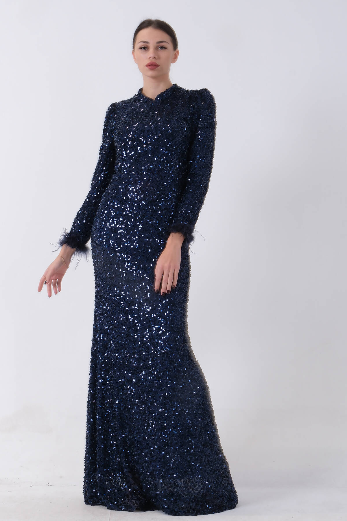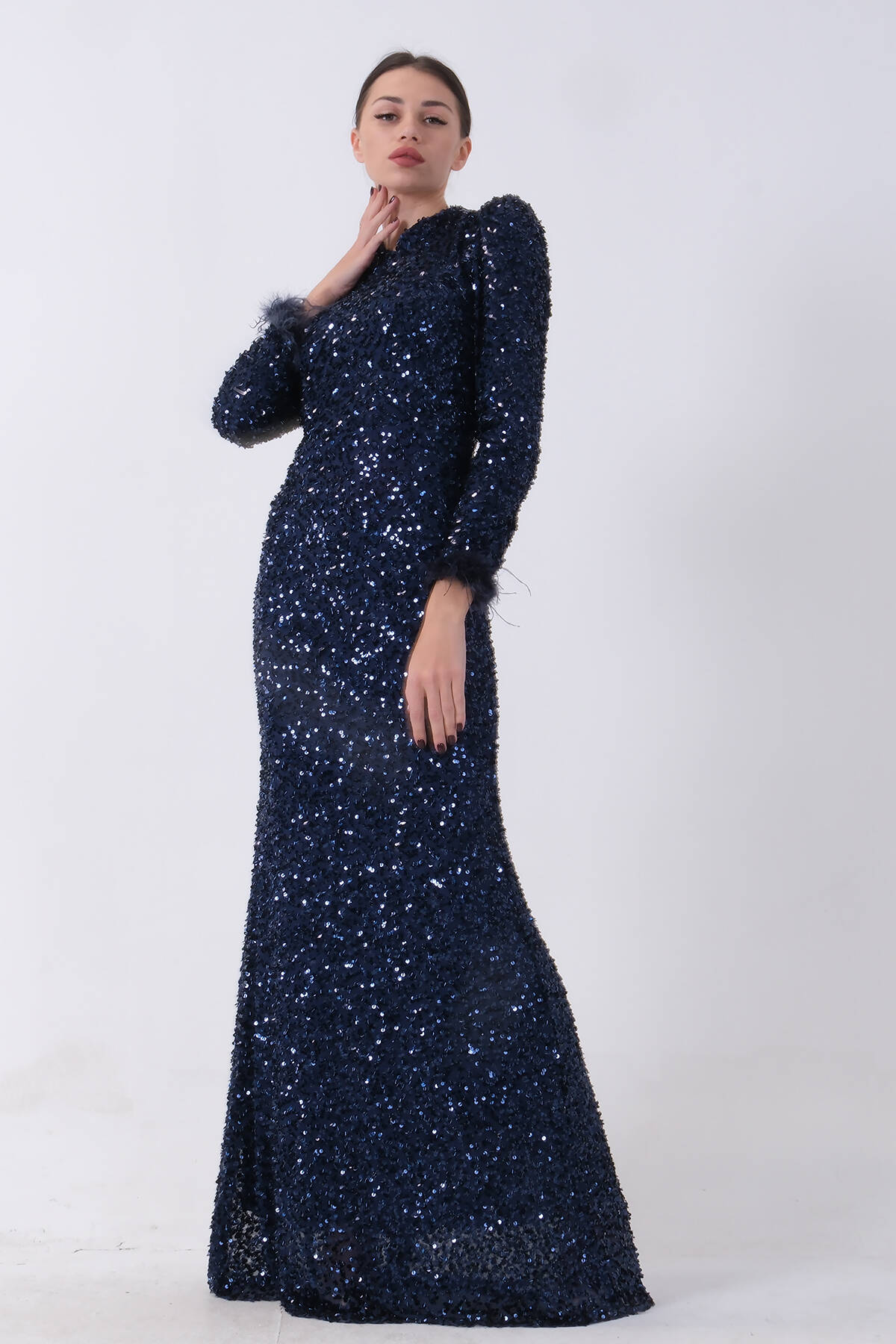 Lacivert Bilek Ucu Tüylü Pul Payetli Tesettür Abiye 6502496.02