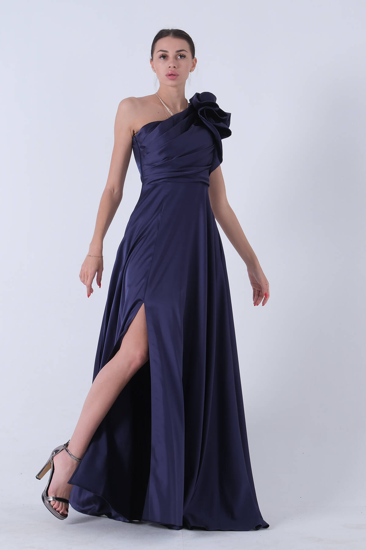 Lacivert Saten Omuz Fiyonklu Abiye Elbise 1302192.02