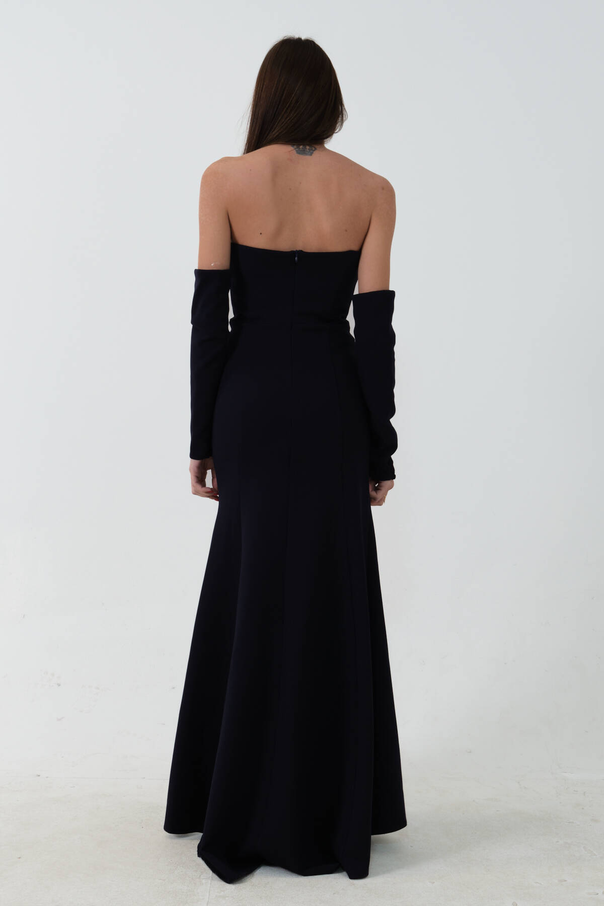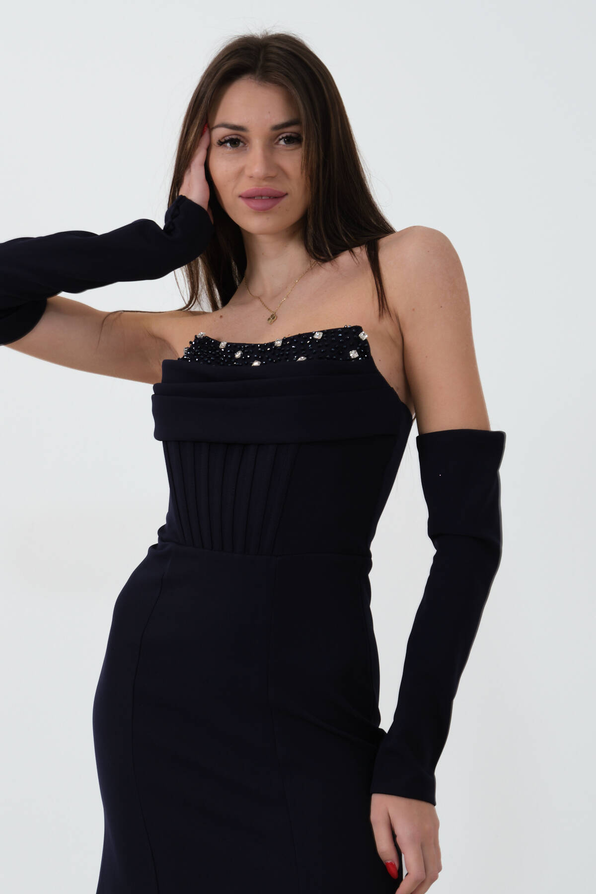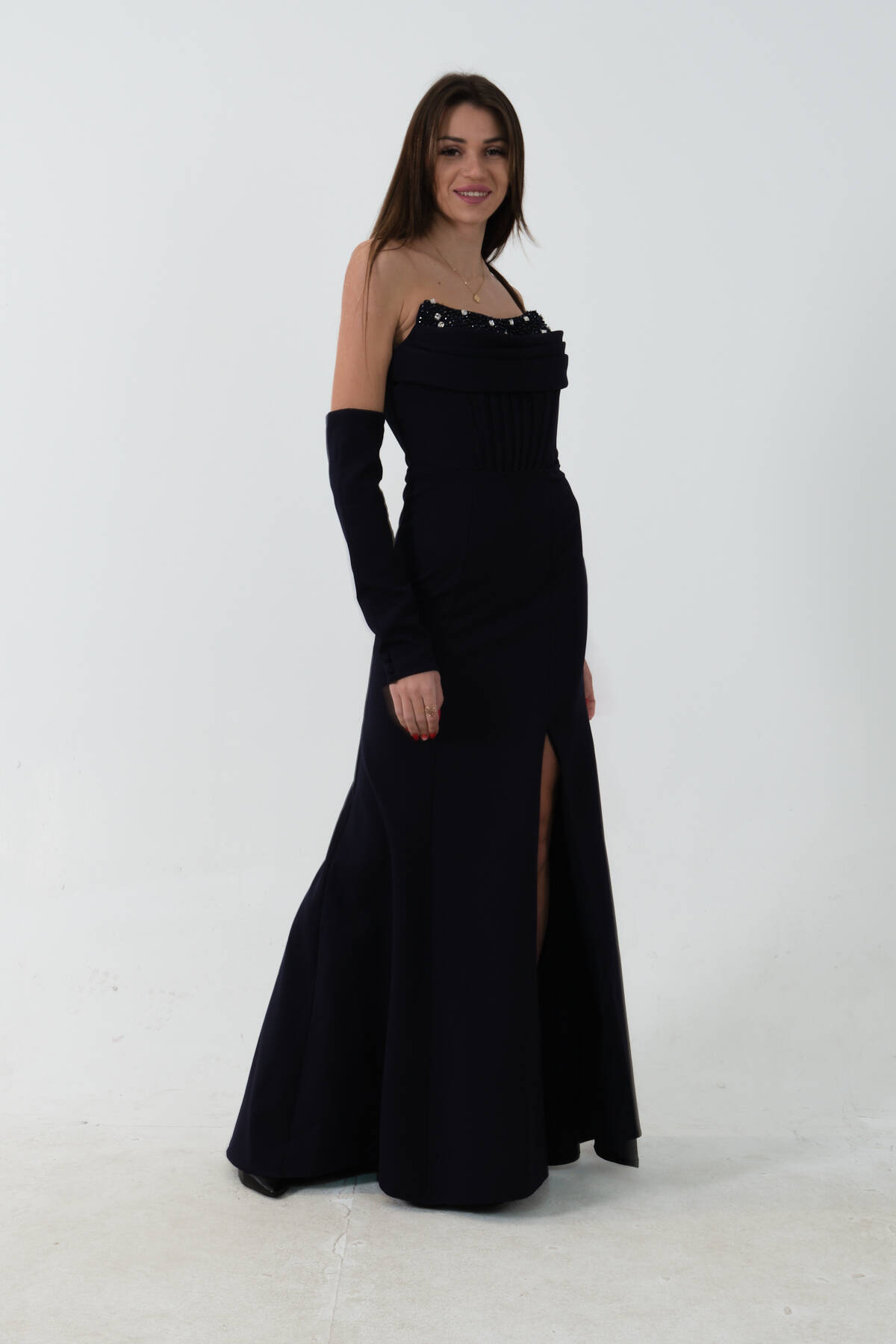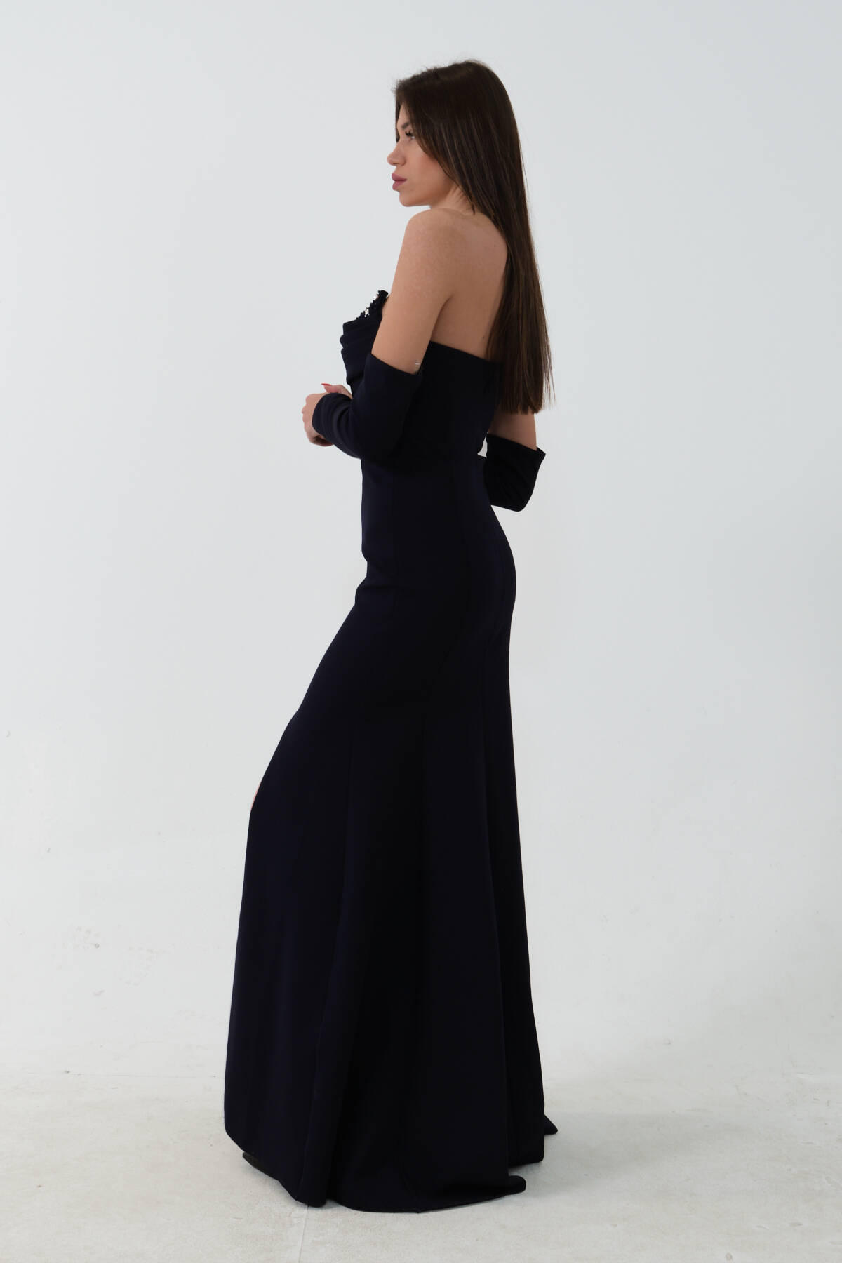 Lacivert Takma Kol Önü Drapeli Taş Detaylı Yırtmaçlı Abiye 0801146.02