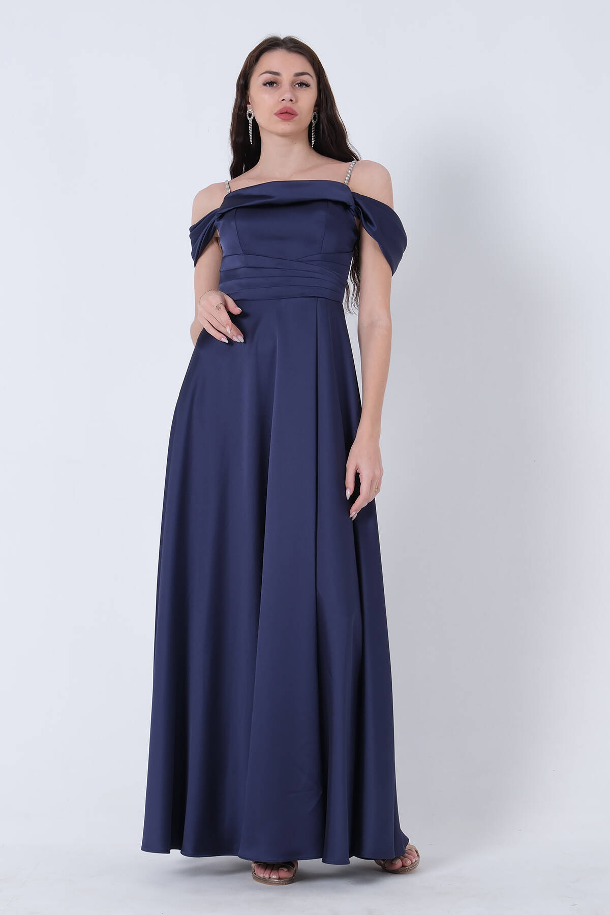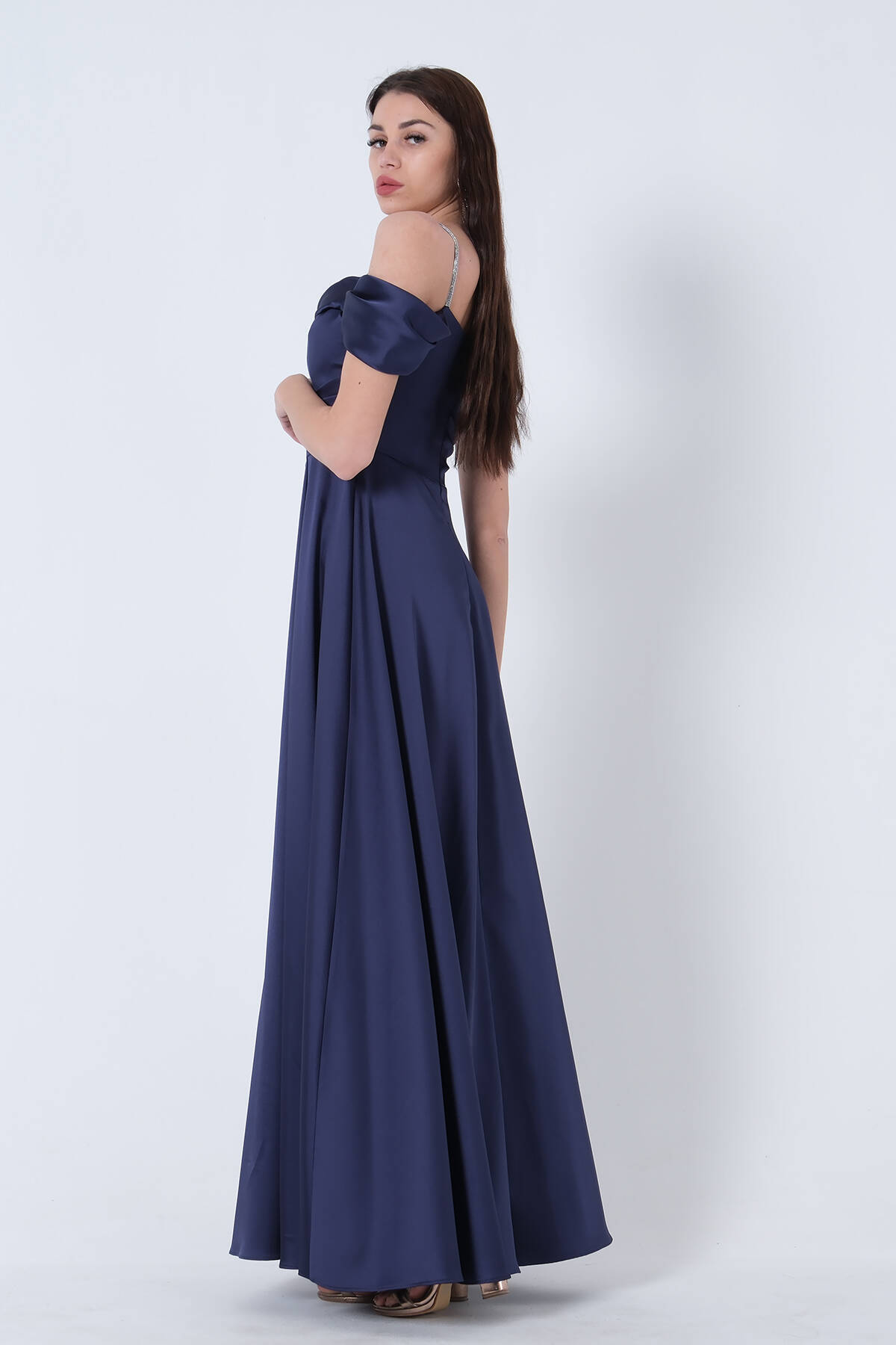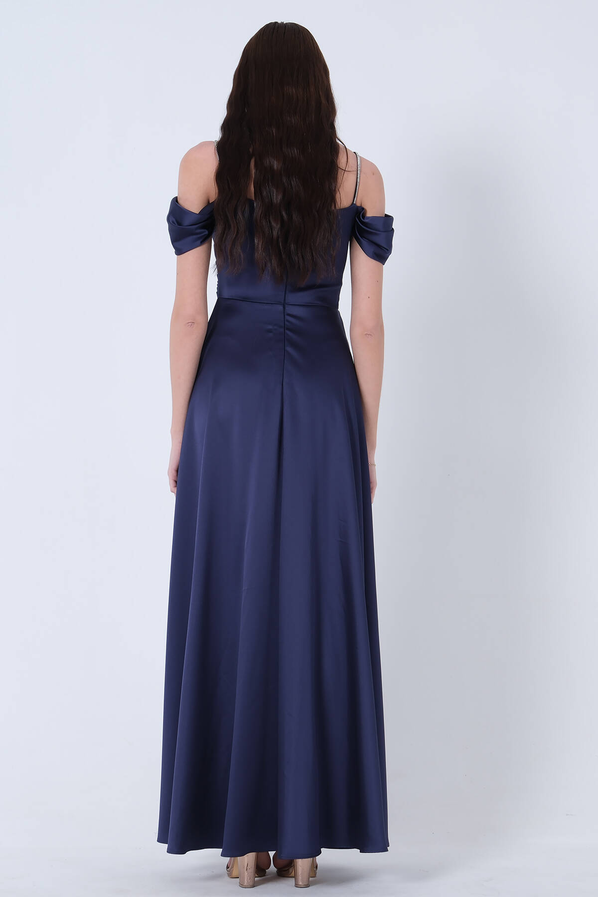 Lacivert Taş Askılı Düşük Kol Saten Abiye 0806118.02