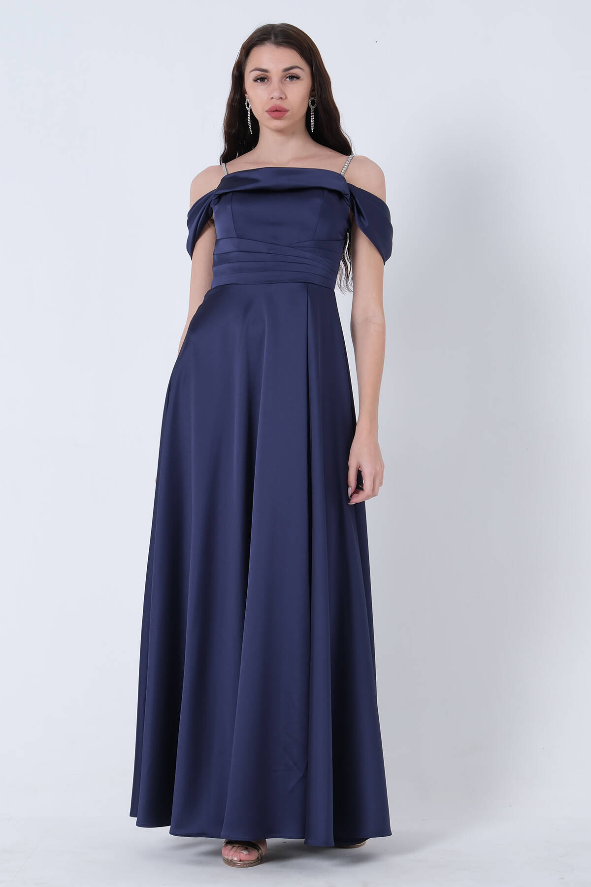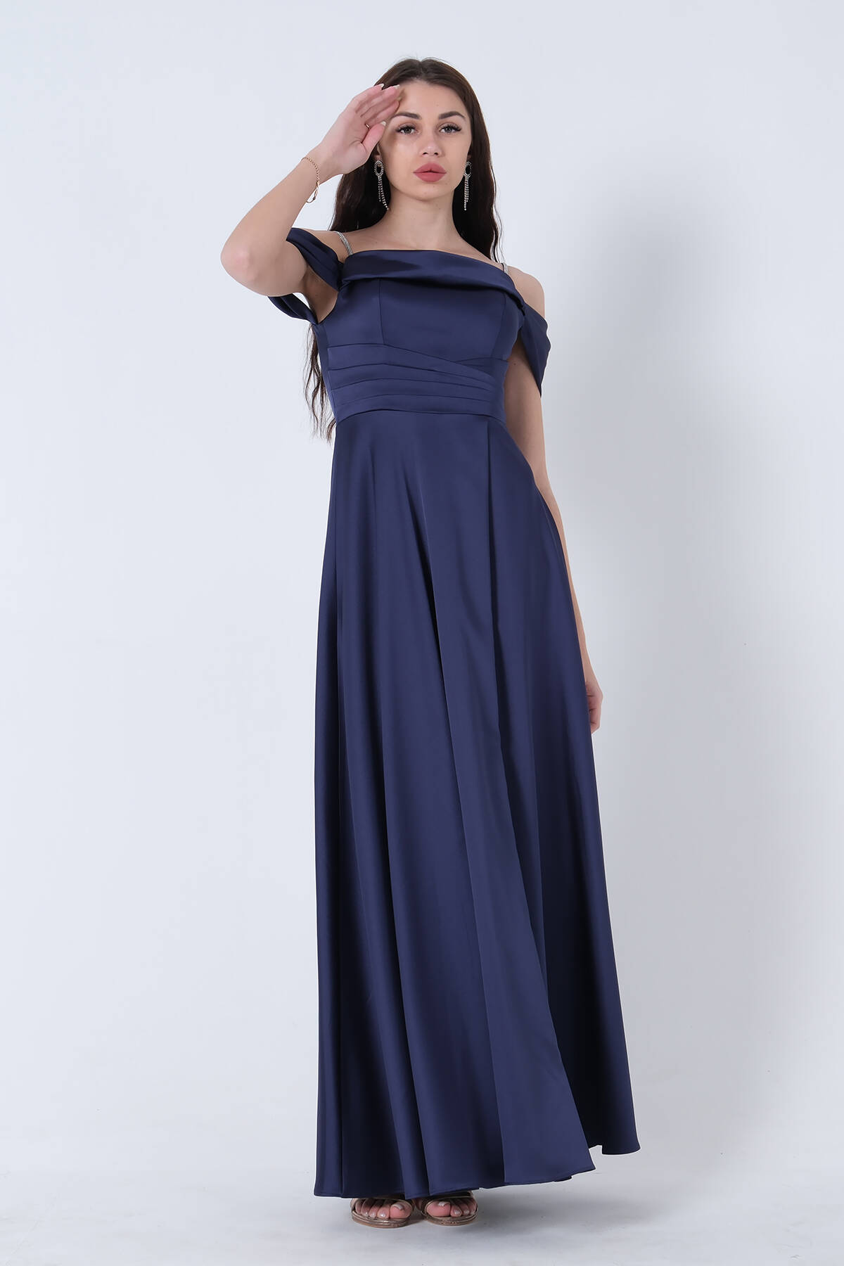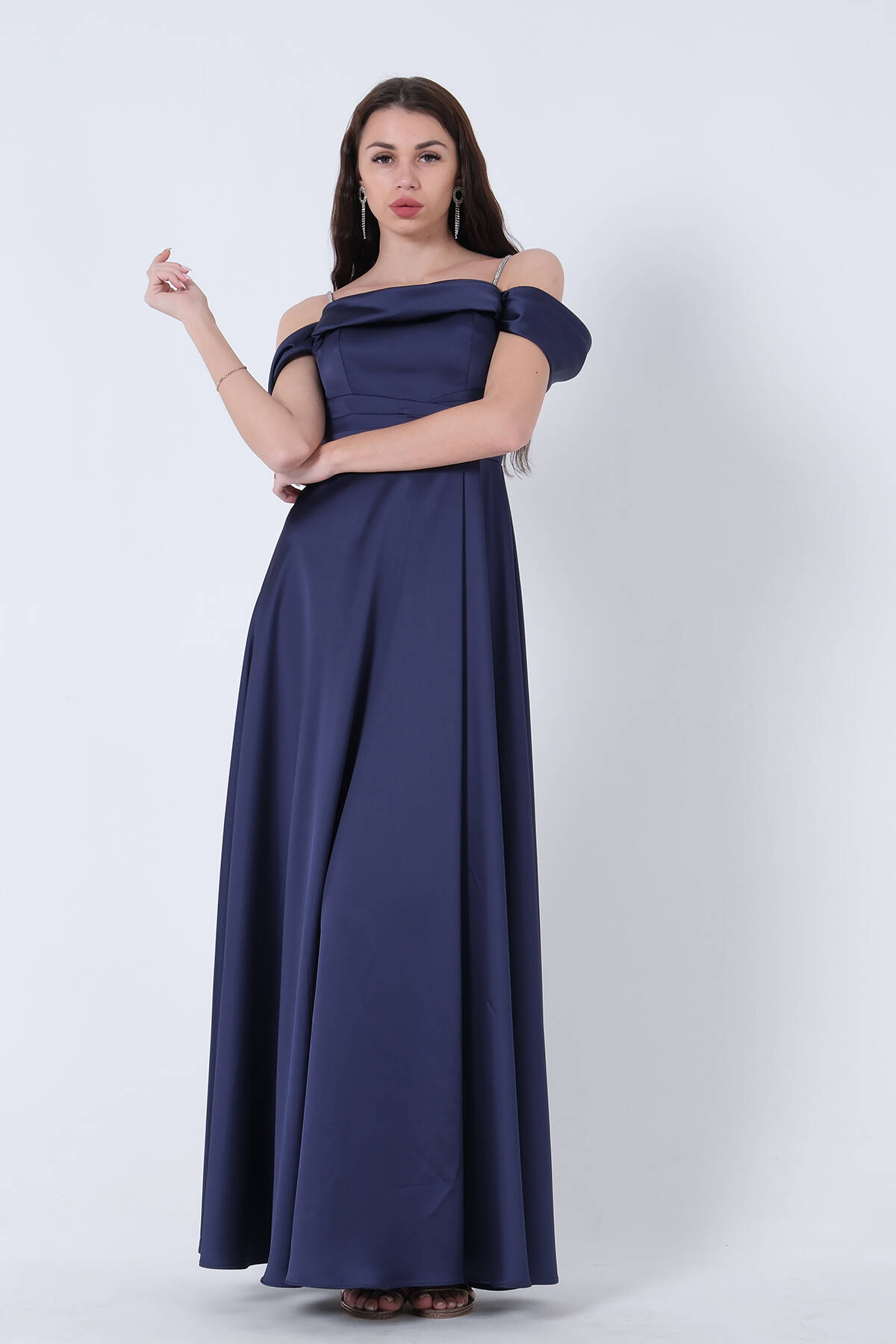 Lacivert Taş Askılı Düşük Kol Saten Abiye 0806118.02