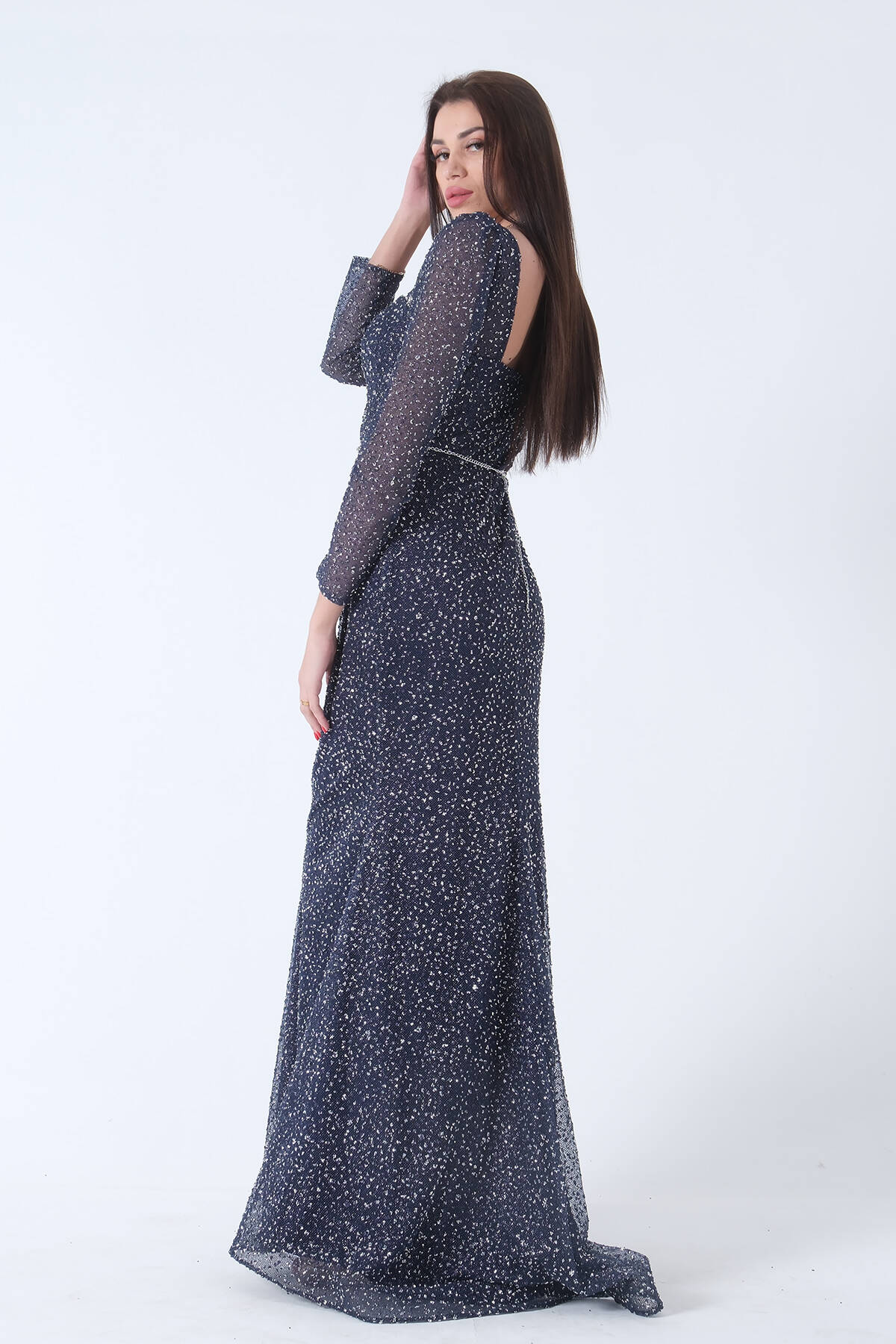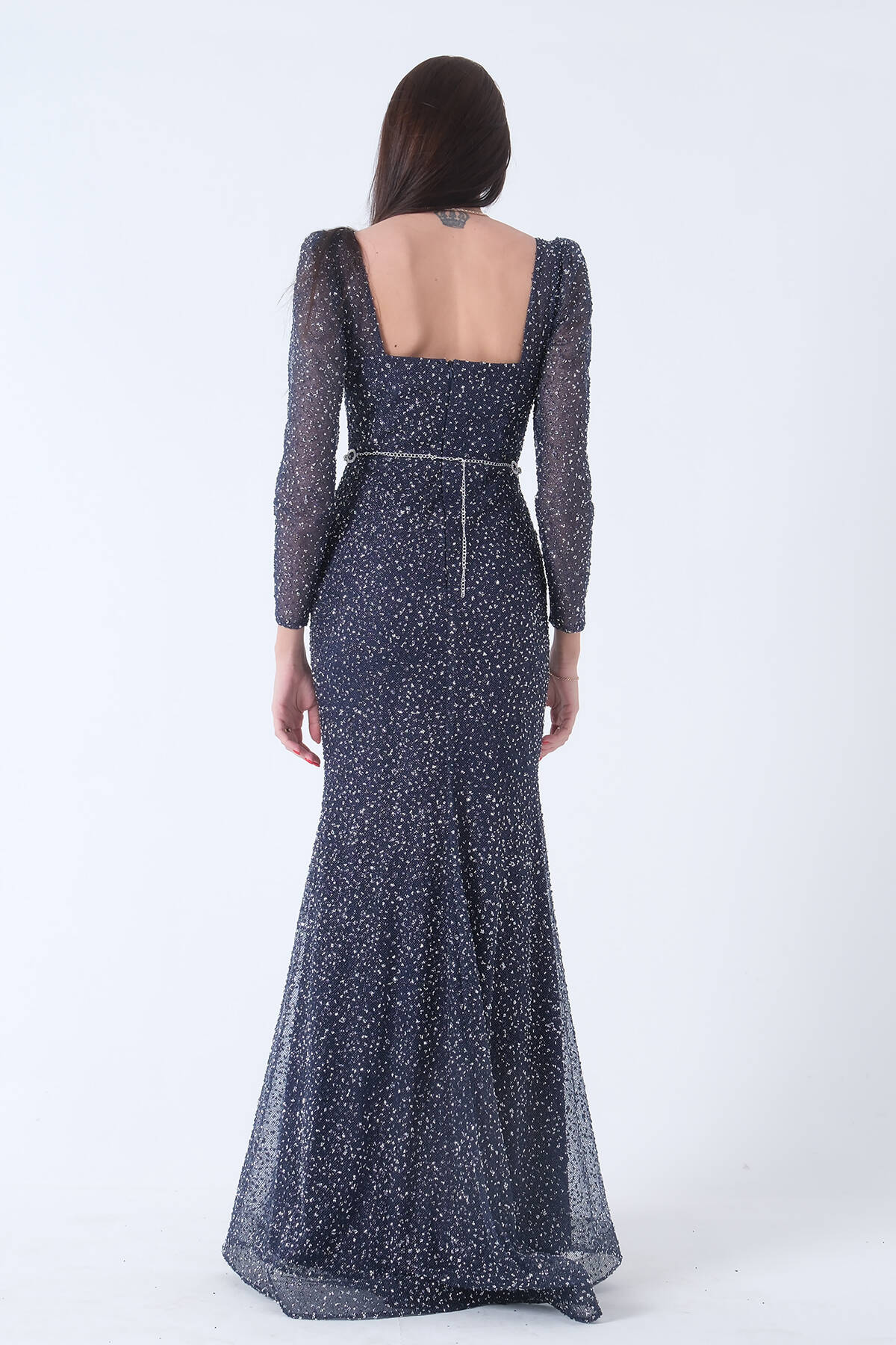 Lacivert Taş İşlemeli Balık Abiye Elbise 9705141.02