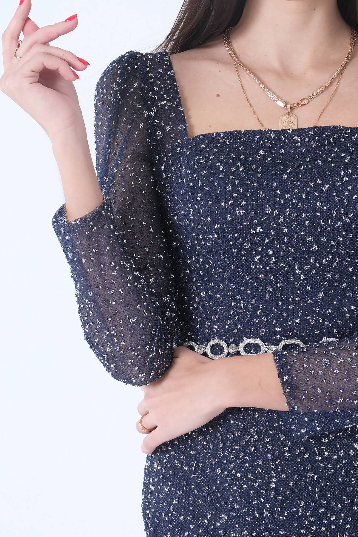 Bebe Mavi Önü Taş Detaylı Yırtmaçlı Pul Payet Straplez Abiye 0801163.449