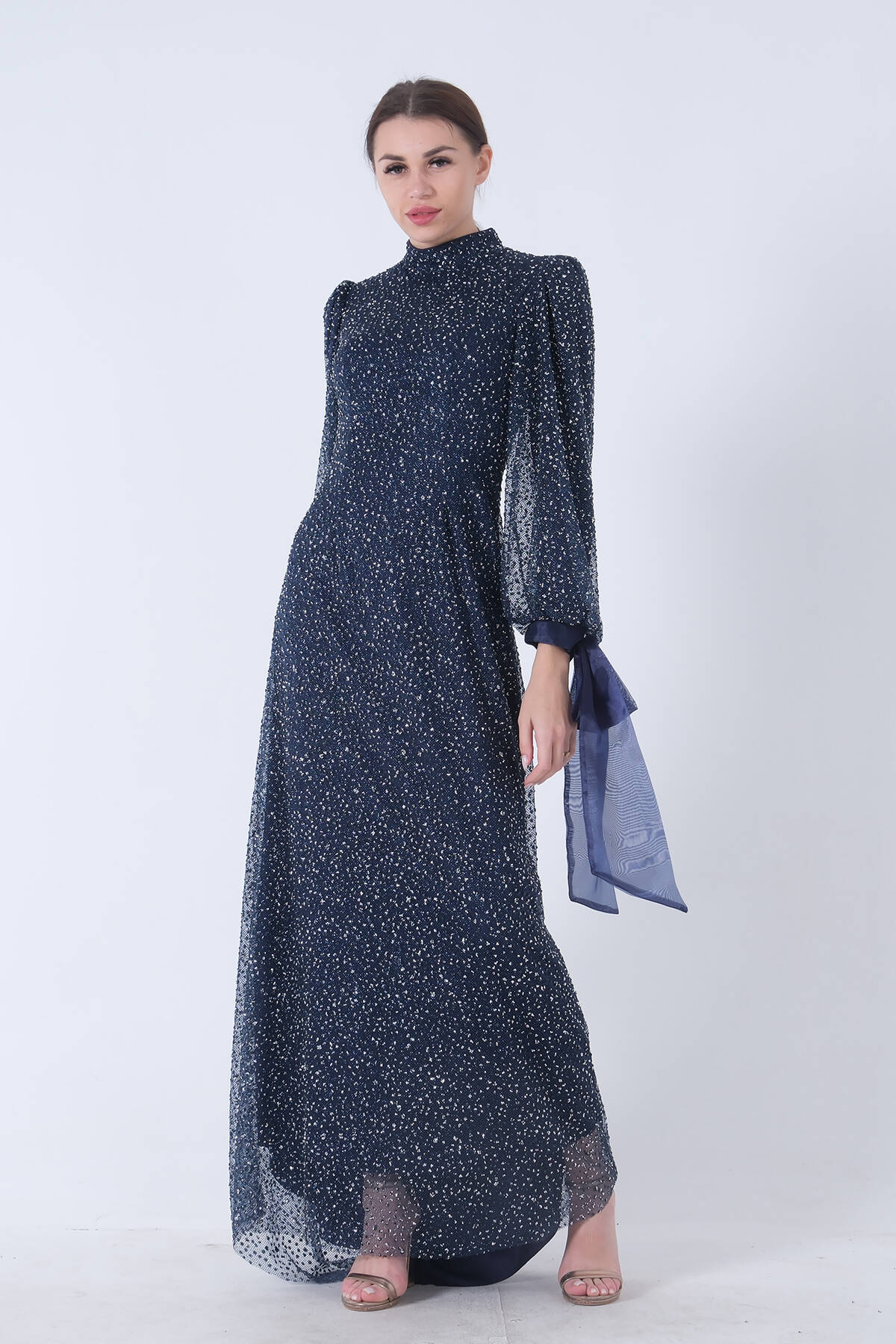 Lacivert Taş İşlemeli Uzun Balık Abiye 0801056.02