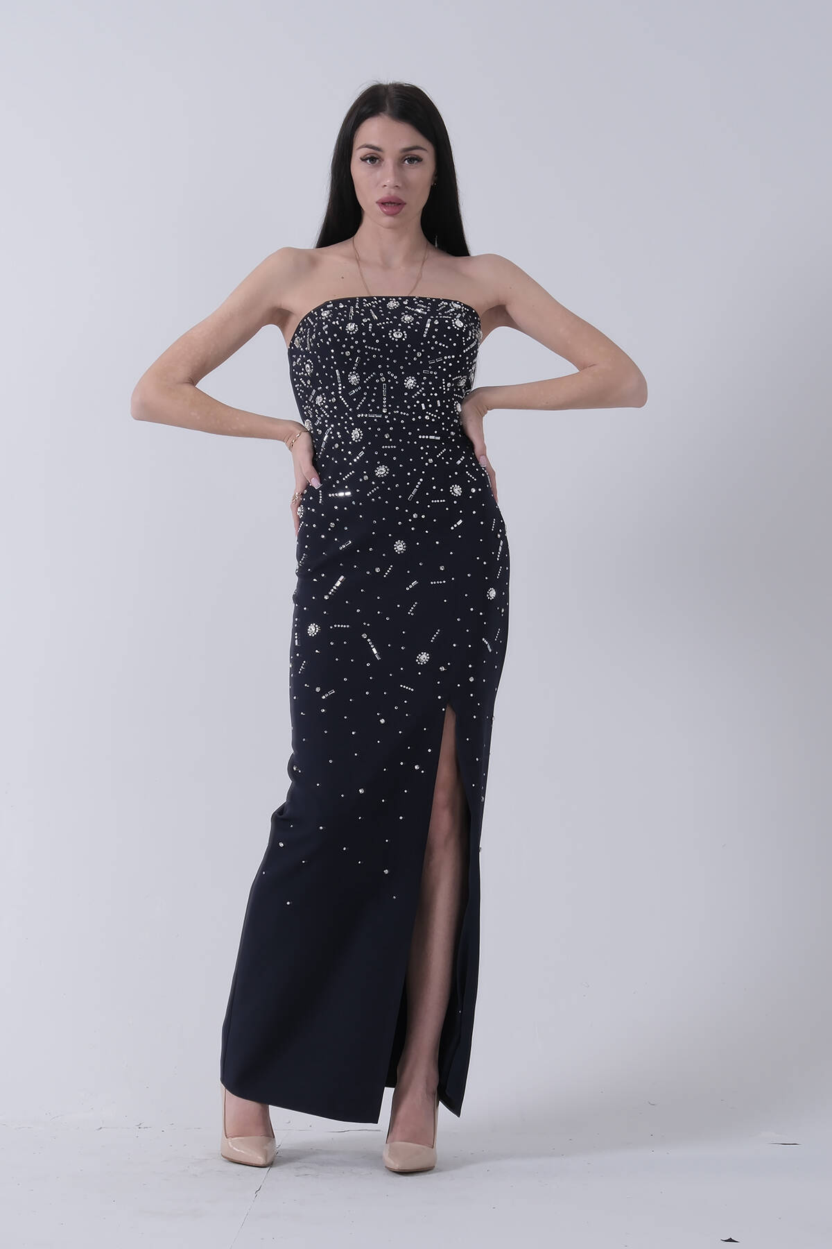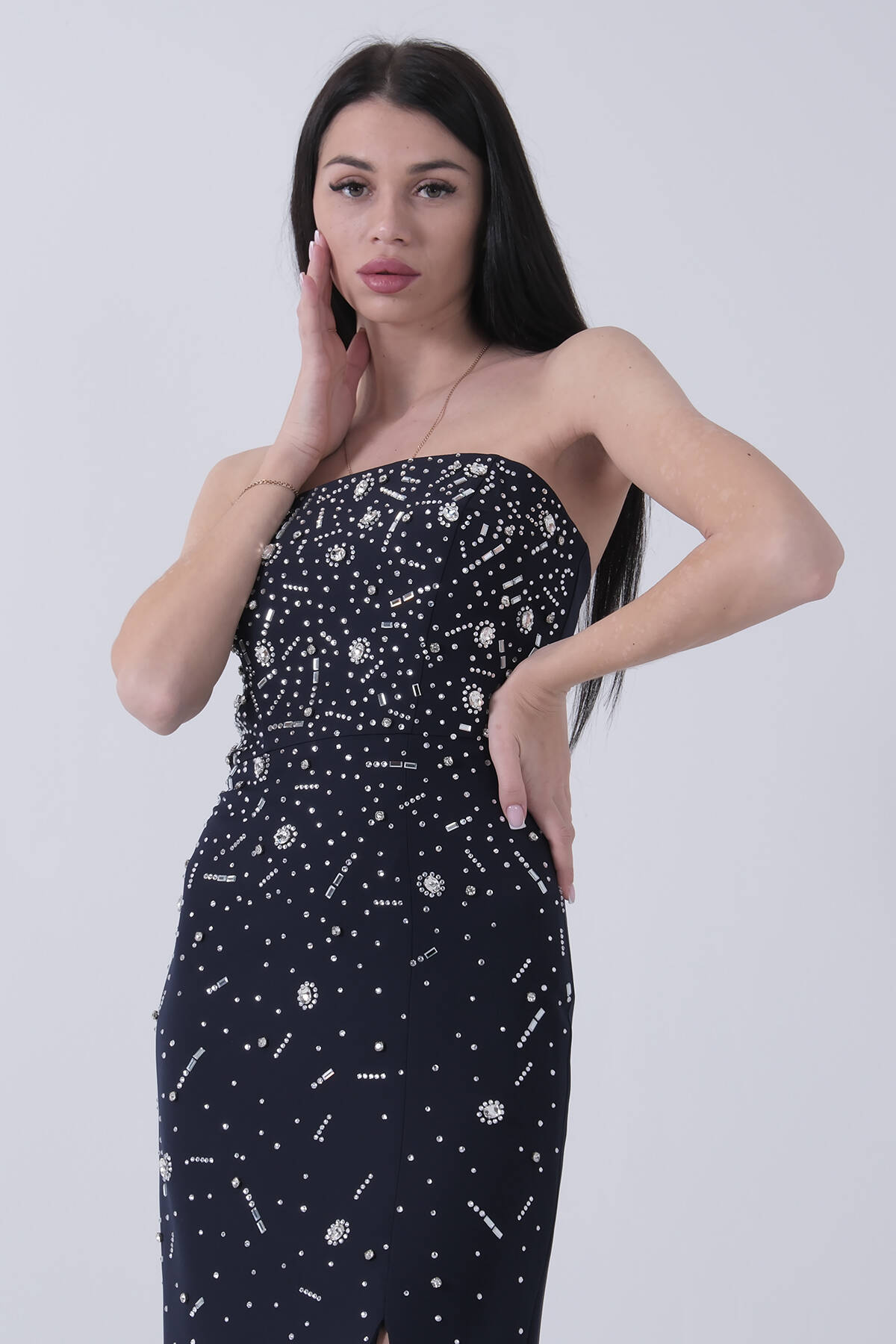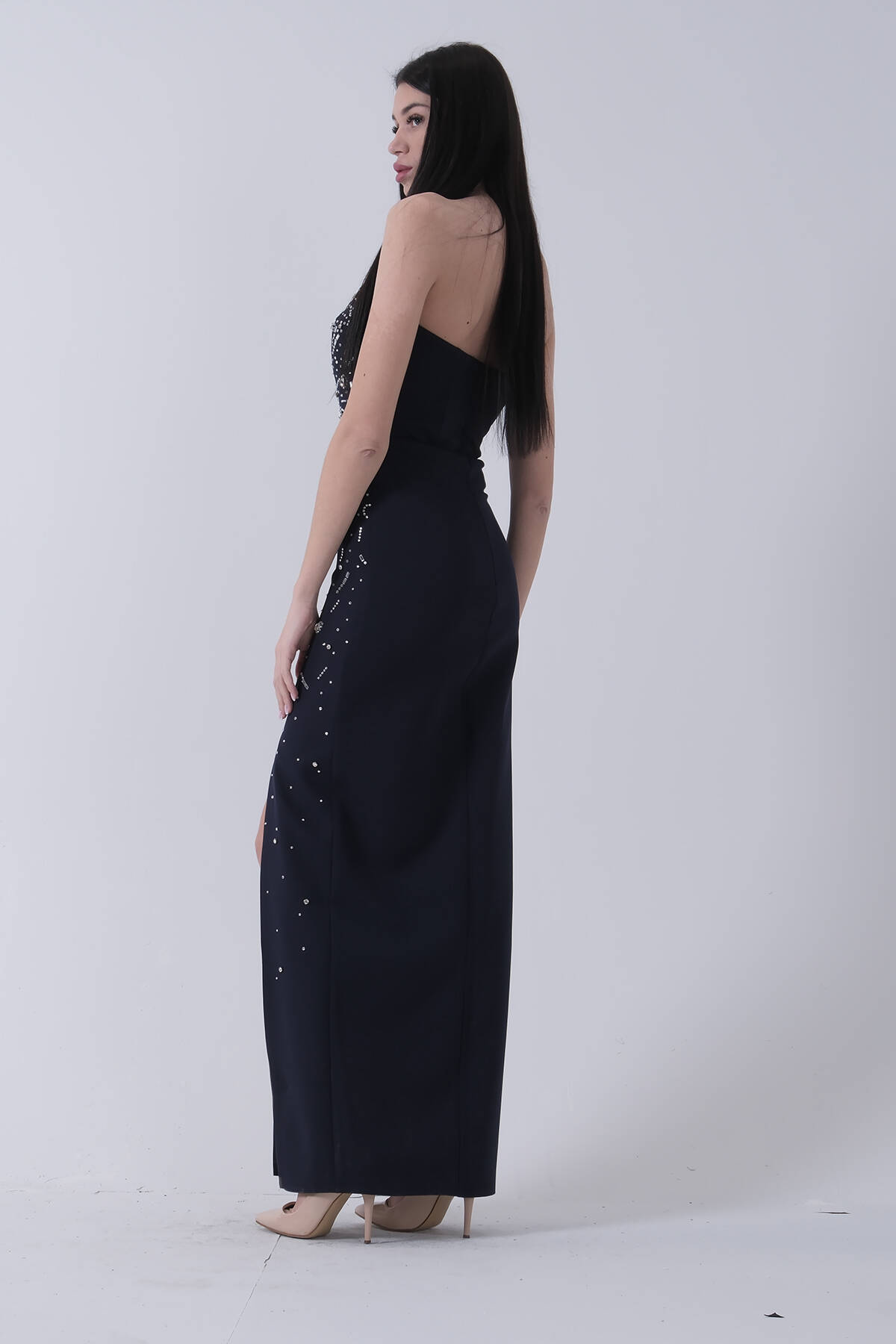 Lacivert Taş İşlemeli Straplez Yırtmaçlı Abiye 0801045.02