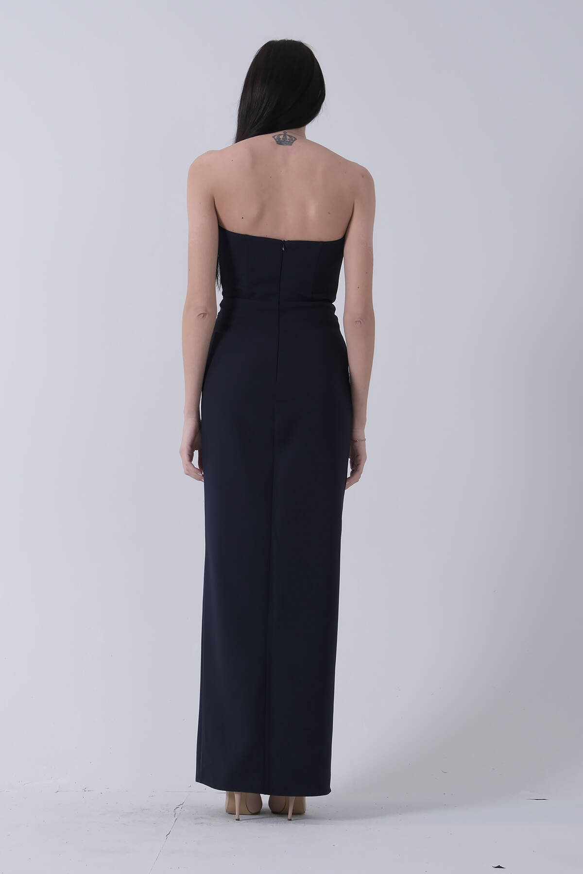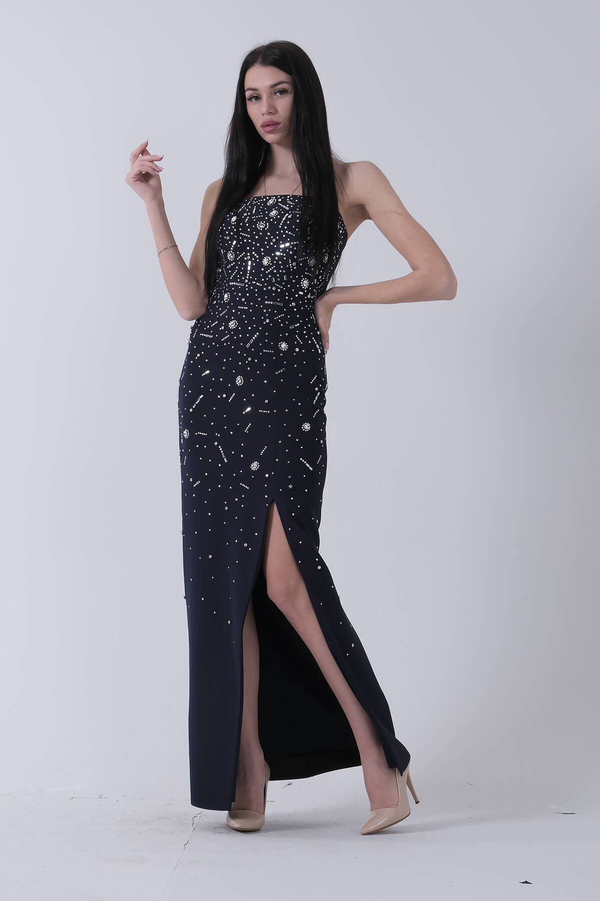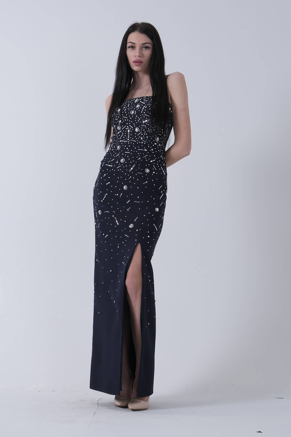 Lacivert Taş İşlemeli Straplez Yırtmaçlı Abiye 0801045.02