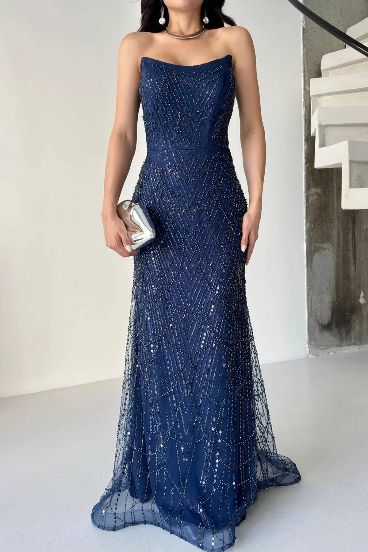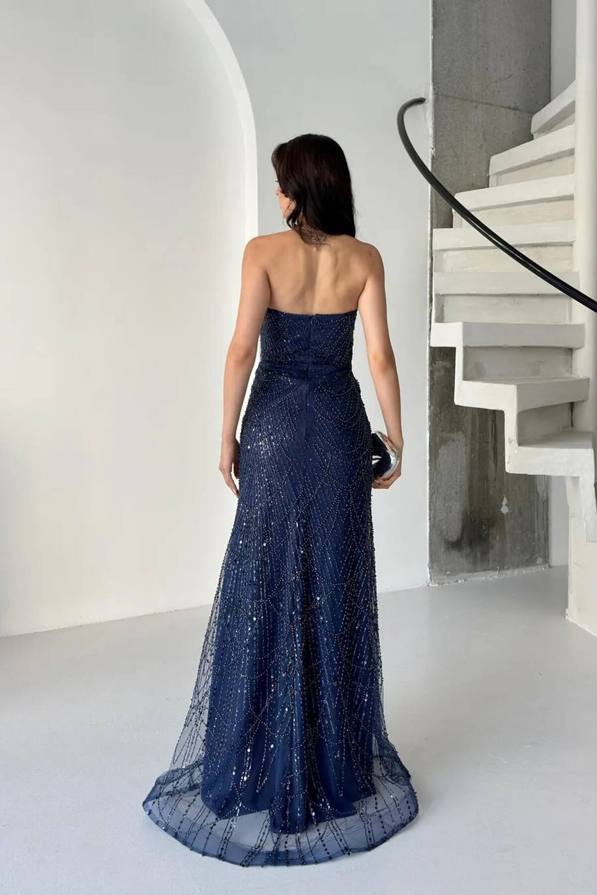 Lacivert Taş İşlemeli Uzun Balık Abiye 0801056.02