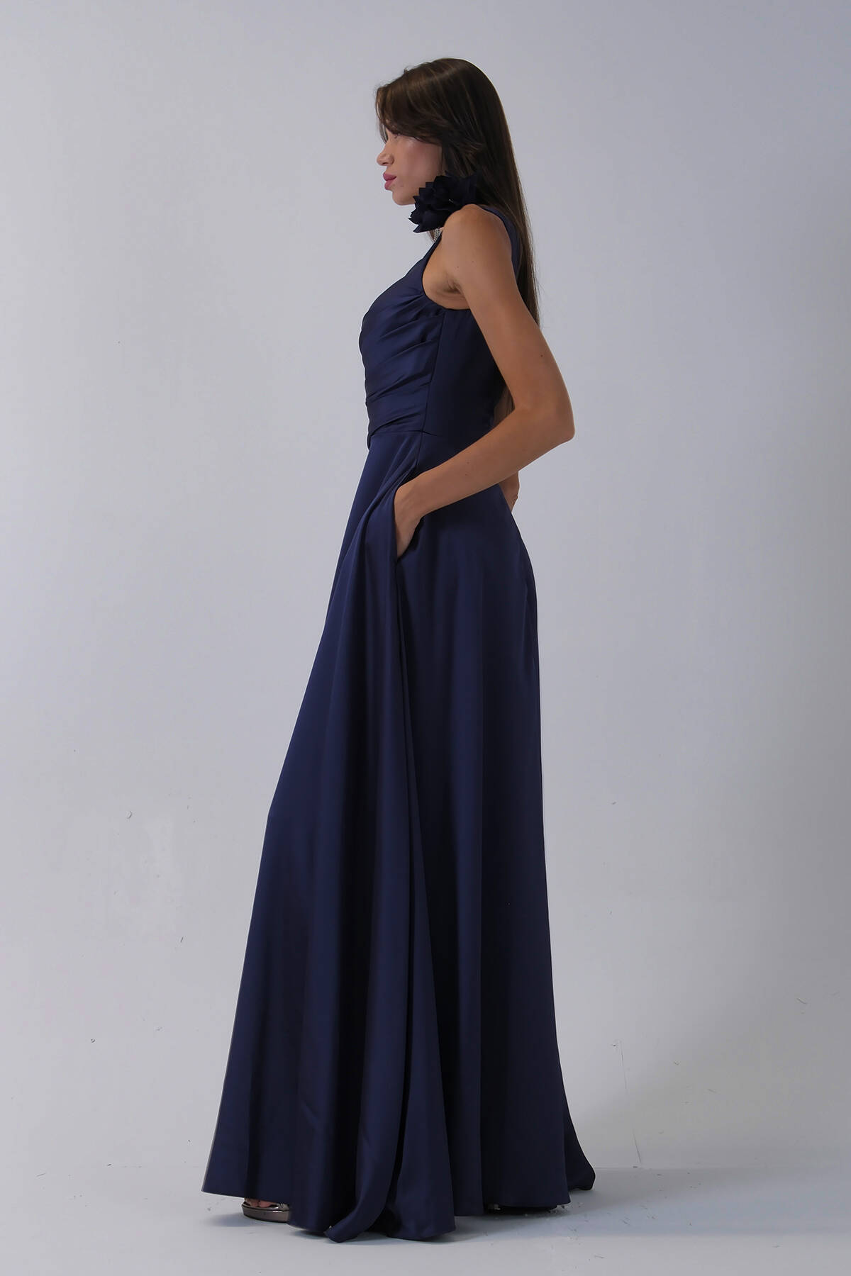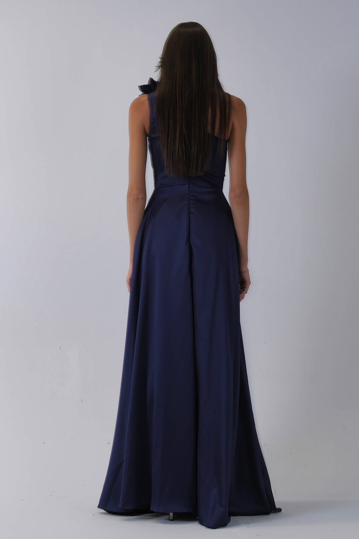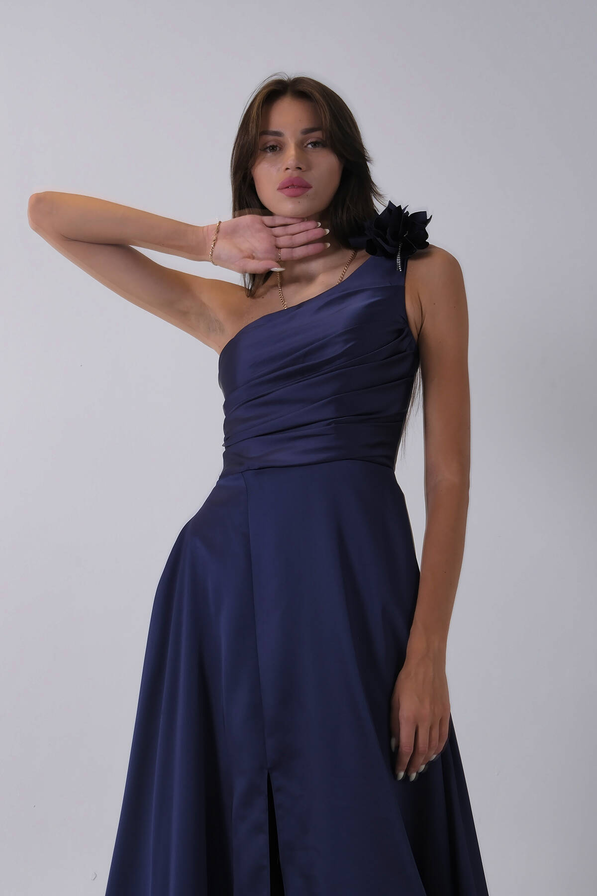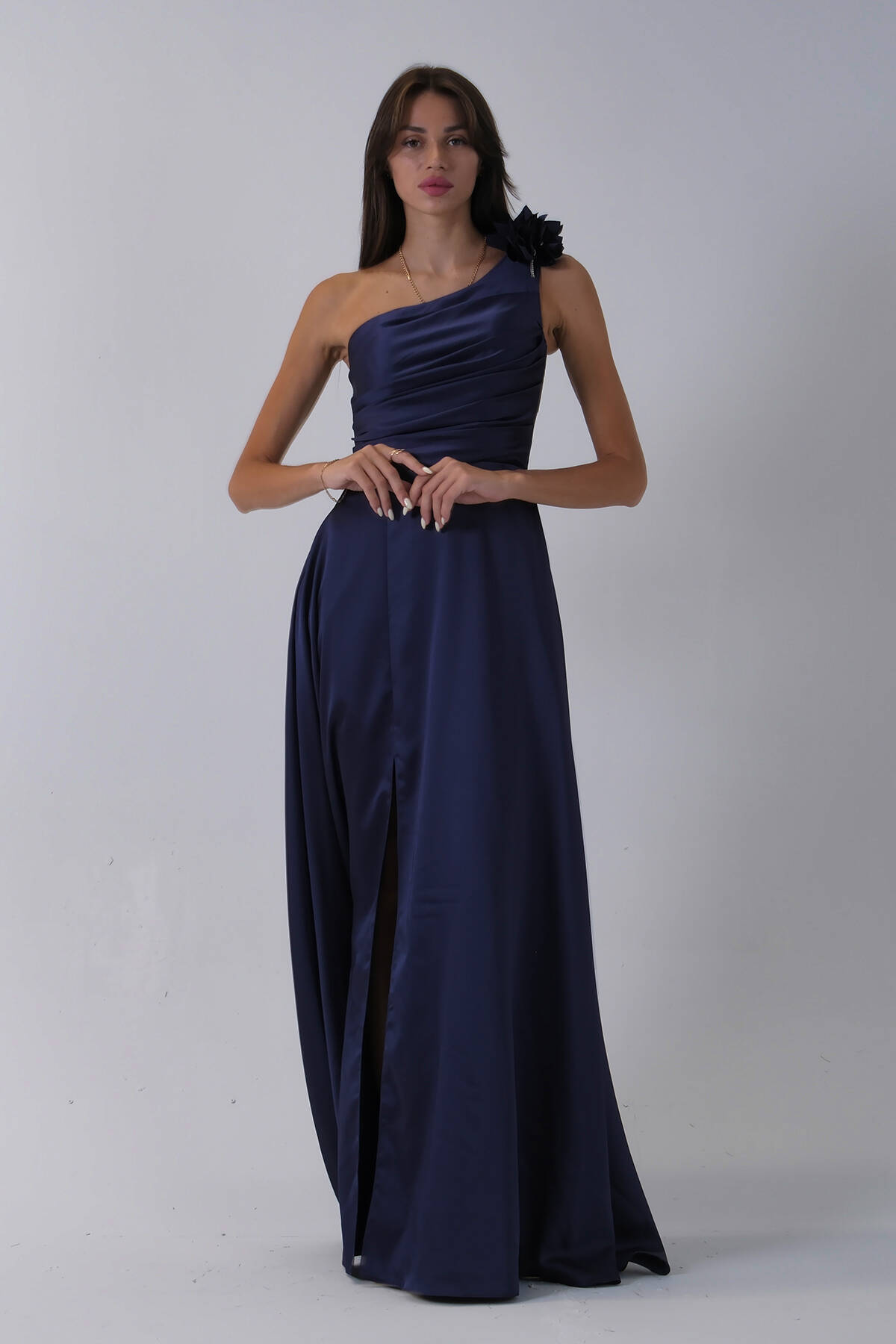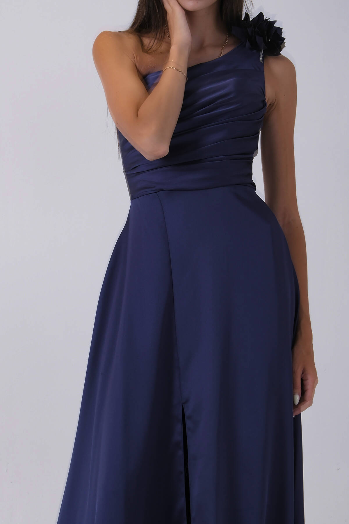 Lacivert Tek Omuz Çiçek Detaylı Saten Yırtmaçlı Abiye 0801041.02