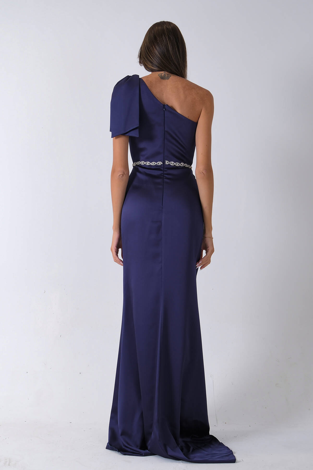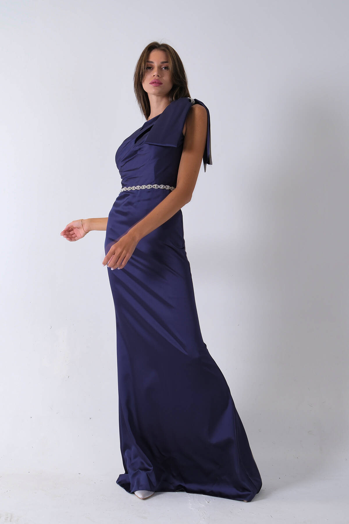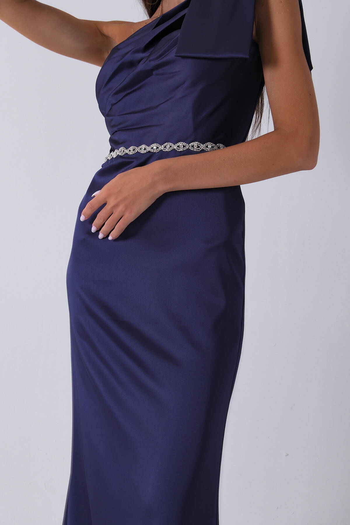 Lacivert Tek Omuz Drapeli Taş Detaylı Abiye 0801009.02
